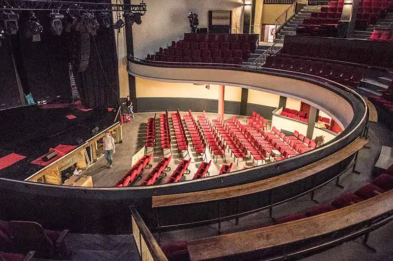 Das Ergbnis war interessant: In den ersten Jahren des 1927 erbauten Capitols war alles in einer ockergelben Farbton gestrichen. Erst Anfang der 1930er Jahre wurden rote und blaue Farbtöne hinzugefügt. Und genau an diese Farbkompositionen wollte man sich bei der Renovierung orientieren. Darüber hinaus werden Monitore, Bilderrahmen und Werbeständer nicht mehr in der bekannter Art und Weise mehr vorhanden sein „Wir wollen, dass das Haus seinen eigenen Charme und Charakter den Gästen näherbringt. Auch bekamen die Pressevertreter Einlick Backstage, also hinter die Bühne. Das war eher unspektakulär. In einem Raum, der unmittelbat hinter der Bühne ist, sind zwei Schminkplätze mit entsprechenden Spiegeln, eine Couch und ein Kühlschrank. „Hier mussten wir den knatternden alten Kühlschrank ersetzen, denn die Künstler fanden hier nicht wirklich ihre Ruhe zur Entspannung“, so Thorsten Riehle.