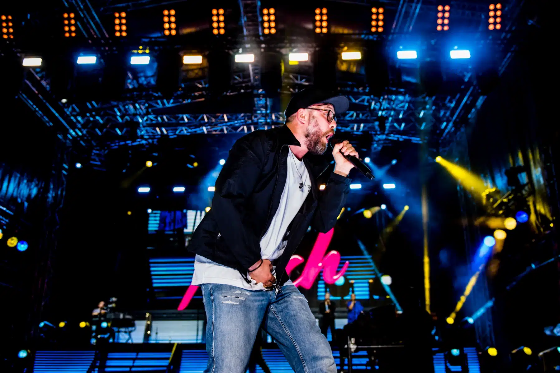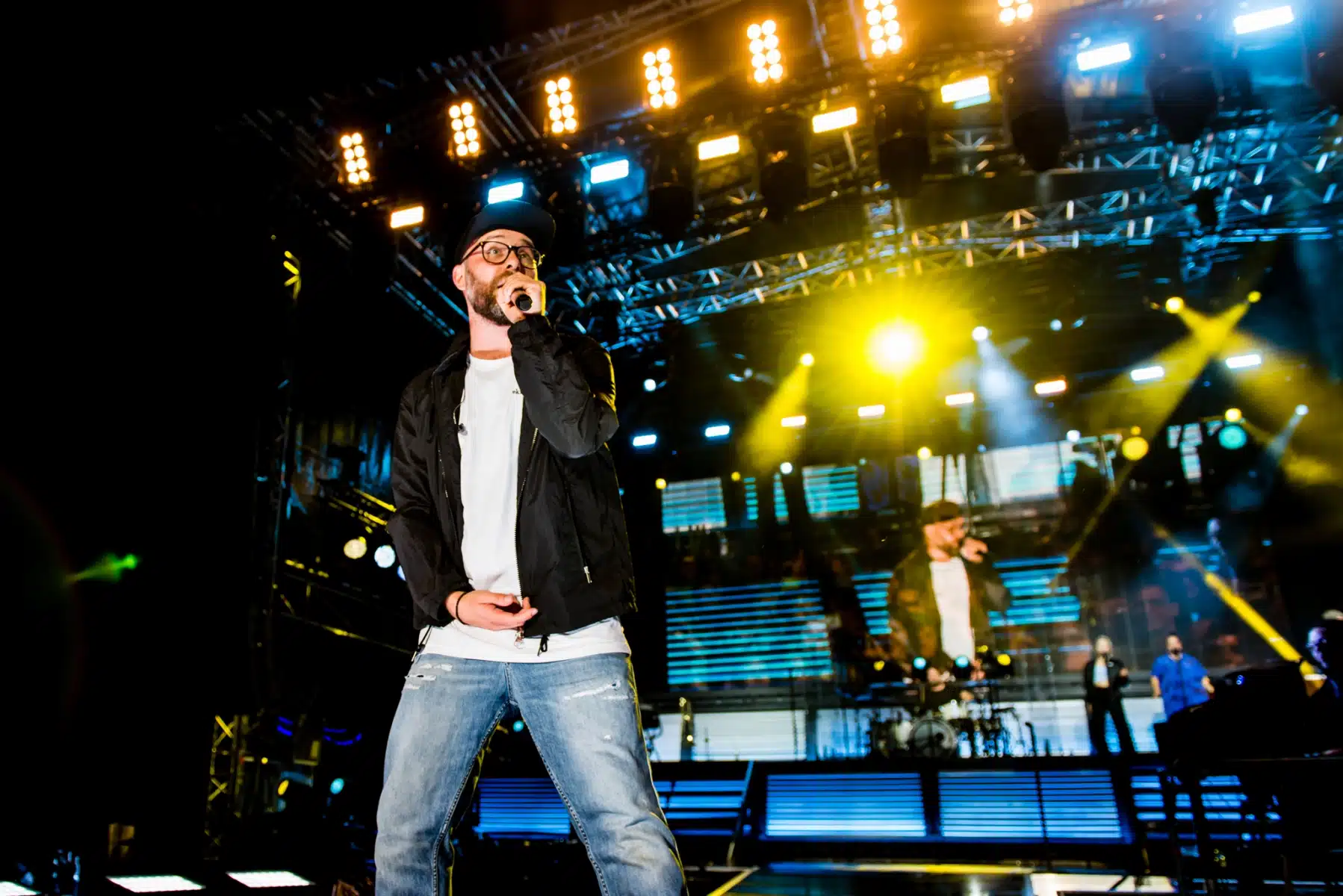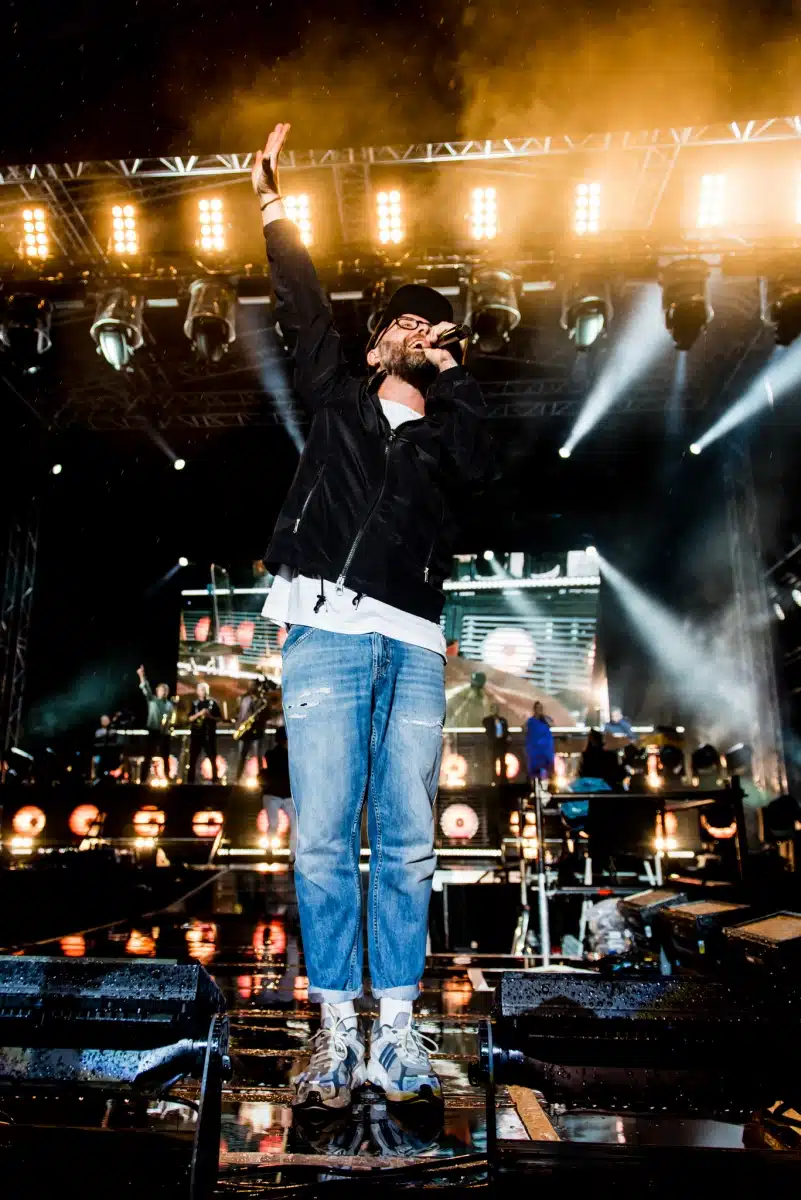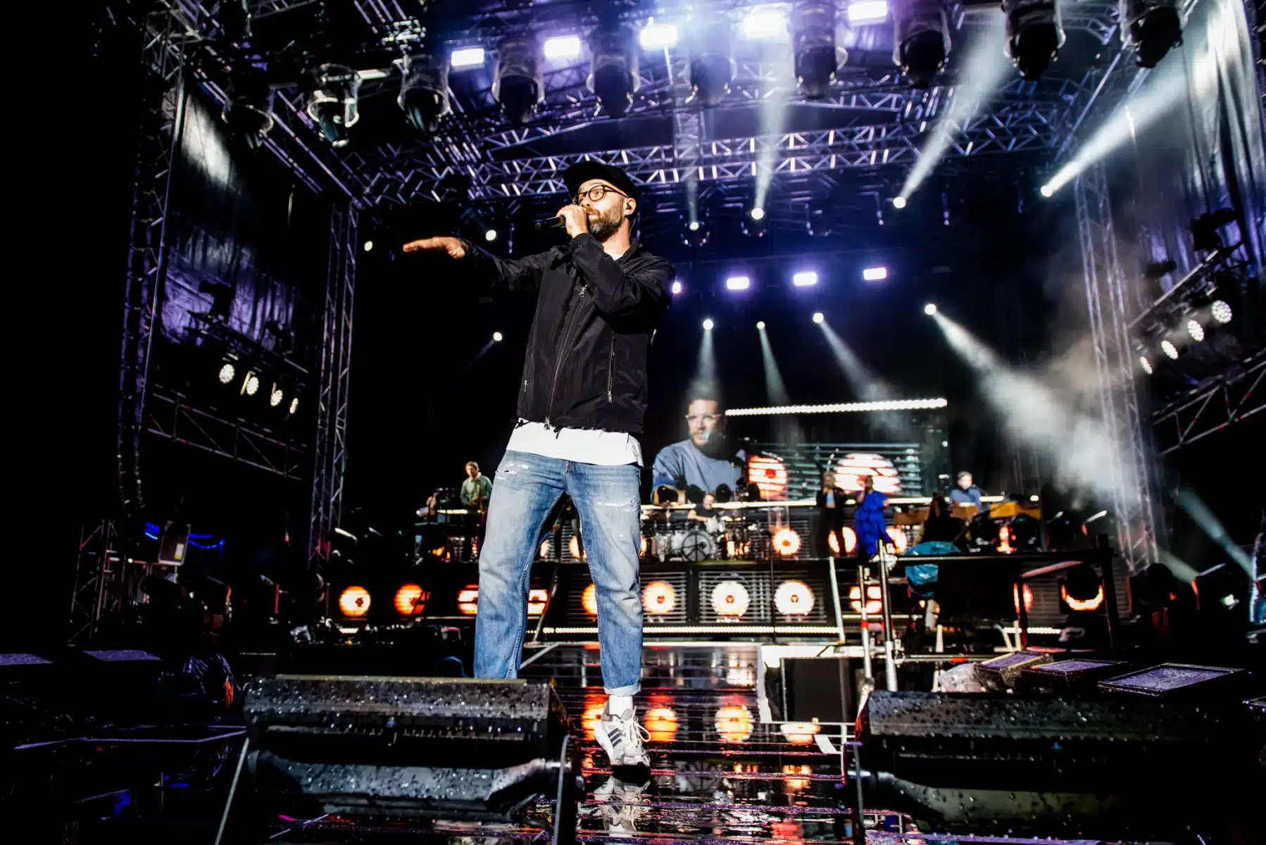 Der deutsche Pop-Sänger Mark Forster begeisterte am Samstag Abend in Aschaffenburg beim Open-Air Konzert auf dem Volksfestplatz 10.000 Menschen. Die Zuschauer mussten leider witterungsbedingt lange Zeit im starken Regen ausharren. Kurz nach Konzertbeginn wurde der Regen weniger und hörte zum Glück schließlich ganz auf. Mark begrüßte seine Fans passend zu dem Regenwetter mit den Worten: „2,5 Jahre mussten wir auf dieses Konzert warten, da lassen wir uns von bisschen Regen doch nicht aufhalten.“ . Genau so war es dann auch, alle waren total happy und feierten mit dem sympathischen Musiker von der ersten Sekunde an eine Riesenparty. Mark Forster wurde während seinem Konzert von seiner zehnköpfigen Band, die er liebevoll „Orchesterchen“ nennt, tatkräftig unterstützt. „Das ist die intelligenteste, hübscheste und beste Band der Welt“, rief Forster und stellte jedes Bandmitglied einzeln vor.