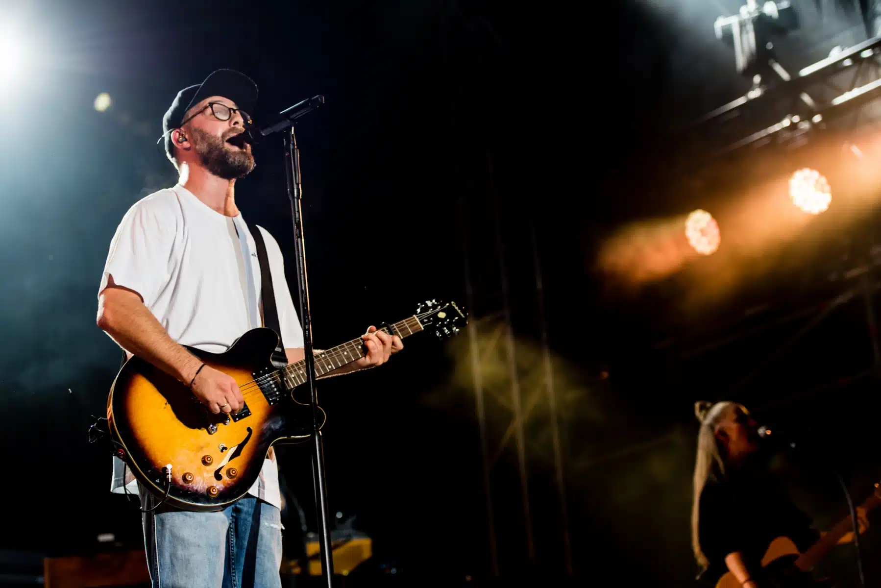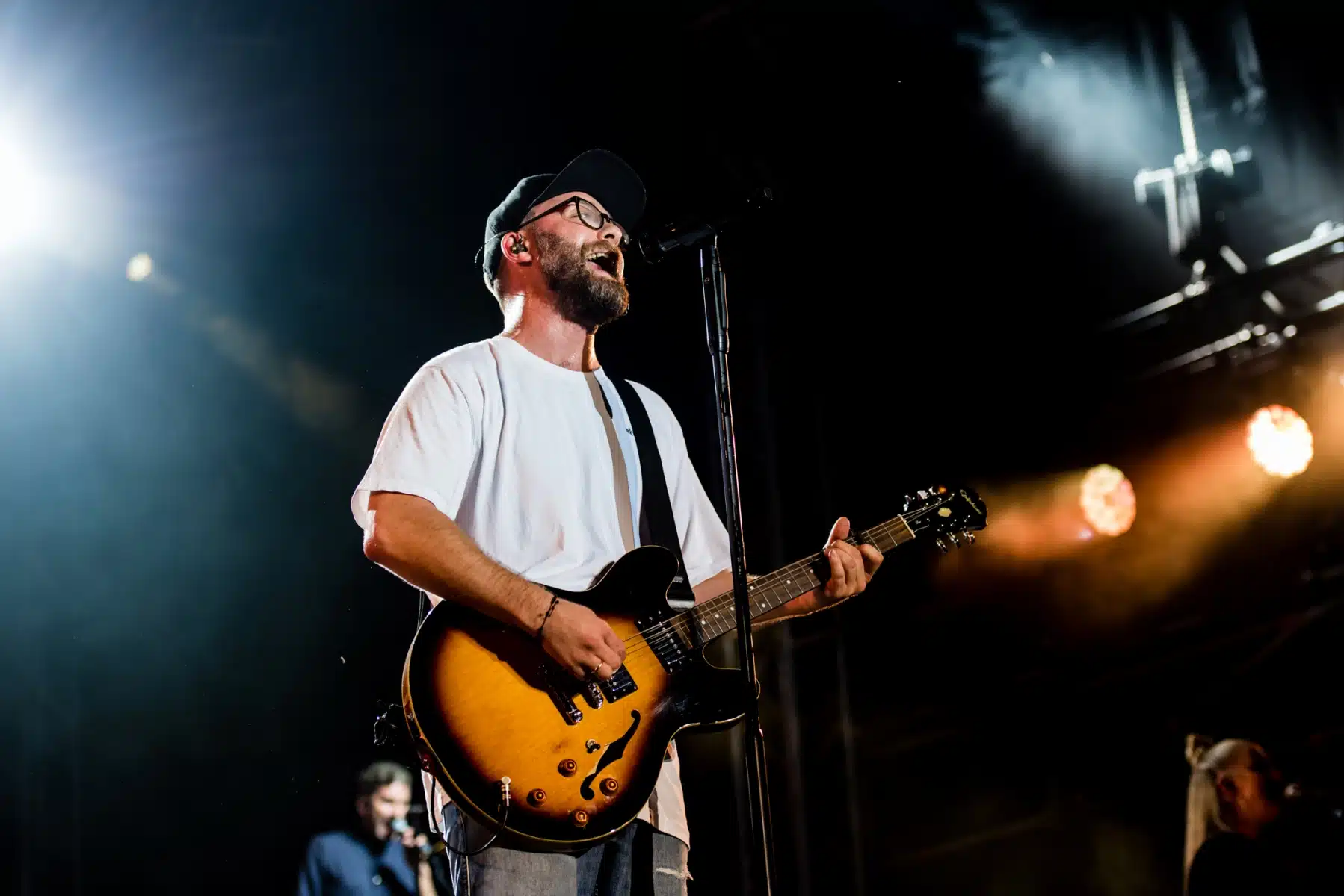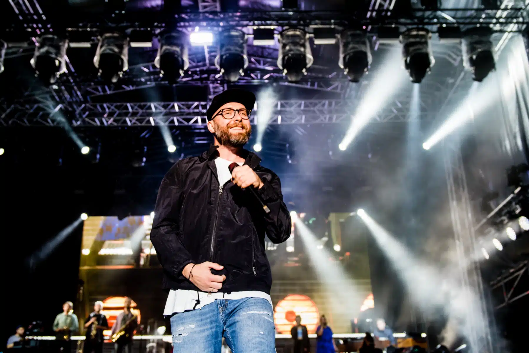 Der deutsche Pop-Sänger Mark Forster begeisterte am Samstag Abend in Aschaffenburg beim Open-Air Konzert auf dem Volksfestplatz 10.000 Menschen. Die Zuschauer mussten leider witterungsbedingt lange Zeit im starken Regen ausharren. Kurz nach Konzertbeginn wurde der Regen weniger und hörte zum Glück schließlich ganz auf. Mark begrüßte seine Fans passend zu dem Regenwetter mit den Worten: „2,5 Jahre mussten wir auf dieses Konzert warten, da lassen wir uns von bisschen Regen doch nicht aufhalten.“ . Genau so war es dann auch, alle waren total happy und feierten mit dem sympathischen Musiker von der ersten Sekunde an eine Riesenparty. Mark Forster wurde während seinem Konzert von seiner zehnköpfigen Band, die er liebevoll „Orchesterchen“ nennt, tatkräftig unterstützt. „Das ist die intelligenteste, hübscheste und beste Band der Welt“, rief Forster und stellte jedes Bandmitglied einzeln vor.