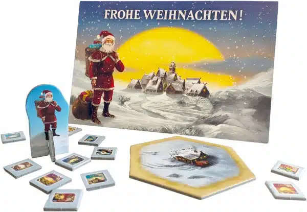 Inhalt: 1 Umschlag, 1 Klapp-Weihnachtskarte, 1 Landfeld „Haus des Weihnachtsmanns“, 11 Geschenk-Chips, 1 Weihnachtsmann-Aufsteller, Spielanleitung