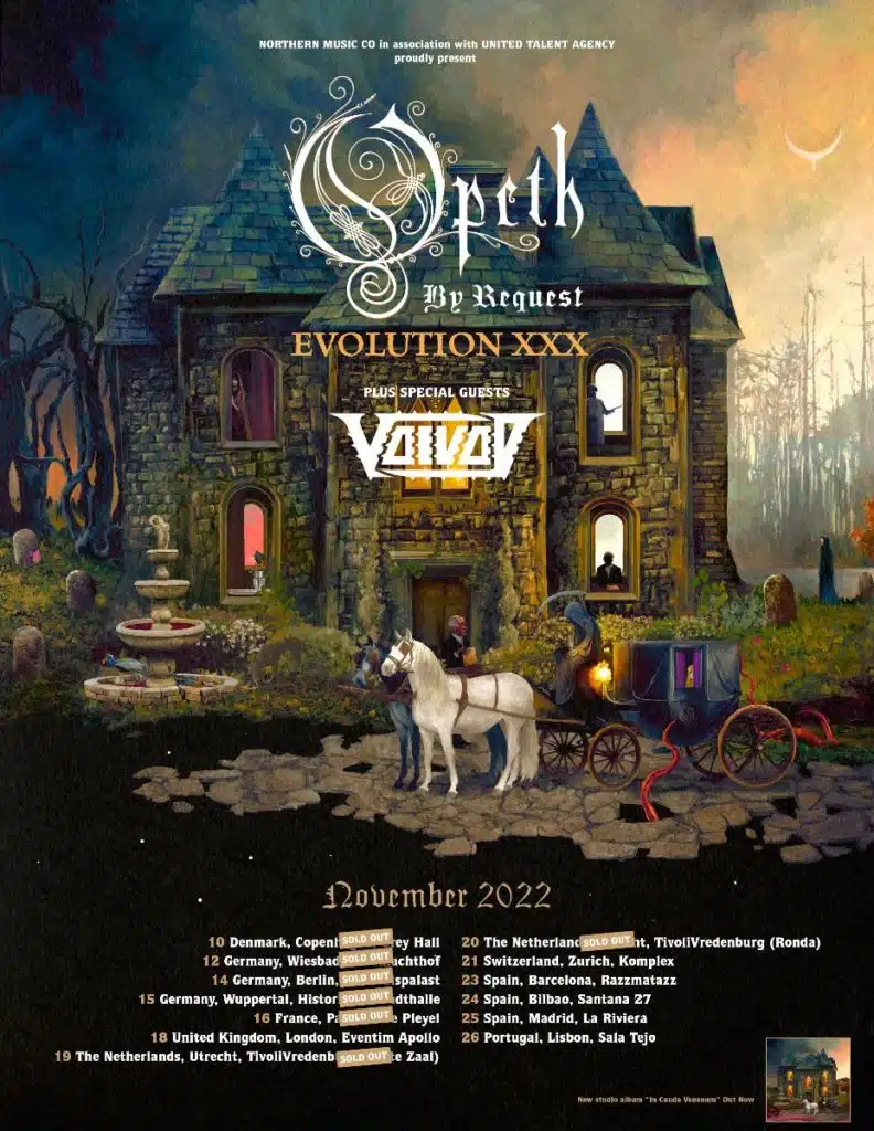 Nachdem sie auf ihrer osteuropäischen Tour mit THE VINTAGE CARAVAN im September ihren neuen Schlagzeuger Waltteri Väyrynen (ex-PARADISE LOST) vorgestellt haben, begeben sich die schwedischen Prog-Rock/Metal-Legenden OPETH heute auf ihre langersehnte »Opeth By Request – Evolution XXX«-Europatour. Ergänzt wird das Tourpaket dabei durch die kanadischen Kultmetaller von VOIVOD. Mit von ihren Fans gewählten Songs bestückt, wird die Setlist der Band dieses Mal durch alle ihre Alben führen, weshalb man sich diese einzigartigen Abende mit OPETH nicht entgehen lassen und erst recht nicht beim Ticketkauf zögern sollte, sind einige Shows doch bereits ausverkauft, während für einige andere ebenfalls nur noch wenige Karten verfügbar sind.