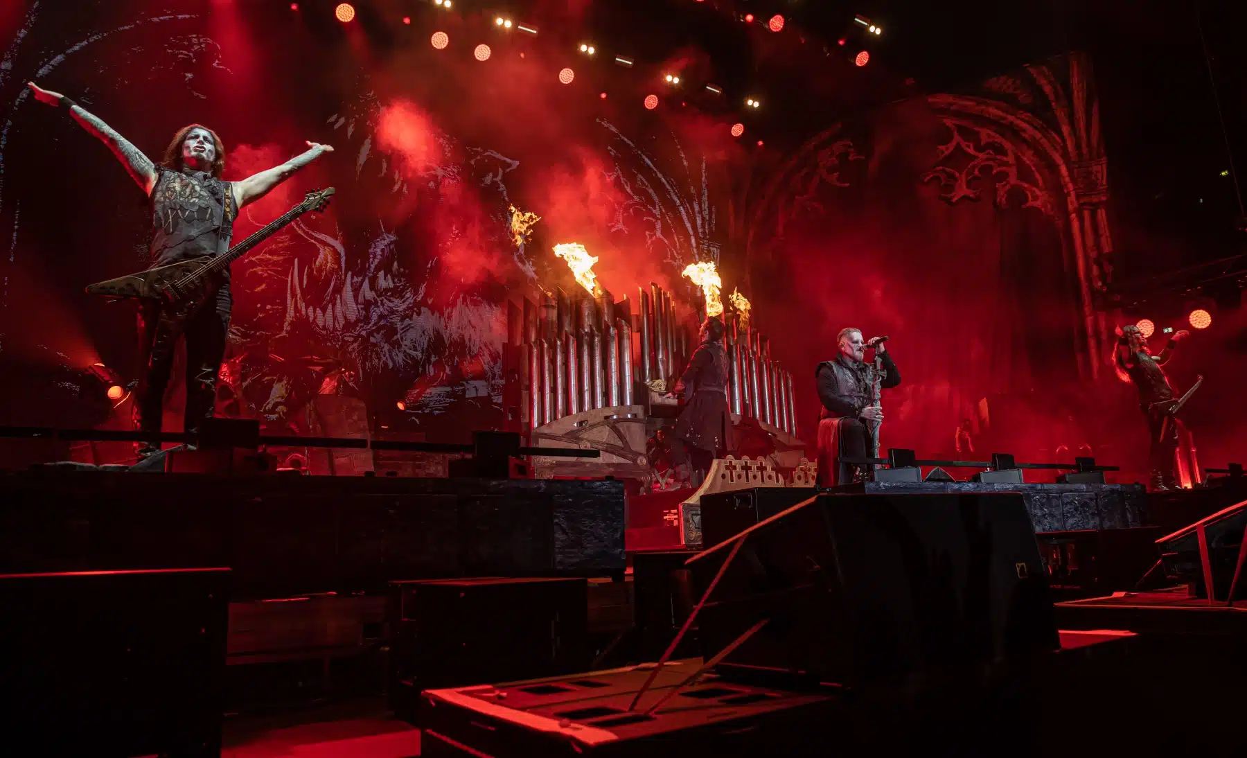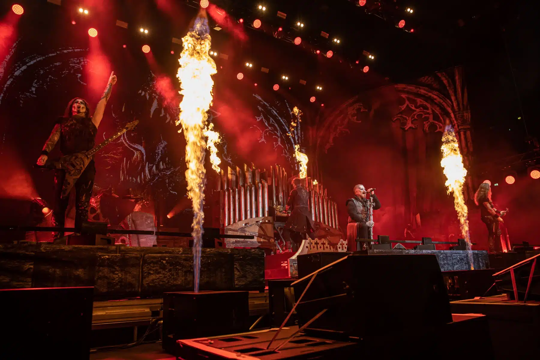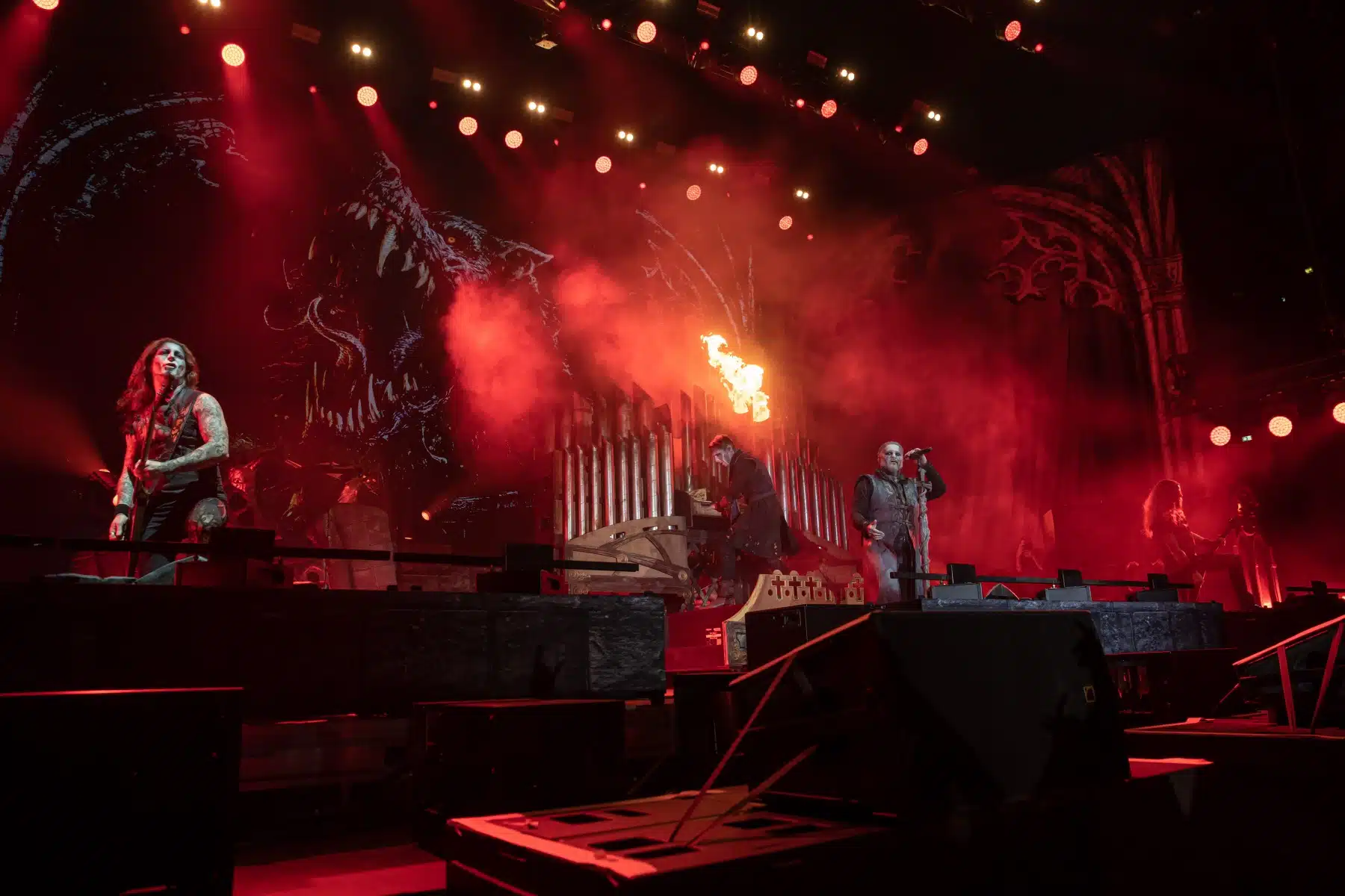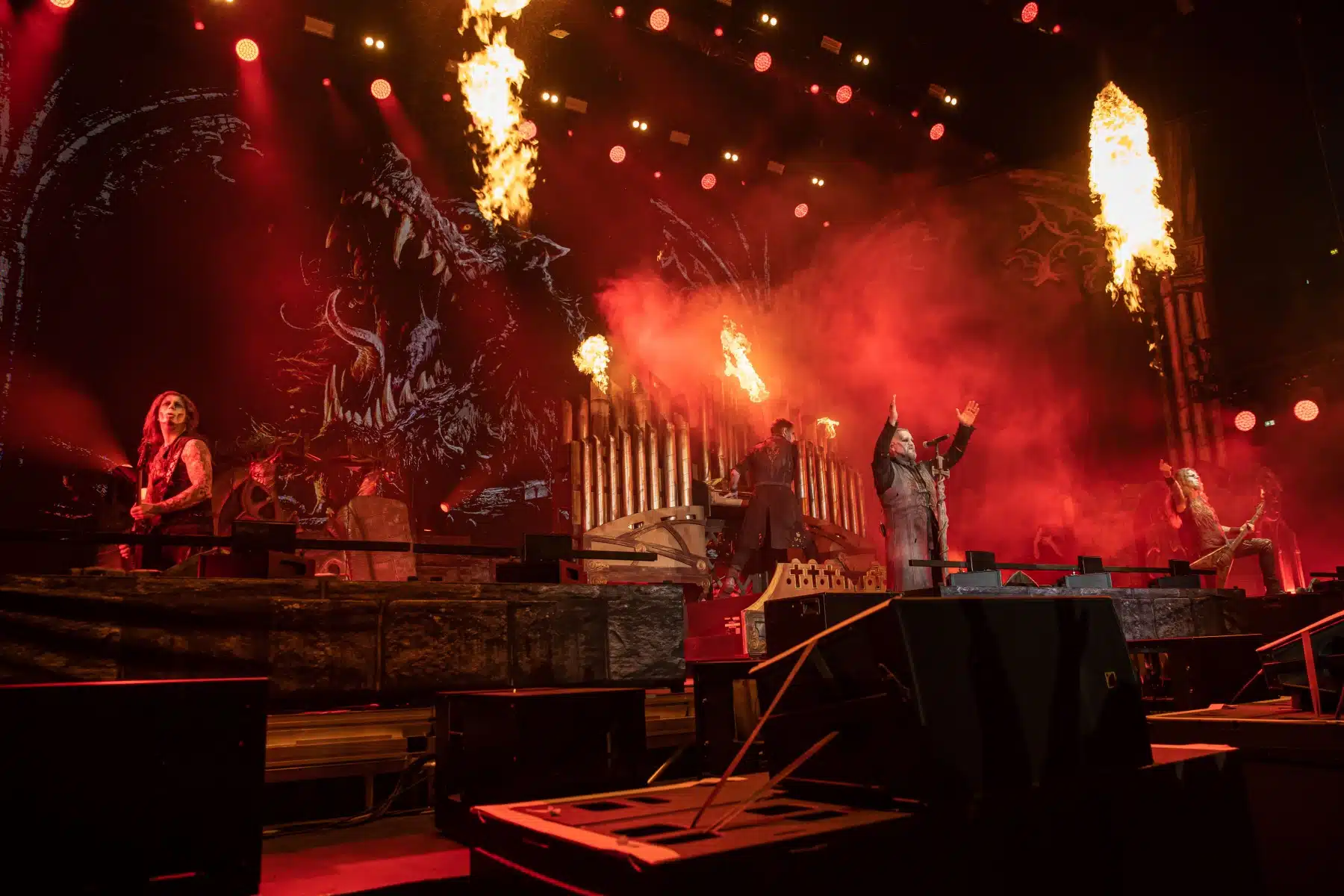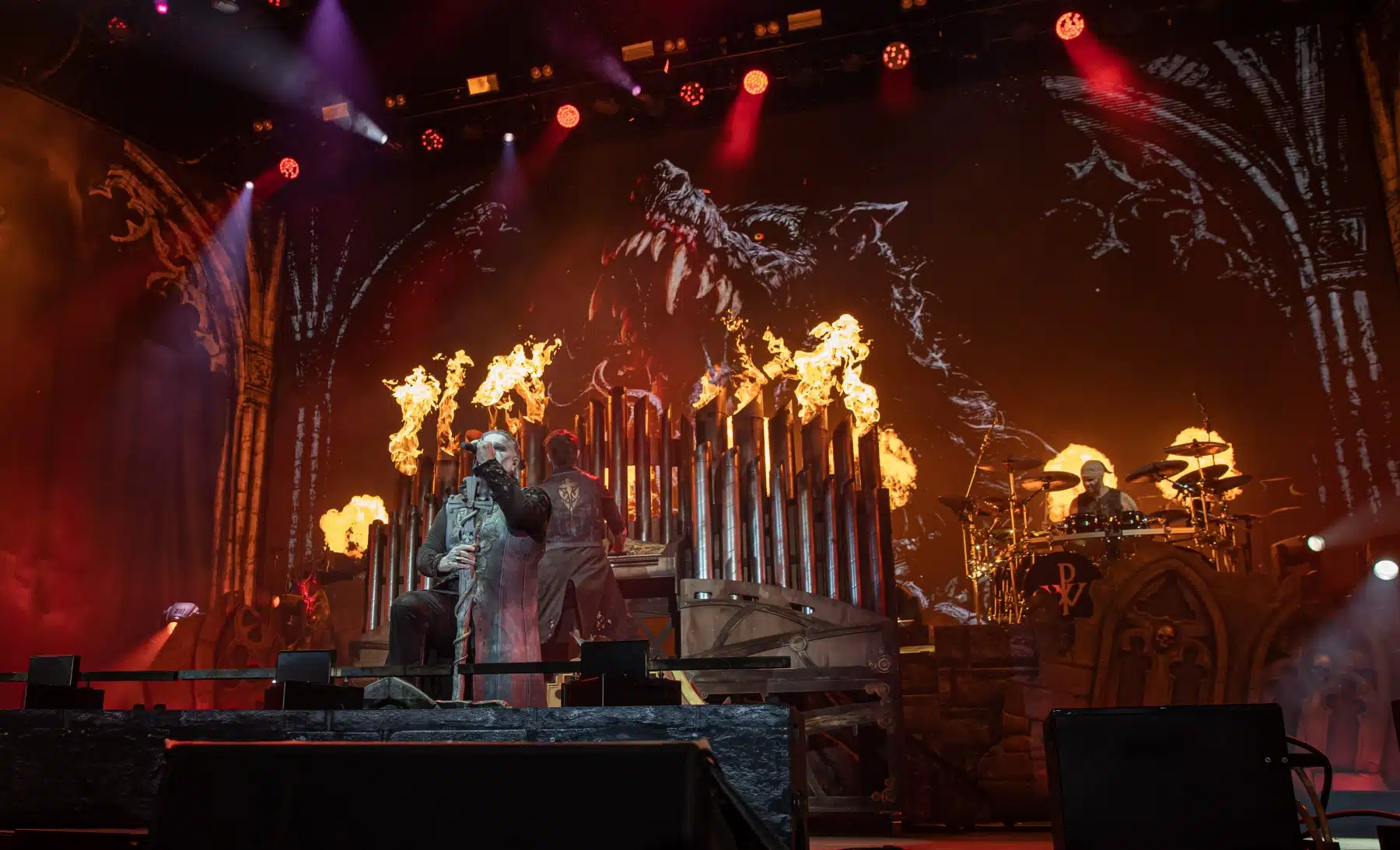 Nach einer letzten Umbaupause war es dann soweit, die Heilige Metal Messe, so bezeichnen Powerwolf ihre Konzerte, wurde gebührend eröffnet. Bereits beim ersten Song ging es heiß her, „Faster than a flame“ war hier kein einfach hin gesungener Text ohne Bedeutung. Feuer ist ein wichtiger Bestandteil der Show, man kann sich kaum noch vorstellen ein Konzert der Band ohne Pyrotechnik erleben zu können. Ihre Setlist beinhaltete Titel aus allen Epochen der Bandkarriere, Frontmann Attila Dorn erzählte immer wieder Geschichten zu den Songs, passend im transsylvanischen Dialekt.