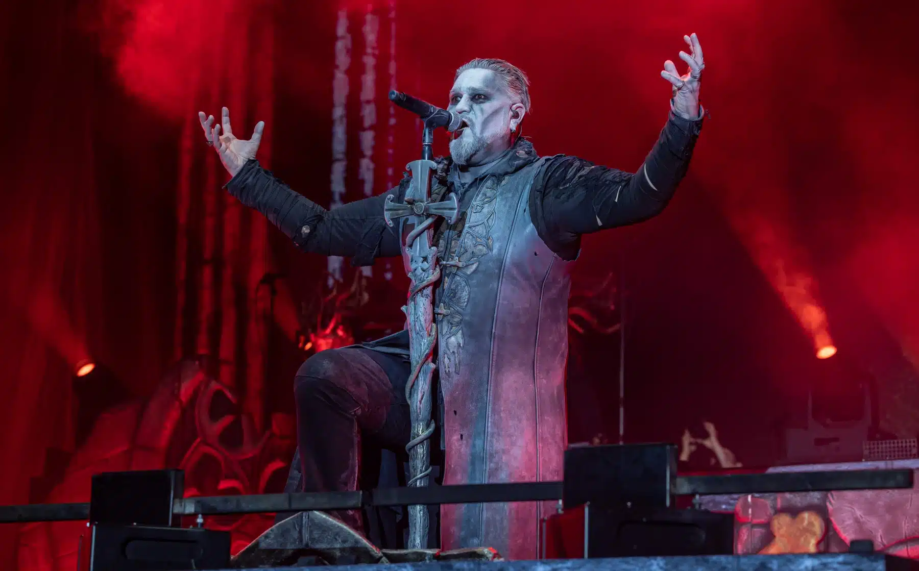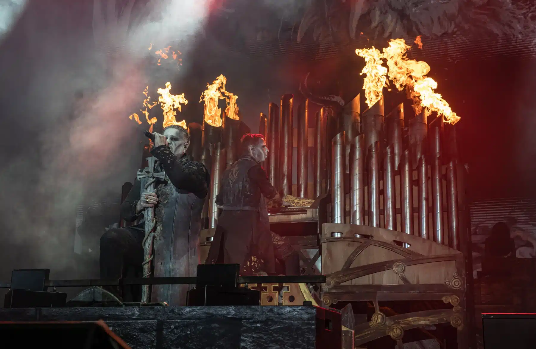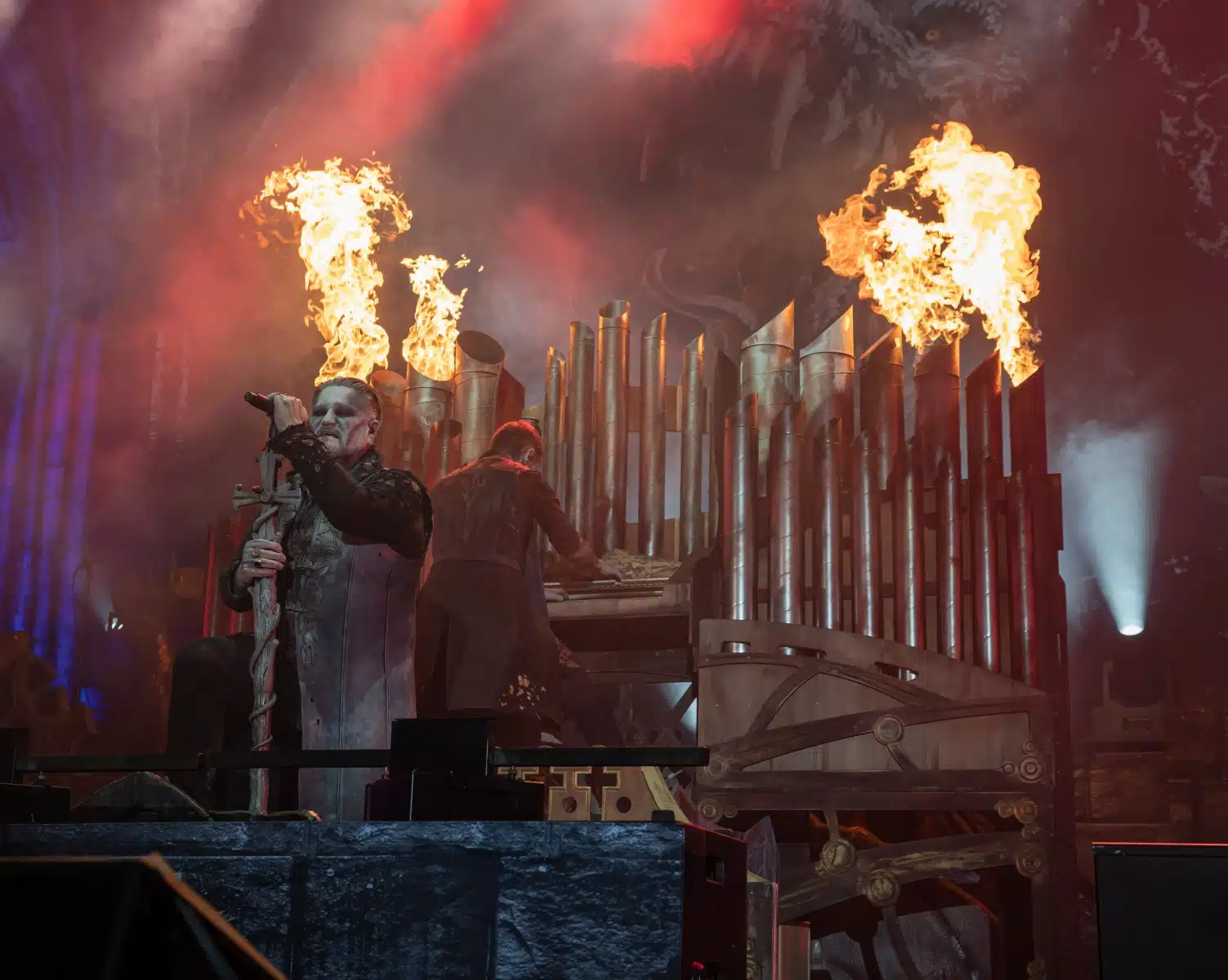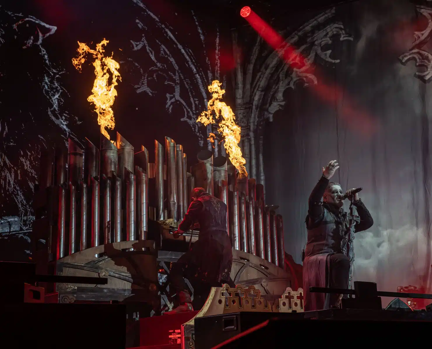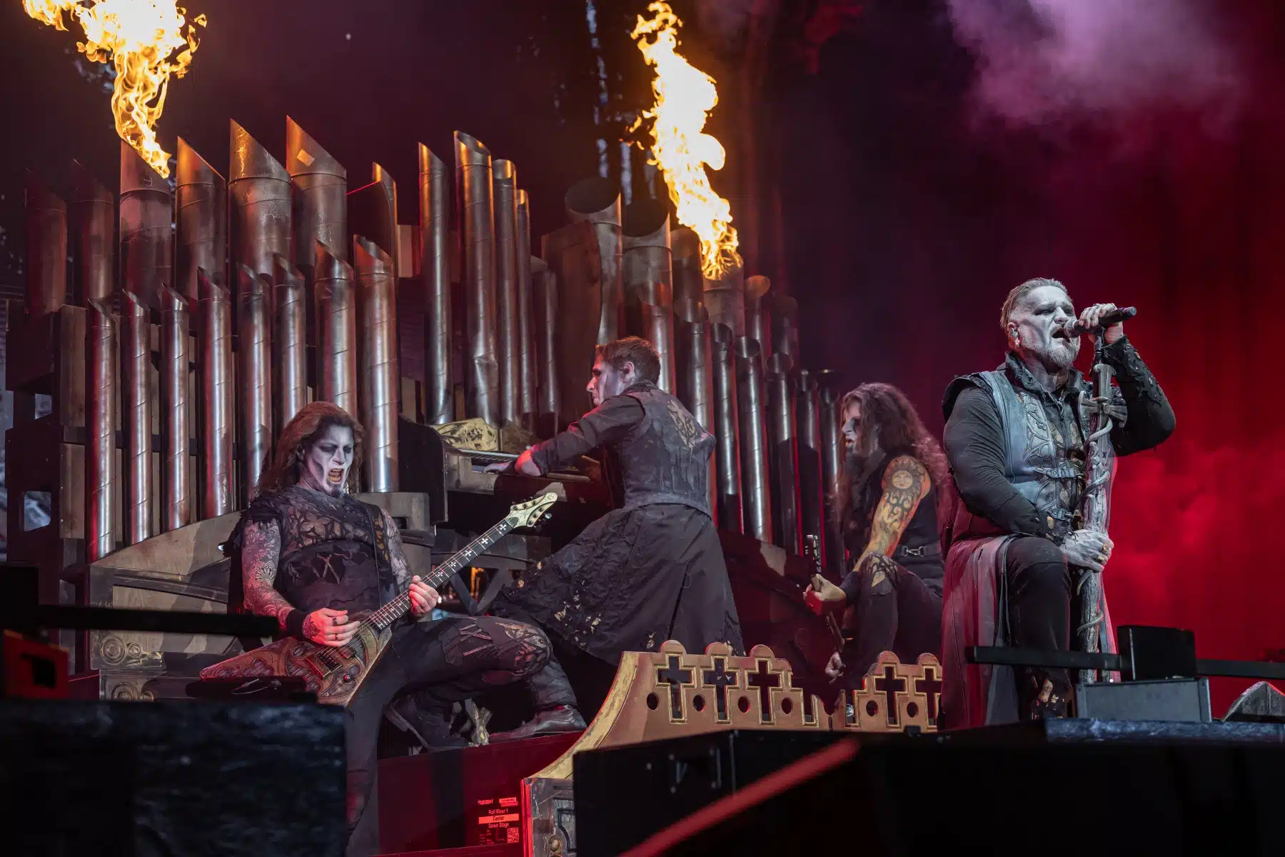 Nach einer letzten Umbaupause war es dann soweit, die Heilige Metal Messe, so bezeichnen Powerwolf ihre Konzerte, wurde gebührend eröffnet. Bereits beim ersten Song ging es heiß her, „Faster than a flame“ war hier kein einfach hin gesungener Text ohne Bedeutung. Feuer ist ein wichtiger Bestandteil der Show, man kann sich kaum noch vorstellen ein Konzert der Band ohne Pyrotechnik erleben zu können. Ihre Setlist beinhaltete Titel aus allen Epochen der Bandkarriere, Frontmann Attila Dorn erzählte immer wieder Geschichten zu den Songs, passend im transsylvanischen Dialekt.