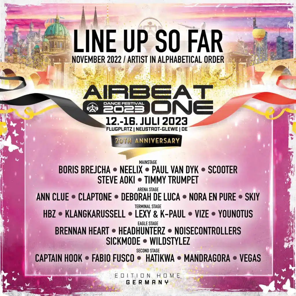 Ein fulminantes 20-jähriges Jubiläum des AIRBEAT ONE Festivals mit 300 der besten DJs und Acts steht vom 12. bis 16. Juli 2023 an. Das viertägige Open Air-Event auf dem Flugplatz Neustadt-Glewe in Mecklenburg-Vorpommern trägt das Motto „Edition Home – Germany” und wird zu einem bombastischen Schauplatz einer bahnbrechenden Veranstaltungsproduktion. Die AIRBEAT ONE ist längst zu einem Global Player geworden und spielt als Event weltweit ganz vorne mit. Jetzt verkünden die Macher des Festivals die ersten 25 Acts für das nächste Jahr und die haben es bereits in sich.