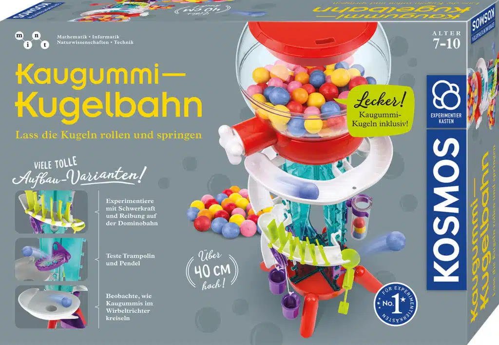 Leckere Action im Kinderzimmer! Kunterbunte Kaugummikugeln flitzen die Kugelbahn hinunter und machen coole Stunts. Wilde Sprünge aus dem Pendel und auf dem Trampolin, rasante Fahrten durch Kipprohr und Wirbeltrichter – Kinder von 7-12 Jahren bauen aus den Teilen eine unterschiedliche Rennstrecken. Hier ist tüfteln angesagt! Die Anleitung erklärt, wie die 12 Bahnelemente zusammengesteckt und immer neu kombiniert werden. Jedes Bahnteil ist ein spannendes Mechanik-Experiment das Kugelbahn-Fans physikalische Grundbegriffe wie Schwerkraft und Masse praktisch erklärt. Dieser Experimentierkasten von KOSMOS ist einfach genial – perfekt für TüftlerInnen und kleine Naschkatzen!