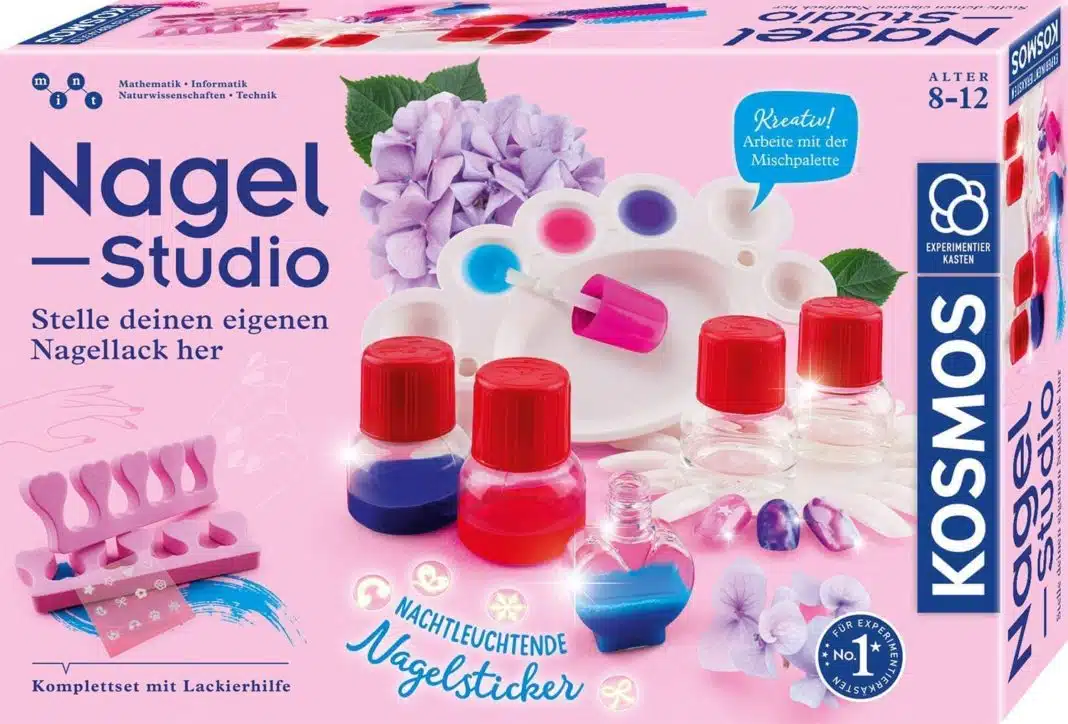 Wie bei den Profis können kreative Muster erst auf dem Nagelrondell geübt werden, und die schönsten werden auf die eigenen Fingernägel übertragen. Oder doch lieber die Zehennägel verschönern? Mit dem praktischen Zehenspreizer kein Problem. Zu echten Hinguckern werden die Nägel spätestens mit den nachtleuchtenden Nagel-Stickern! Mit diesem KOSMOS Experimentierset toben sich Kinder zwischen 8 und 12 Jahren kreativ aus, erfahren spannende Hintergründe zur Kosmetik und Nagelpflege und können auch Freunde und Familie in ihr neu eröffnetes Nagel-Studio einladen.