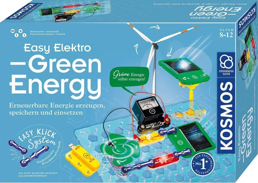 Erneuerbare Energien werden greifbar mit diesem Elektronik-Bausatz von KOSMOS. Über 80 Versuche zu Schaltkreisen mit fantastischen neuen Teilen des Easy-Druckknopfsystems: durch Windrad, Solarpanel oder Handkurbel wird Ökostrom ganz einfach selbst erzeugt. Die aufladbare Batterie speichert den Strom, sodass er auch später noch genutzt werden kann. Mit einem Messgerät sehen Kinder von 8 bis 12 Jahren genau, wie viel Strom gerade durch die Schaltkreise fließt.