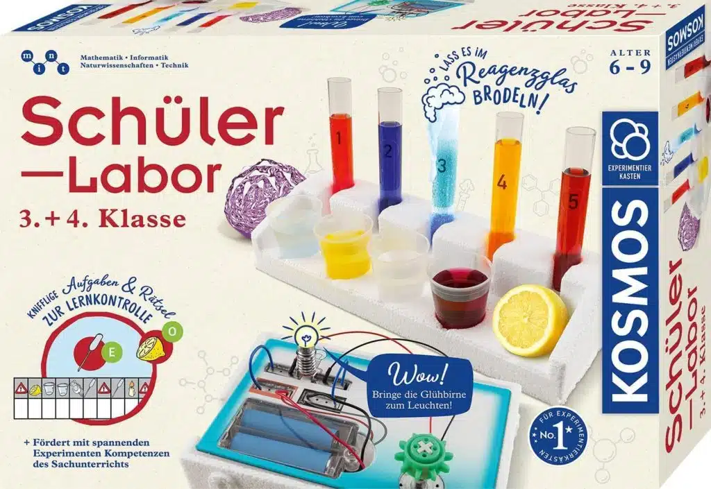 Inhalt: Reagenzgläser und Stopfen, Messbecher, pH-Teststreifen, Pipetten, Pinzette, Glühlämpchen, Kunststoffrohr, Filztuch, Steckfedern, Batteriefach, Kabel, Elektromotor, Taster, LED, Achse, Zahnrad, Schnur, Knete und vieles mehr, farbig illustrierte Anleitung