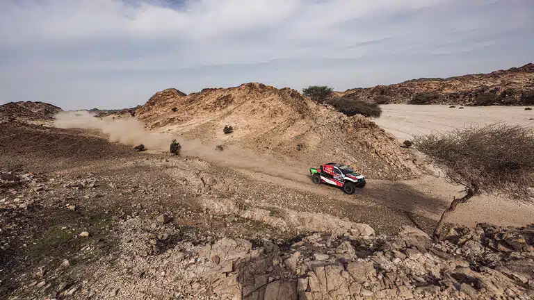 Geröll, Passagen im WRC-Style, schmale Pässe und Wadis bestimmt das anfängliche Programm des zweiten Wettbewerbstags der Rallye Dakar 2023. Auf dem Weg nach al-‚Ula öffnete sich später allerdings das Gelände, mehr Tempo und sandige Abschnitte sowie Wadis folgten, ehe auf den letzten rund elf Kilometern noch kleinere Dünen auf der Agenda standen.