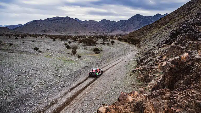 Beauty und Biest: Die dritte Wertungsprüfung der Rallye Dakar 2023 zwischen al-‚Ula und Ha’il bot nicht nur wunderschöne Landschaften, sondern auch jede Menge knifflige Navigation. Sandpisten zu Beginn, dazu etwas Off-Piste; es folgten eine offenere Landschaft mit schnellen Pfaden und viele, mal mehr, mal weniger offensichtliche Richtungswechsel. Auch die in diesen „Dakar“-Tagen üblichen Steine durften nicht fehlen. Aufgrund der sich verschlechternden Wetterbedingungen wurde die Wertungsprüfung bei Kilometer 377 gestoppt, um die Sicherheit aller Teilnehmer zu garantieren. Aufgrund der Witterung konnte der Helikopter der Rennärzte nicht fliegen.