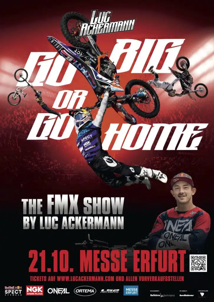 X Games Gold, FIM Weltmeister, Europameister, Red Bull Dirt Diggers Champion, X-Knights Sieger und neun Weltrekorde – Der Thüringer FMX-Sportler Luc Ackermann ist einer der weltbesten Freestyle Motocross Sportler und hat fast alles gewonnen, was es in seiner Sportart zu gewinnen gibt. Nach unzähligen Contests und Shows auf der ganzen Welt, hat er nun ein eigenes Show-Konzept entwickelt und feiert damit in Thüringen Premiere. GO BIG OR GO HOME heißt es am Samstag, dem 21. Oktober 2023 in der Messe Erfurt.