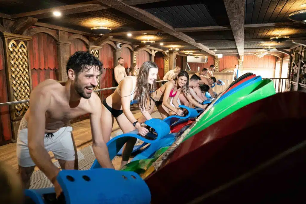Im neuen Bereich „Nordiskturn“ ist die auf einer funkelnden Edelsteinmine errichtete Rennrutsche „Vikingløp“ das absolute Highlight. Nachdem der 30 Meter hohe „Nordiskturn“ erklommen ist, stehen insgesamt acht Röhren zur Verfügung, auf denen wettkampflustige Konkurrenten miteinander um die Wette rutschen. Auf Matten geht es mit dem Kopf voraus hinab. Jede Sekunde zählt, denn nur einer kann im Zieleinlauf die Nase vorne haben und sich von den Zuschauern auf der Tribüne bejubeln lassen.Der Blick zur Konkurrenz ist während der Rutschpartie immer wieder möglich.
