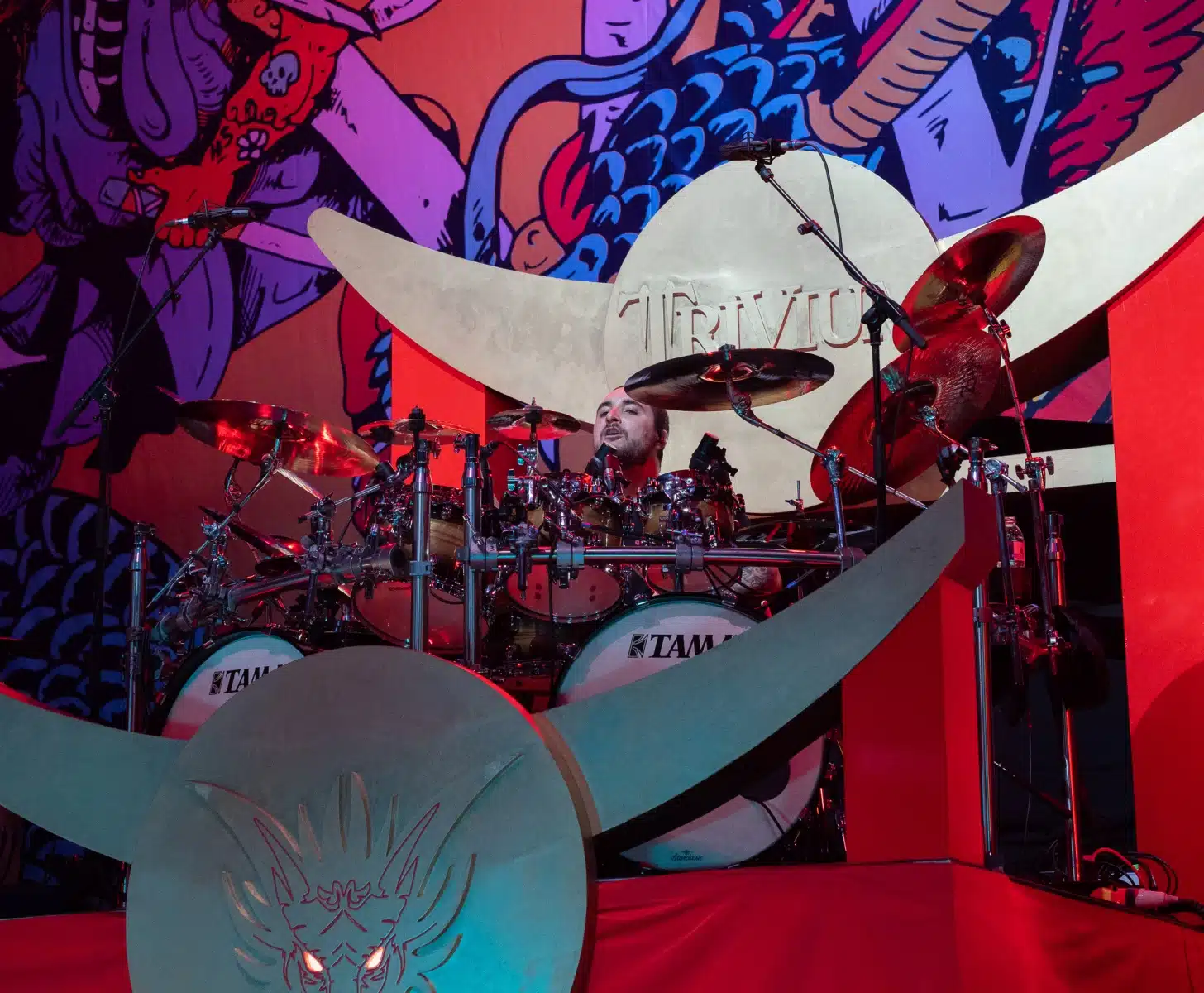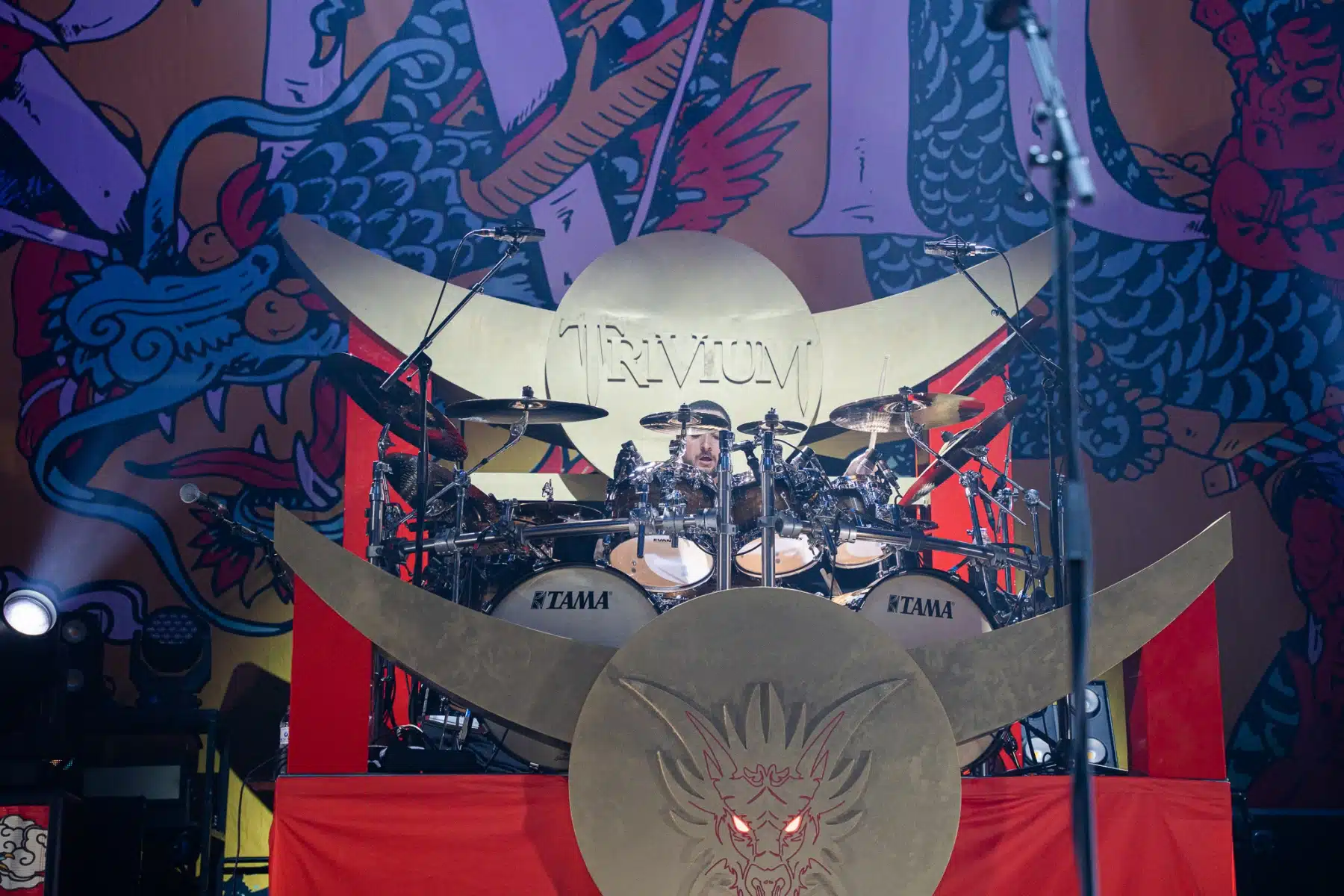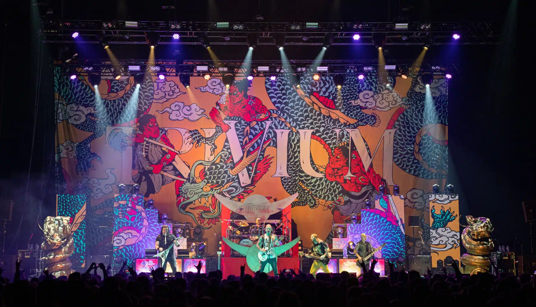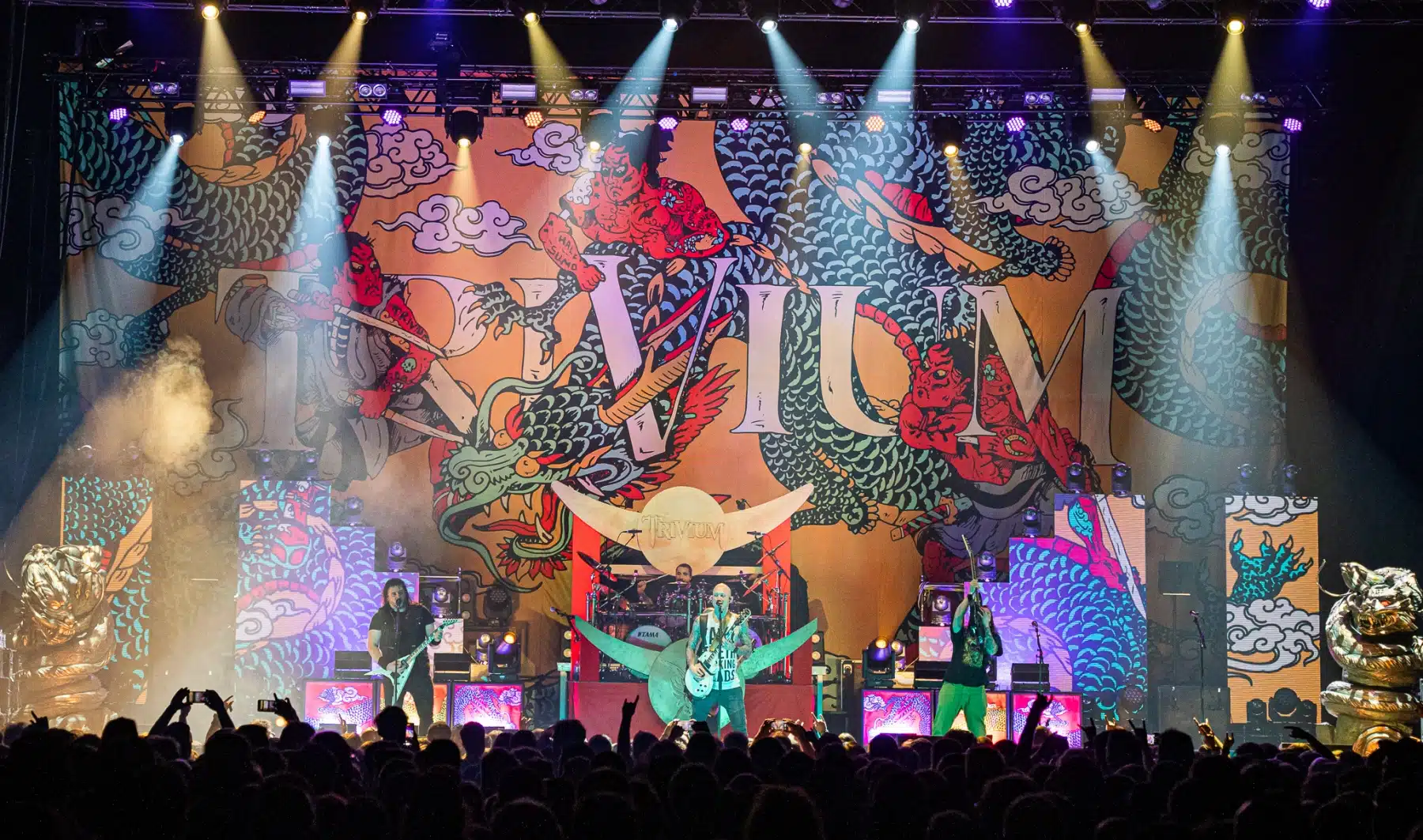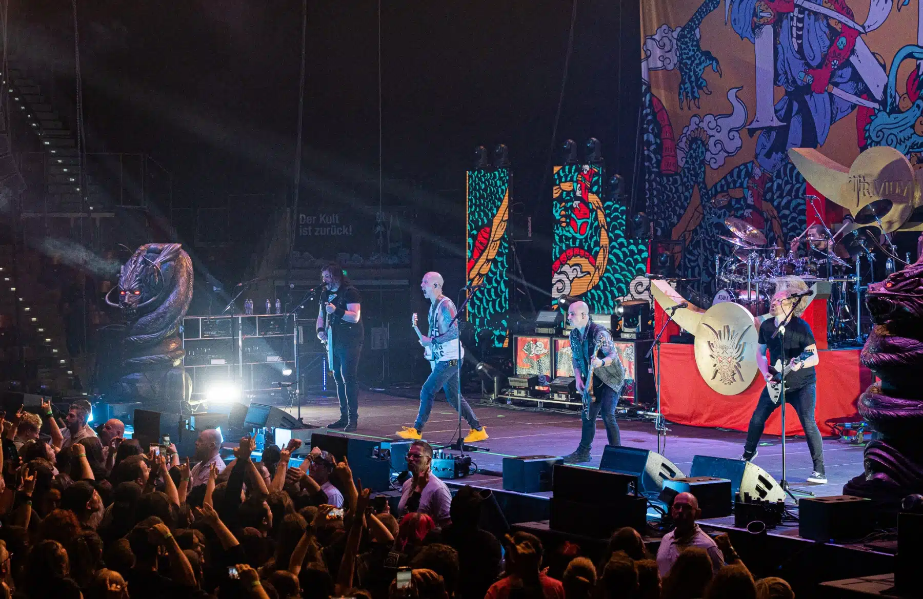 Wieder ein ganz anderes Bühnenbild als zuvor – in bunten Farben prangte das riesige Backdrop auf der Bühne. Links und rechts befanden sich zudem, noch zwei große Drachen Statuen, die das Ganze noch interessanter machten. Volle Kraft voraus – mit einem alten Song “Rain” kann man die Show auf jeden Fall eröffnen. Frontmann Mat Heafy fiel vor allem durch seinen zum Backdrop passenden Zipper uns seinen gelben Schuhen auf. Aber das war eher Nebensache, denn seine grandiosen Vocals und symphytische Art brachten die Fans zum ausrasten. Vor Allem bei dem Song “Strife” sangen die Leute so laut mit, dass Sänger Mat das Dauergrinsen nicht mehr aus seinem Gesicht wegbekam. Aber auch seine Band Kollegen hatten super viel Spaß auf der Bühne und der Funke sprang wie schon geschrieben, von Anfang an ins Publikum über. Trivium spielten sich gefühlt einmal quer durch ihre Diskografie, sogar “To the Rats” vom 2006er Crusade Album wurde gespielt.