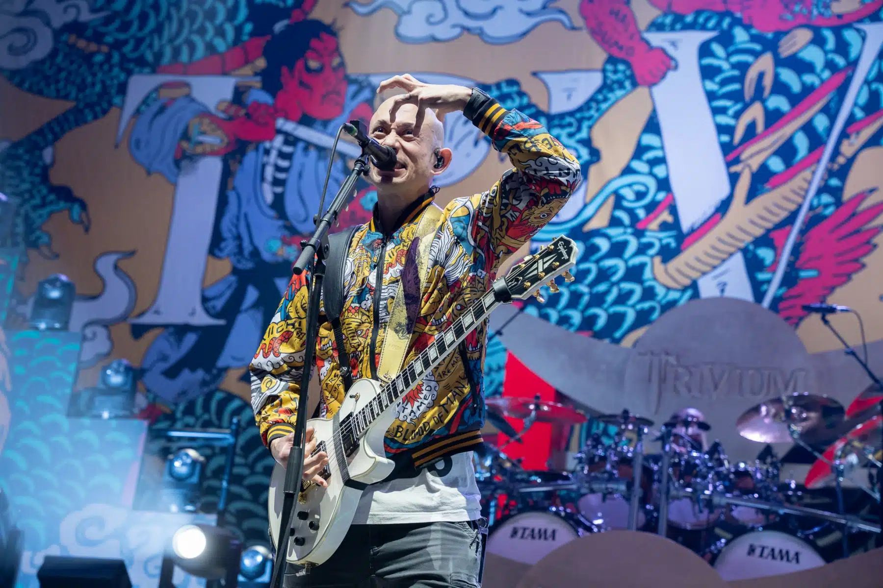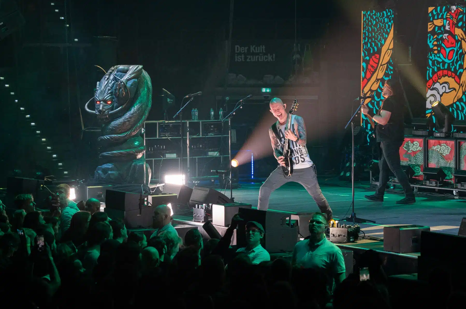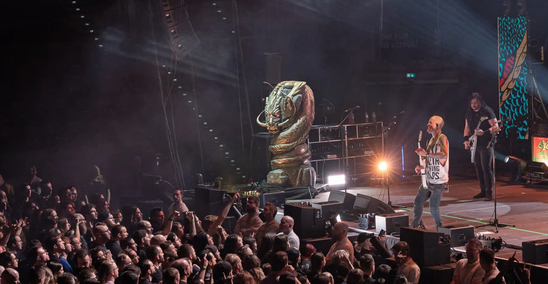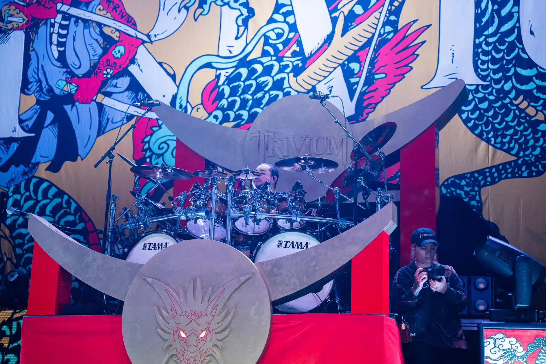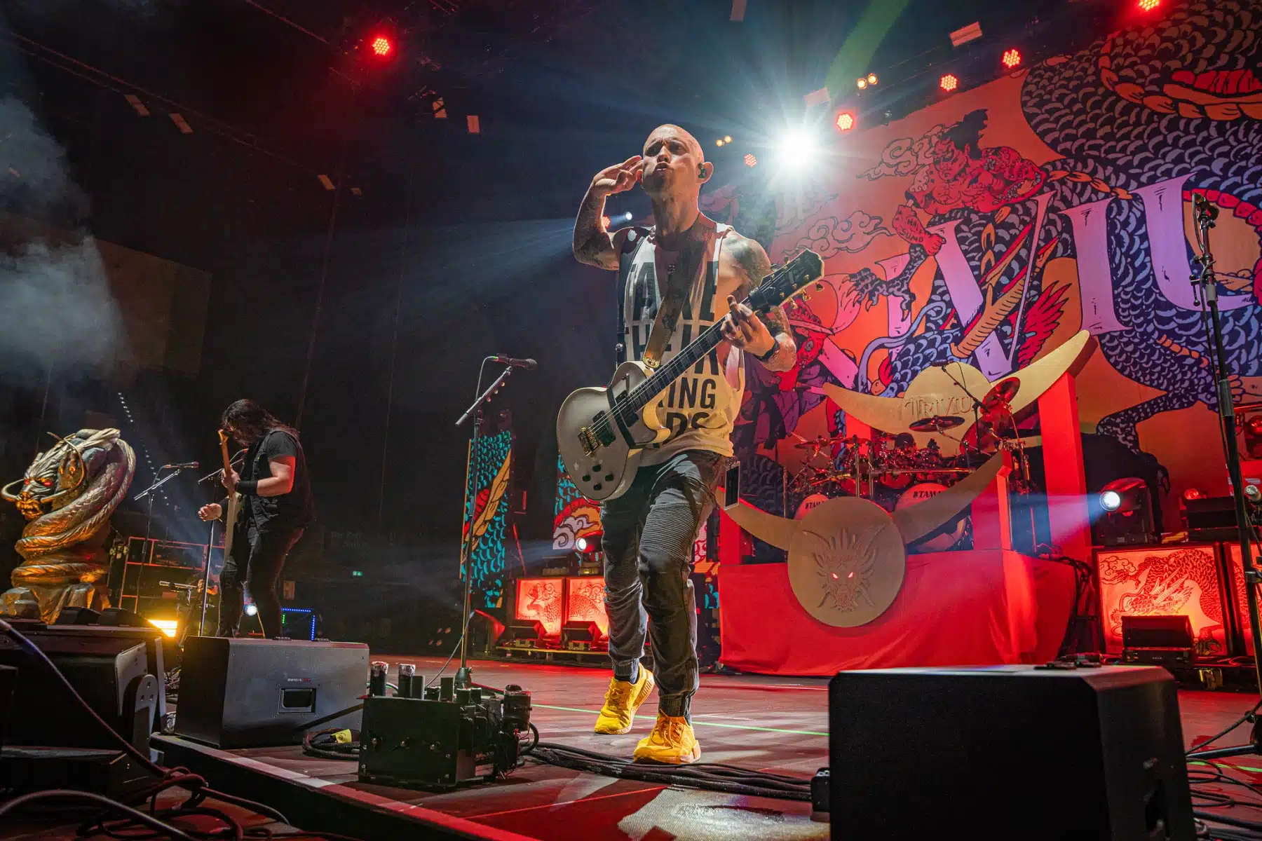 Wieder ein ganz anderes Bühnenbild als zuvor – in bunten Farben prangte das riesige Backdrop auf der Bühne. Links und rechts befanden sich zudem, noch zwei große Drachen Statuen, die das Ganze noch interessanter machten. Volle Kraft voraus – mit einem alten Song “Rain” kann man die Show auf jeden Fall eröffnen. Frontmann Mat Heafy fiel vor allem durch seinen zum Backdrop passenden Zipper uns seinen gelben Schuhen auf. Aber das war eher Nebensache, denn seine grandiosen Vocals und symphytische Art brachten die Fans zum ausrasten. Vor Allem bei dem Song “Strife” sangen die Leute so laut mit, dass Sänger Mat das Dauergrinsen nicht mehr aus seinem Gesicht wegbekam. Aber auch seine Band Kollegen hatten super viel Spaß auf der Bühne und der Funke sprang wie schon geschrieben, von Anfang an ins Publikum über. Trivium spielten sich gefühlt einmal quer durch ihre Diskografie, sogar “To the Rats” vom 2006er Crusade Album wurde gespielt.