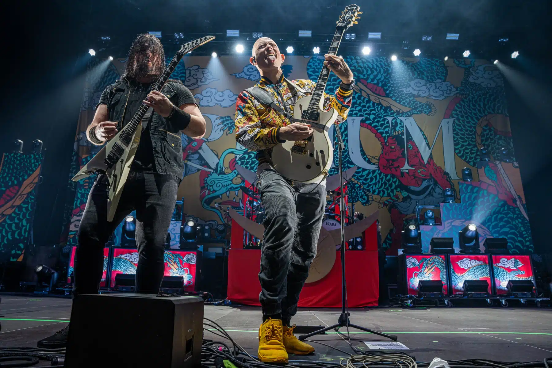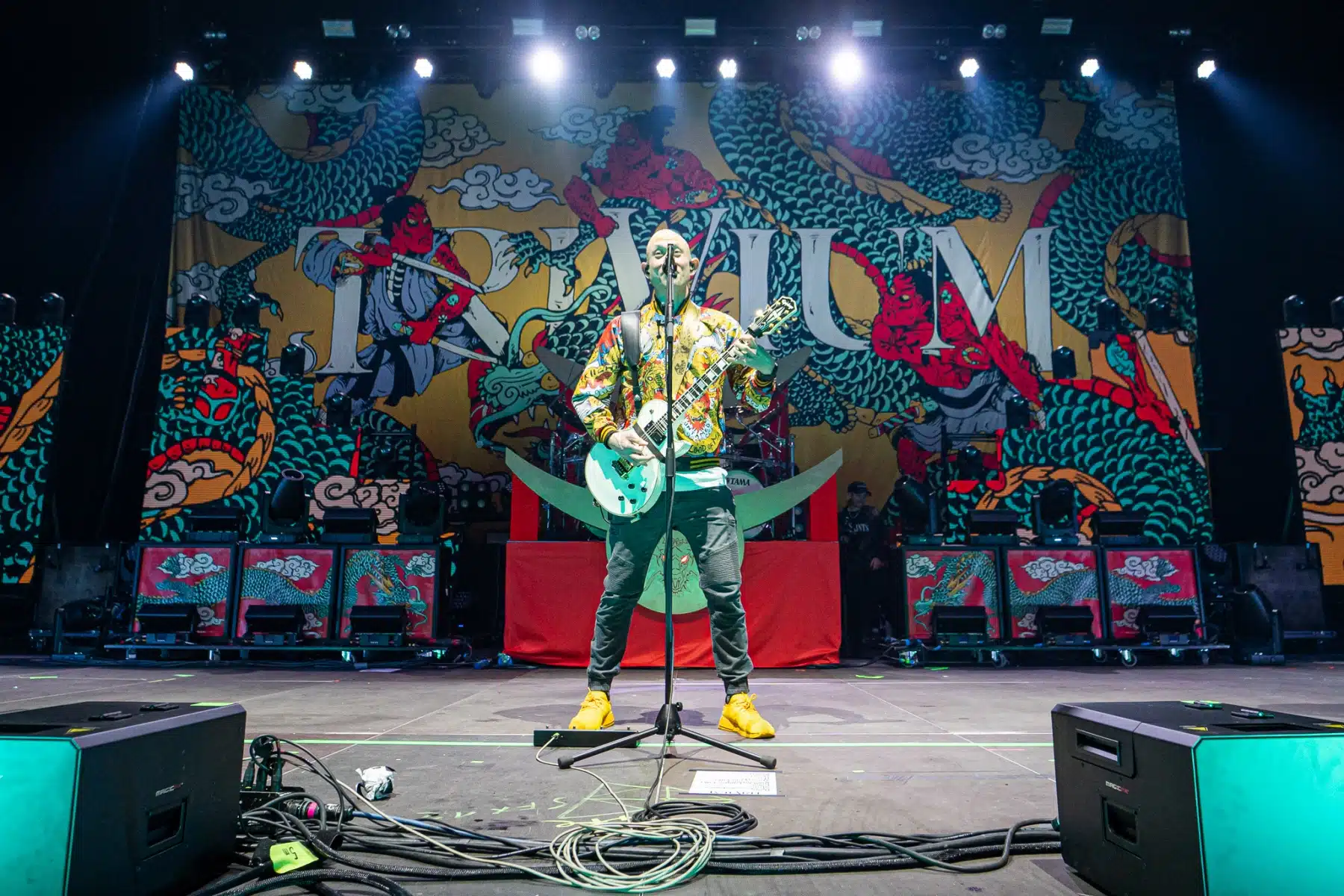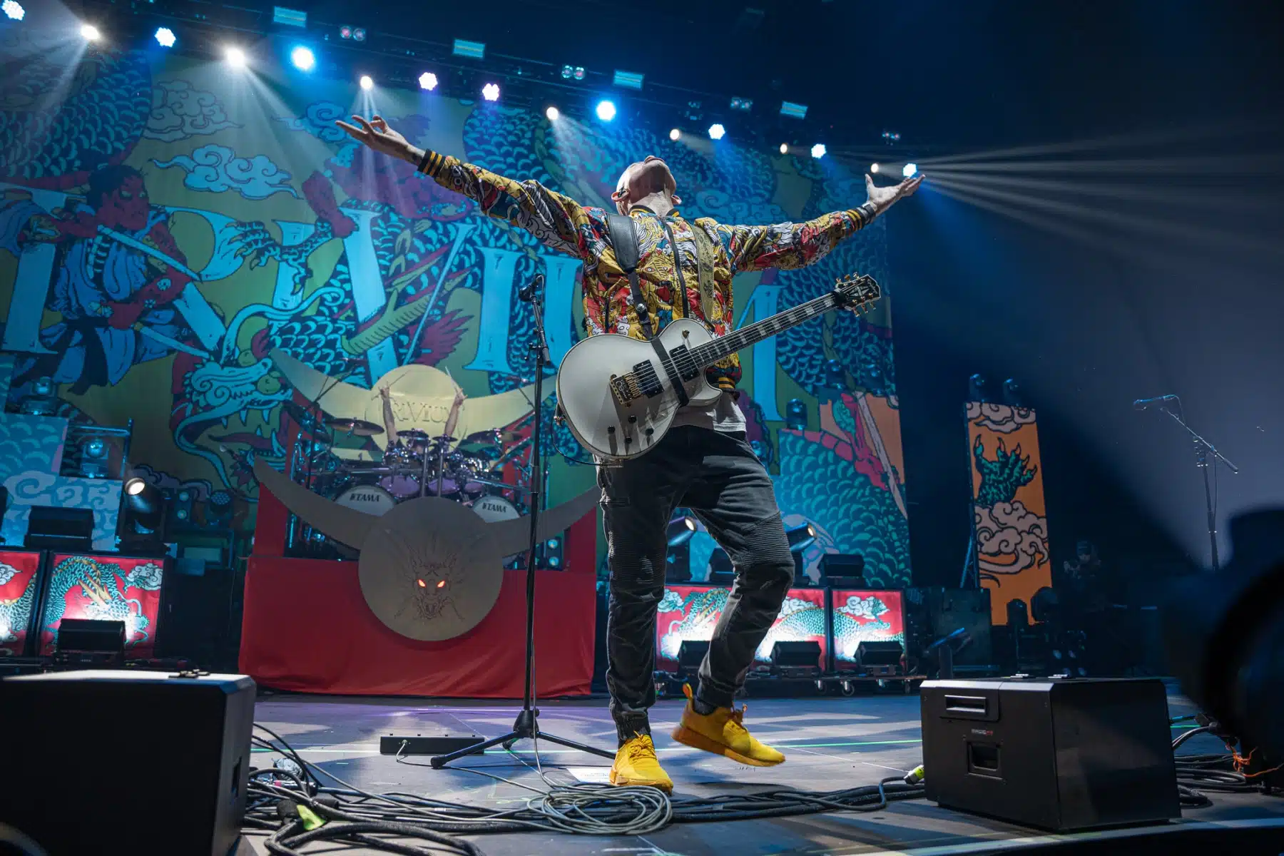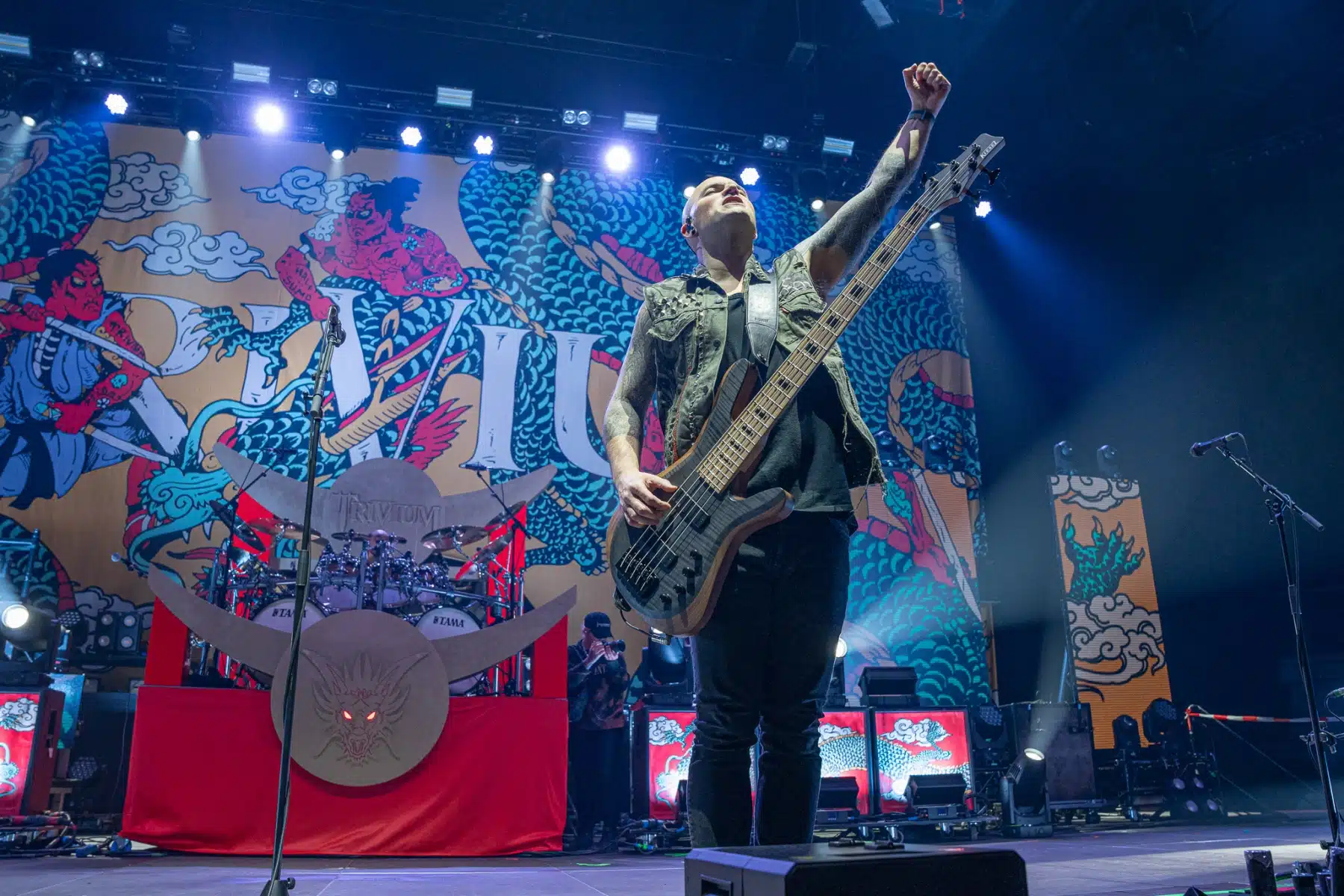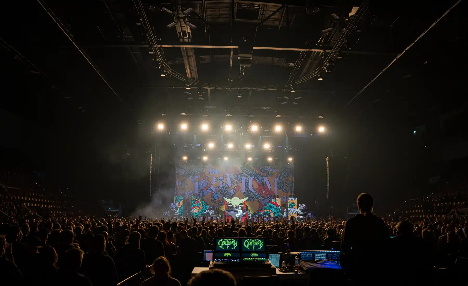 Wieder ein ganz anderes Bühnenbild als zuvor – in bunten Farben prangte das riesige Backdrop auf der Bühne. Links und rechts befanden sich zudem, noch zwei große Drachen Statuen, die das Ganze noch interessanter machten. Volle Kraft voraus – mit einem alten Song “Rain” kann man die Show auf jeden Fall eröffnen. Frontmann Mat Heafy fiel vor allem durch seinen zum Backdrop passenden Zipper uns seinen gelben Schuhen auf. Aber das war eher Nebensache, denn seine grandiosen Vocals und symphytische Art brachten die Fans zum ausrasten. Vor Allem bei dem Song “Strife” sangen die Leute so laut mit, dass Sänger Mat das Dauergrinsen nicht mehr aus seinem Gesicht wegbekam. Aber auch seine Band Kollegen hatten super viel Spaß auf der Bühne und der Funke sprang wie schon geschrieben, von Anfang an ins Publikum über. Trivium spielten sich gefühlt einmal quer durch ihre Diskografie, sogar “To the Rats” vom 2006er Crusade Album wurde gespielt.
