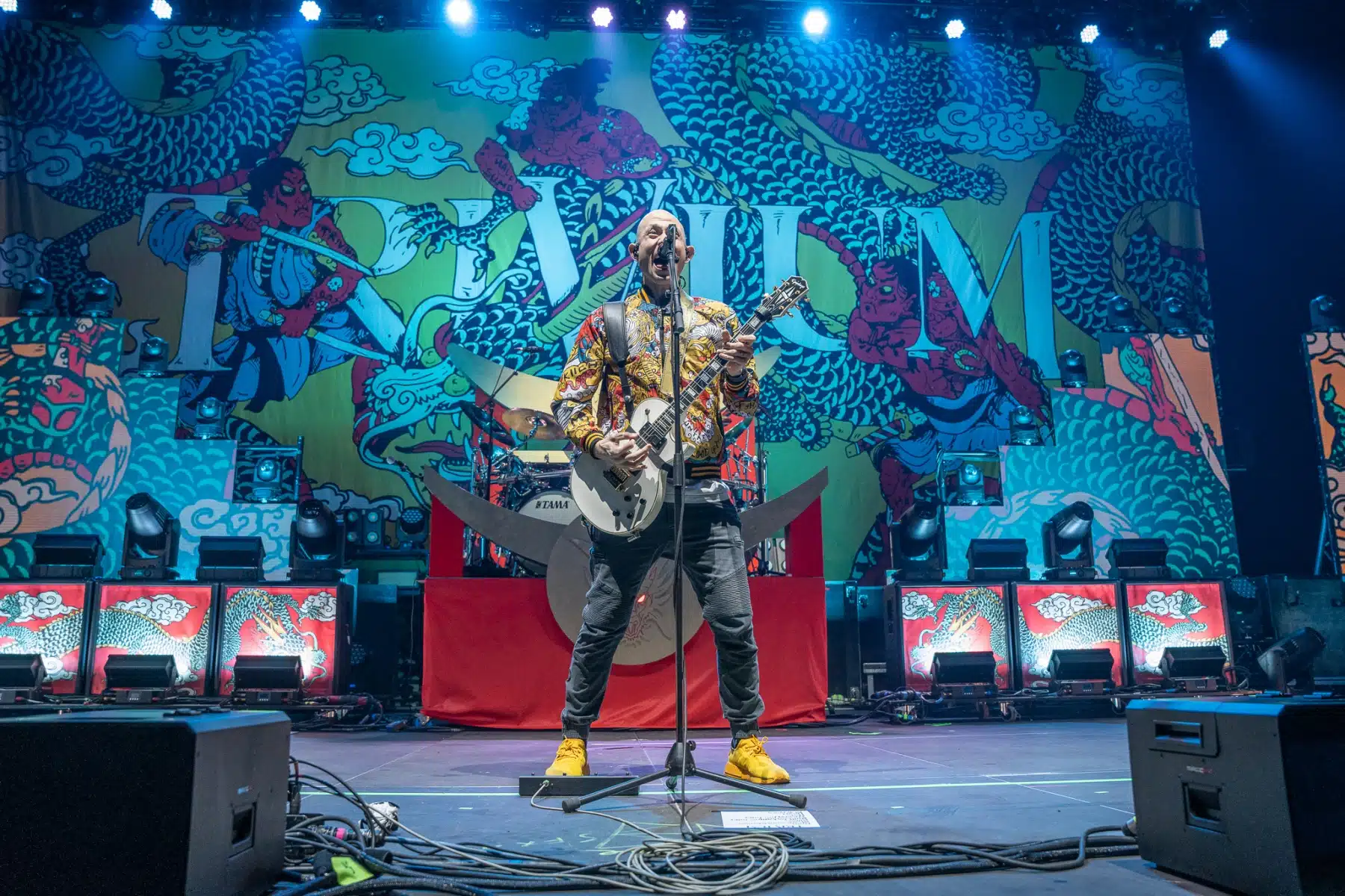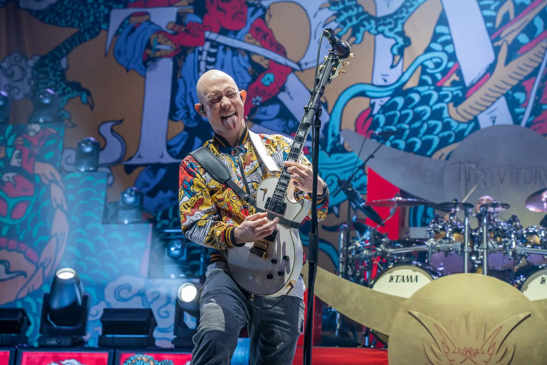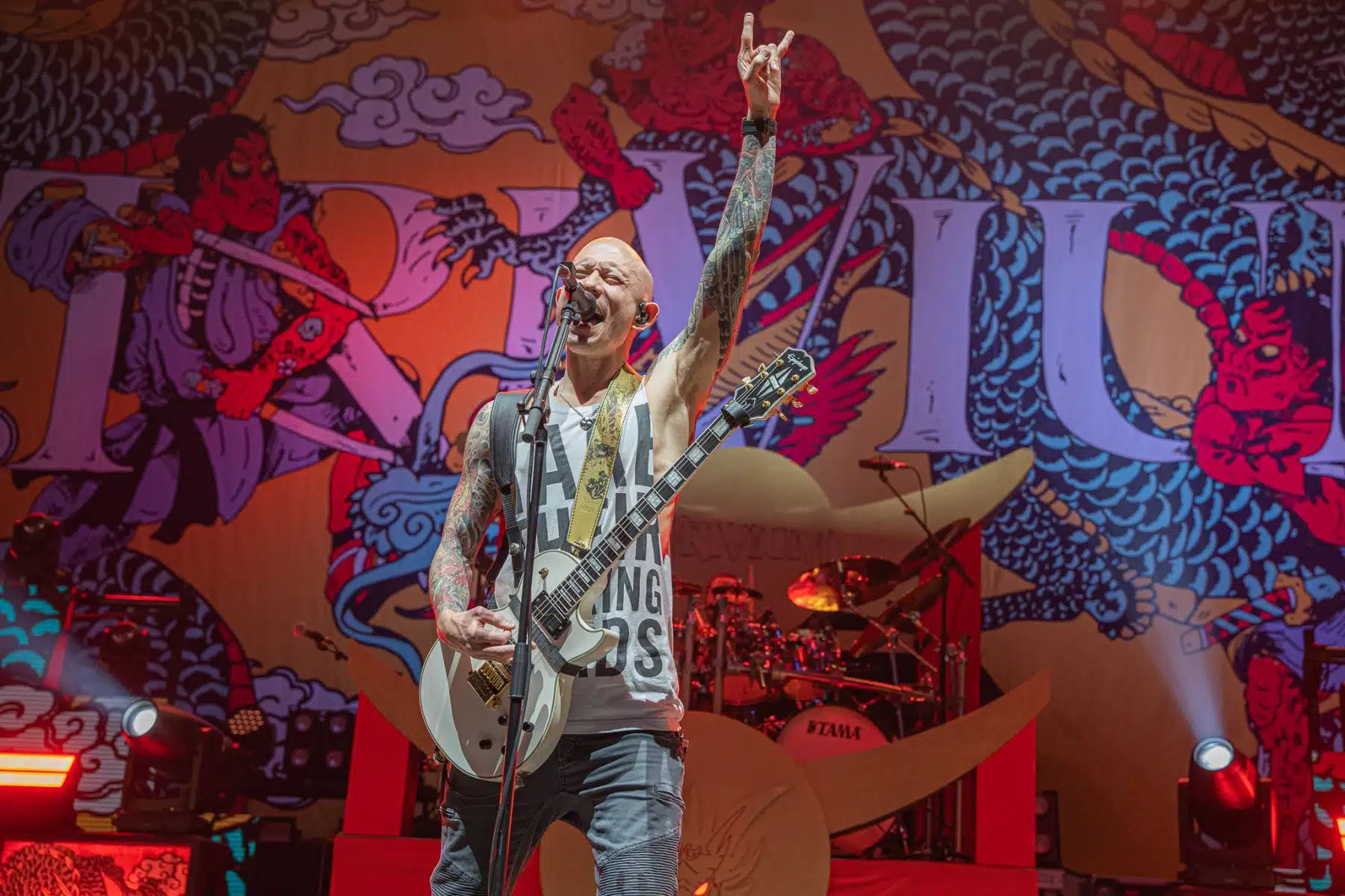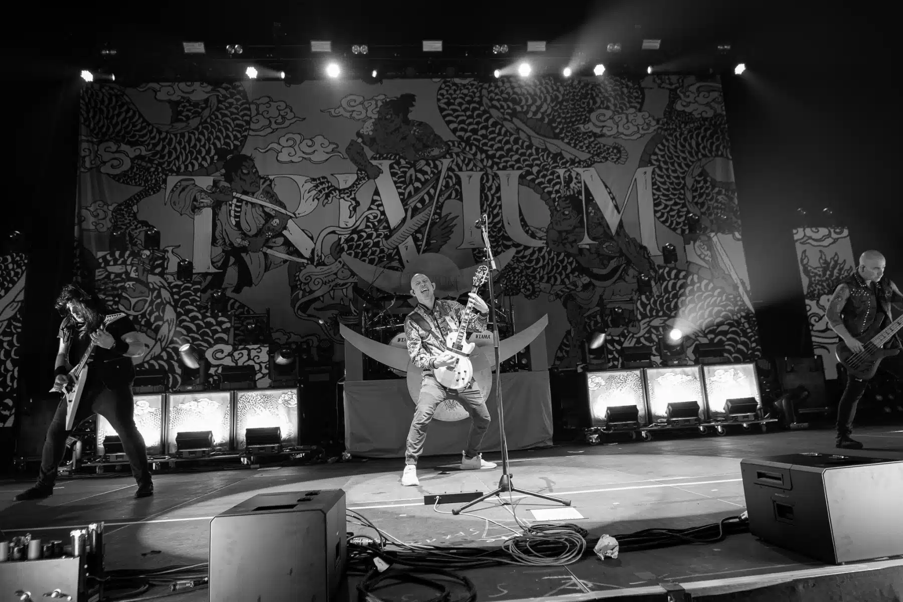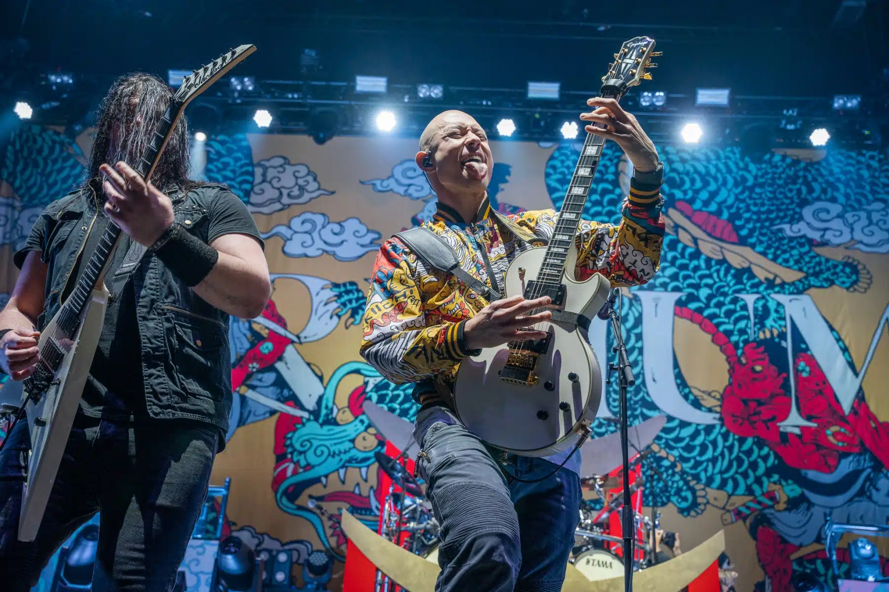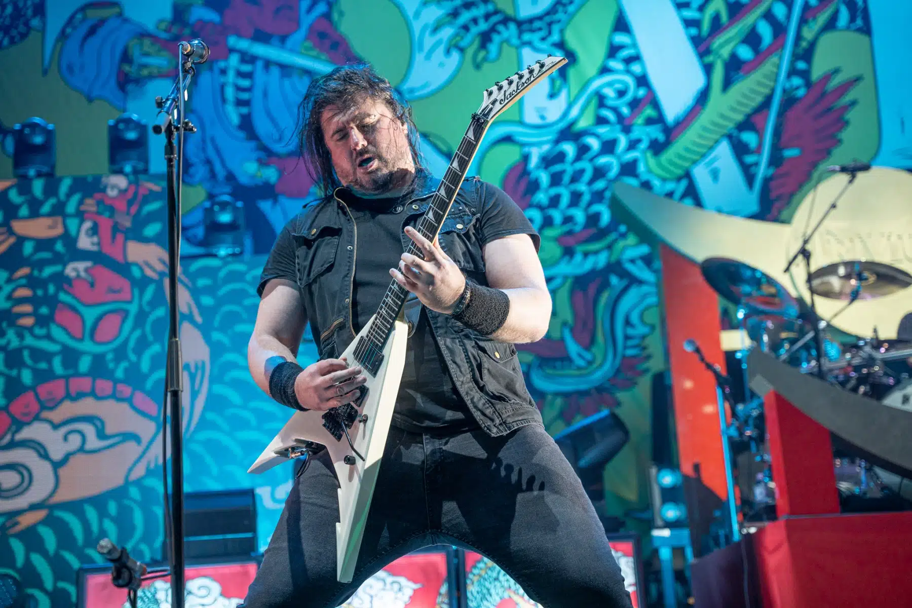 Wieder ein ganz anderes Bühnenbild als zuvor – in bunten Farben prangte das riesige Backdrop auf der Bühne. Links und rechts befanden sich zudem, noch zwei große Drachen Statuen, die das Ganze noch interessanter machten. Volle Kraft voraus – mit einem alten Song “Rain” kann man die Show auf jeden Fall eröffnen. Frontmann Mat Heafy fiel vor allem durch seinen zum Backdrop passenden Zipper uns seinen gelben Schuhen auf. Aber das war eher Nebensache, denn seine grandiosen Vocals und symphytische Art brachten die Fans zum ausrasten. Vor Allem bei dem Song “Strife” sangen die Leute so laut mit, dass Sänger Mat das Dauergrinsen nicht mehr aus seinem Gesicht wegbekam. Aber auch seine Band Kollegen hatten super viel Spaß auf der Bühne und der Funke sprang wie schon geschrieben, von Anfang an ins Publikum über. Trivium spielten sich gefühlt einmal quer durch ihre Diskografie, sogar “To the Rats” vom 2006er Crusade Album wurde gespielt.
