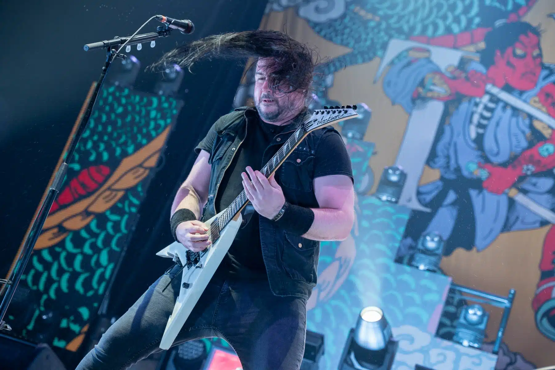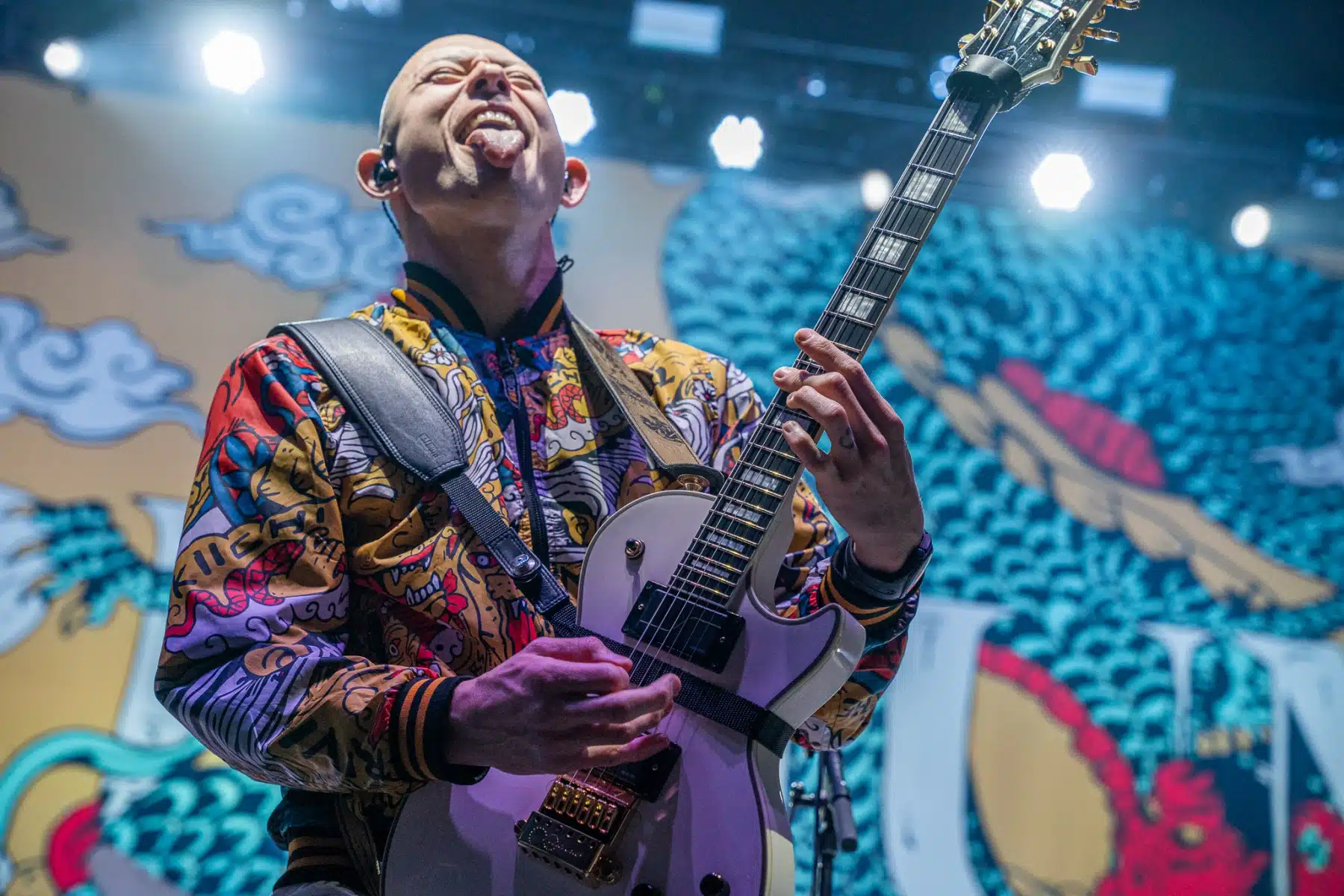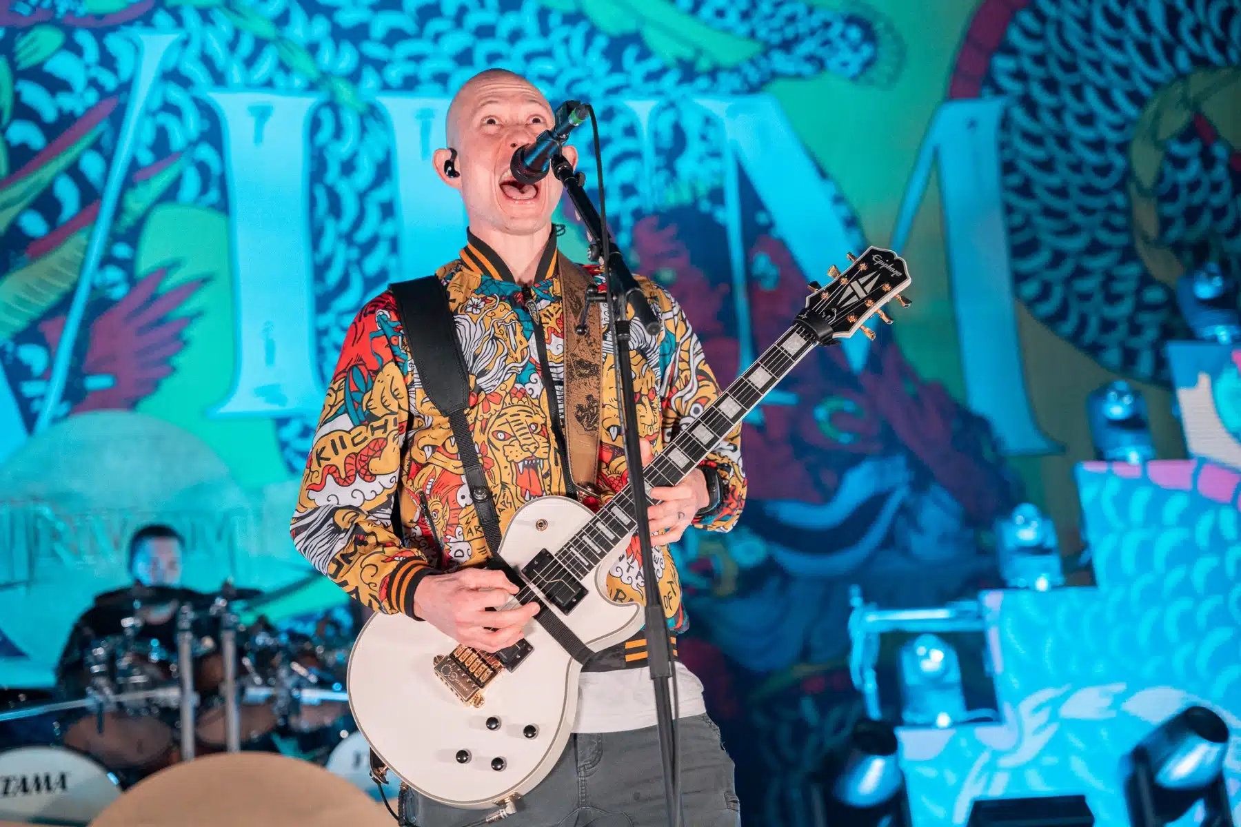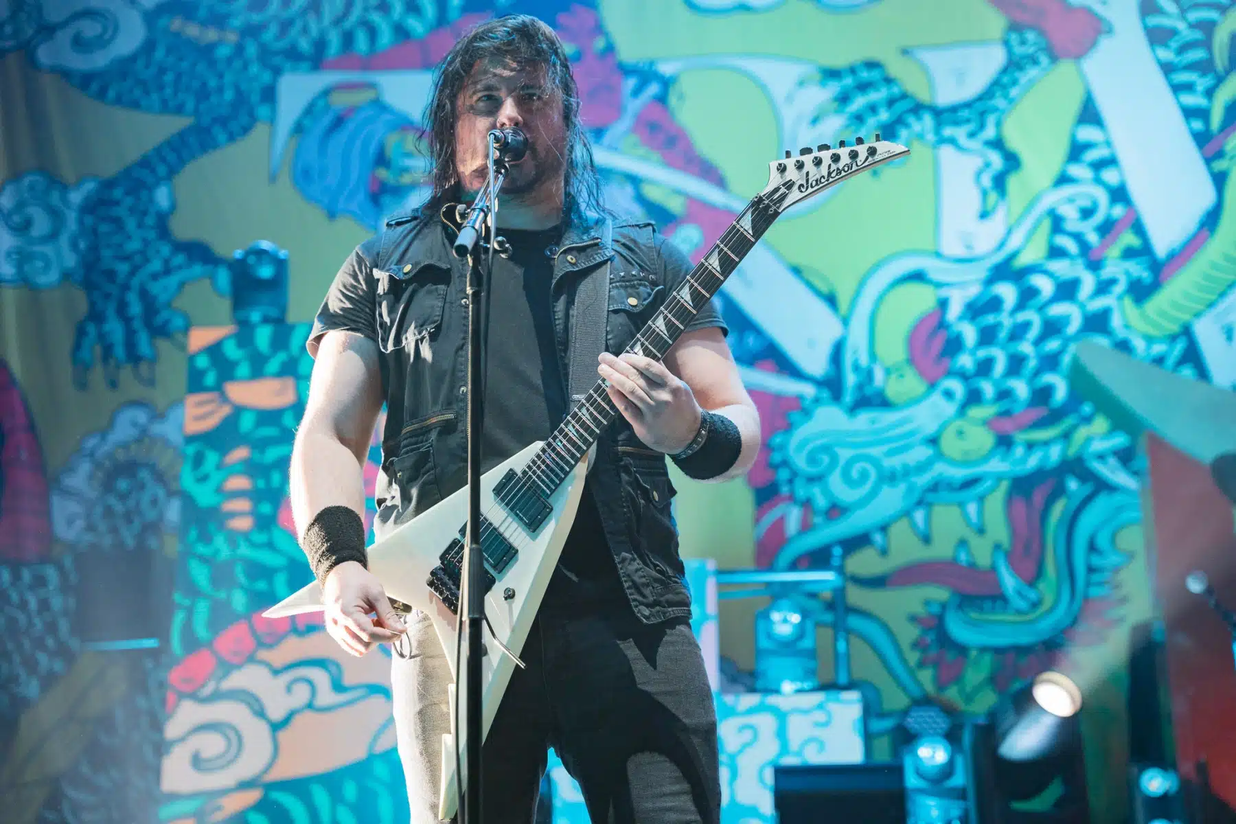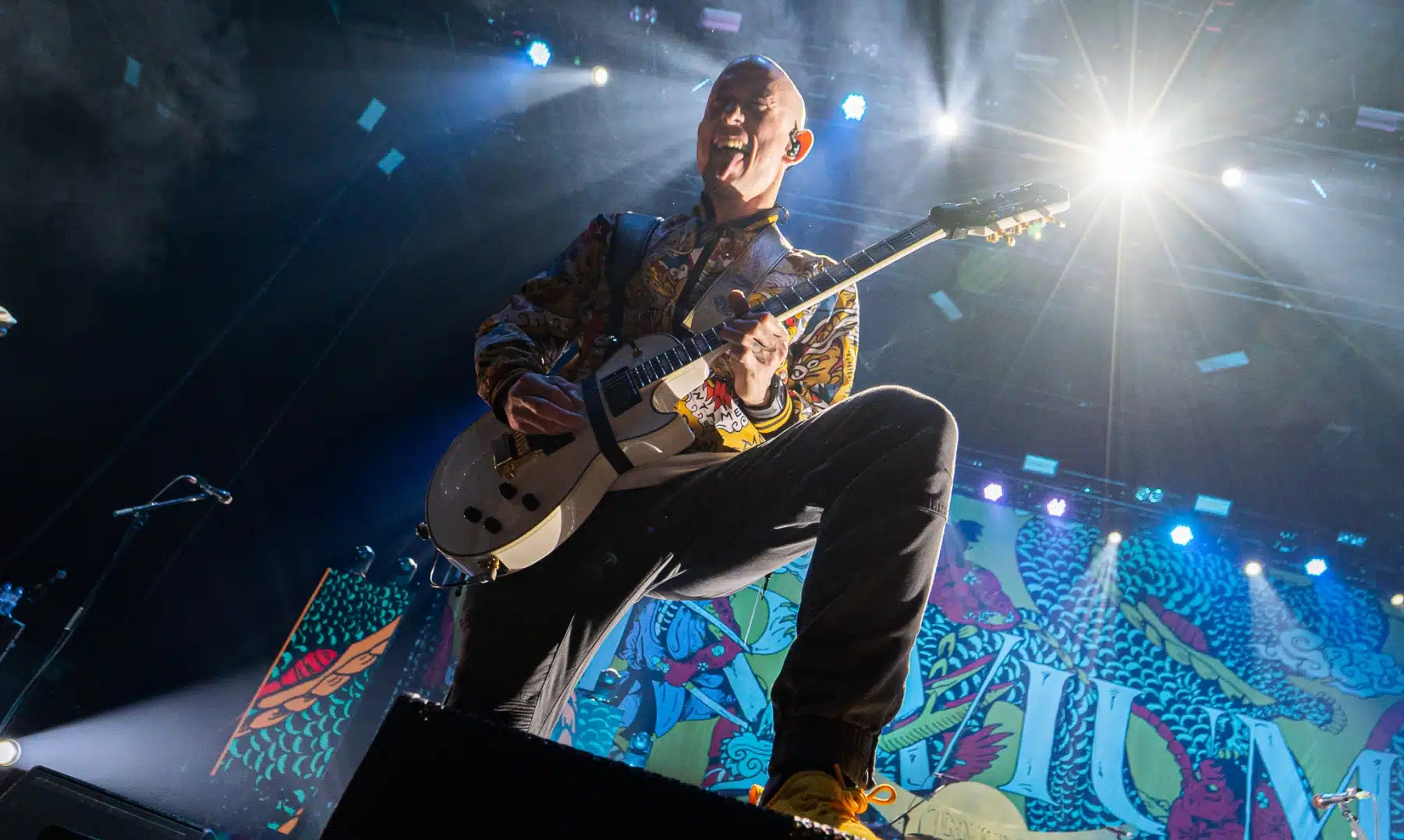 Wieder ein ganz anderes Bühnenbild als zuvor – in bunten Farben prangte das riesige Backdrop auf der Bühne. Links und rechts befanden sich zudem, noch zwei große Drachen Statuen, die das Ganze noch interessanter machten. Volle Kraft voraus – mit einem alten Song “Rain” kann man die Show auf jeden Fall eröffnen. Frontmann Mat Heafy fiel vor allem durch seinen zum Backdrop passenden Zipper uns seinen gelben Schuhen auf. Aber das war eher Nebensache, denn seine grandiosen Vocals und symphytische Art brachten die Fans zum ausrasten. Vor Allem bei dem Song “Strife” sangen die Leute so laut mit, dass Sänger Mat das Dauergrinsen nicht mehr aus seinem Gesicht wegbekam. Aber auch seine Band Kollegen hatten super viel Spaß auf der Bühne und der Funke sprang wie schon geschrieben, von Anfang an ins Publikum über. Trivium spielten sich gefühlt einmal quer durch ihre Diskografie, sogar “To the Rats” vom 2006er Crusade Album wurde gespielt.