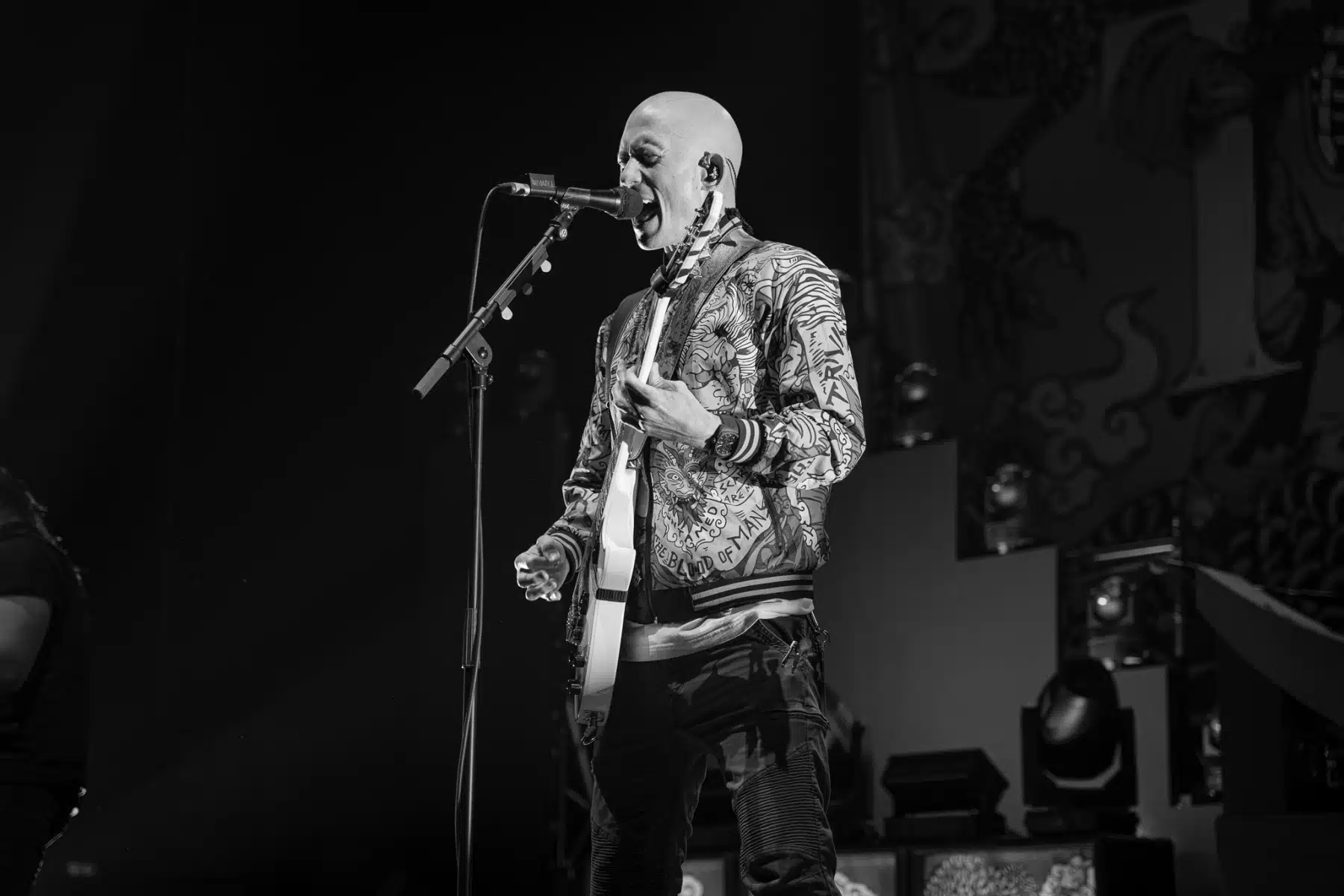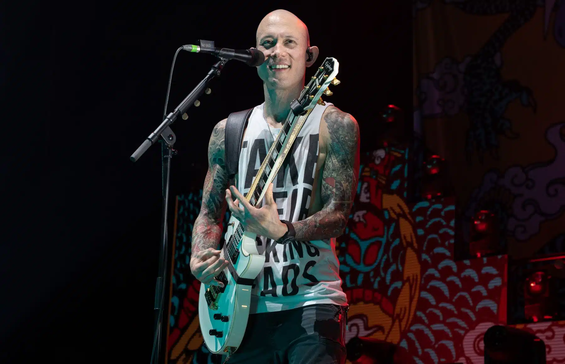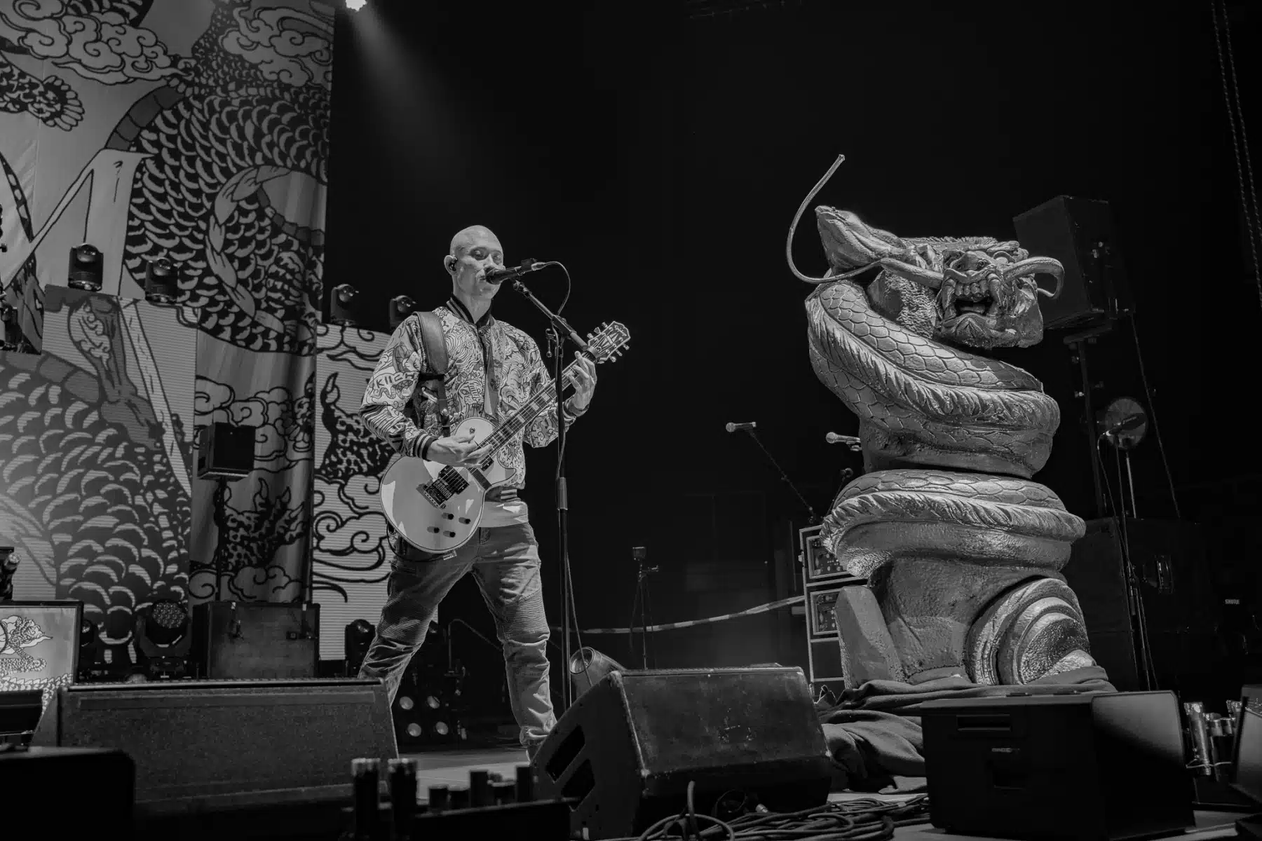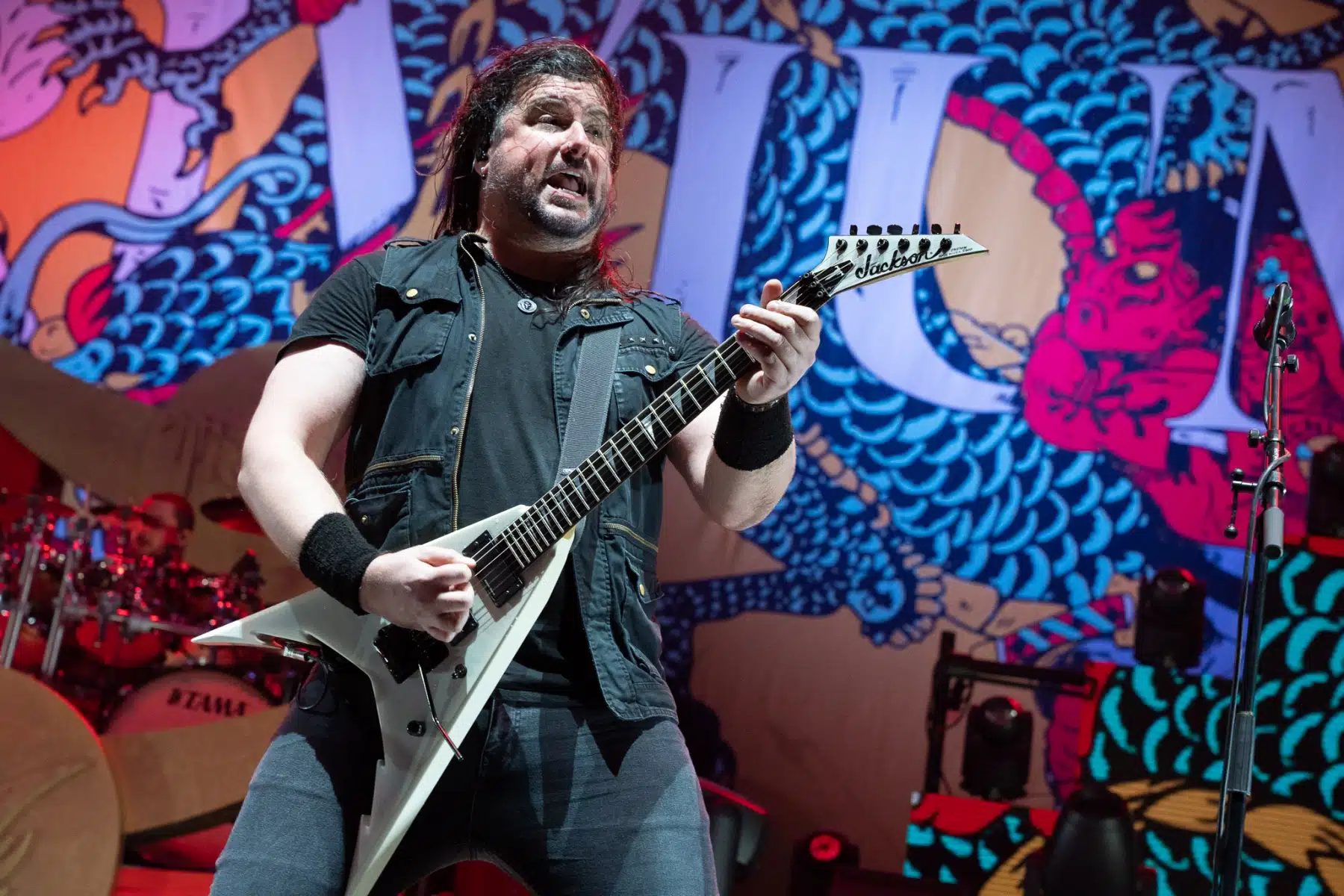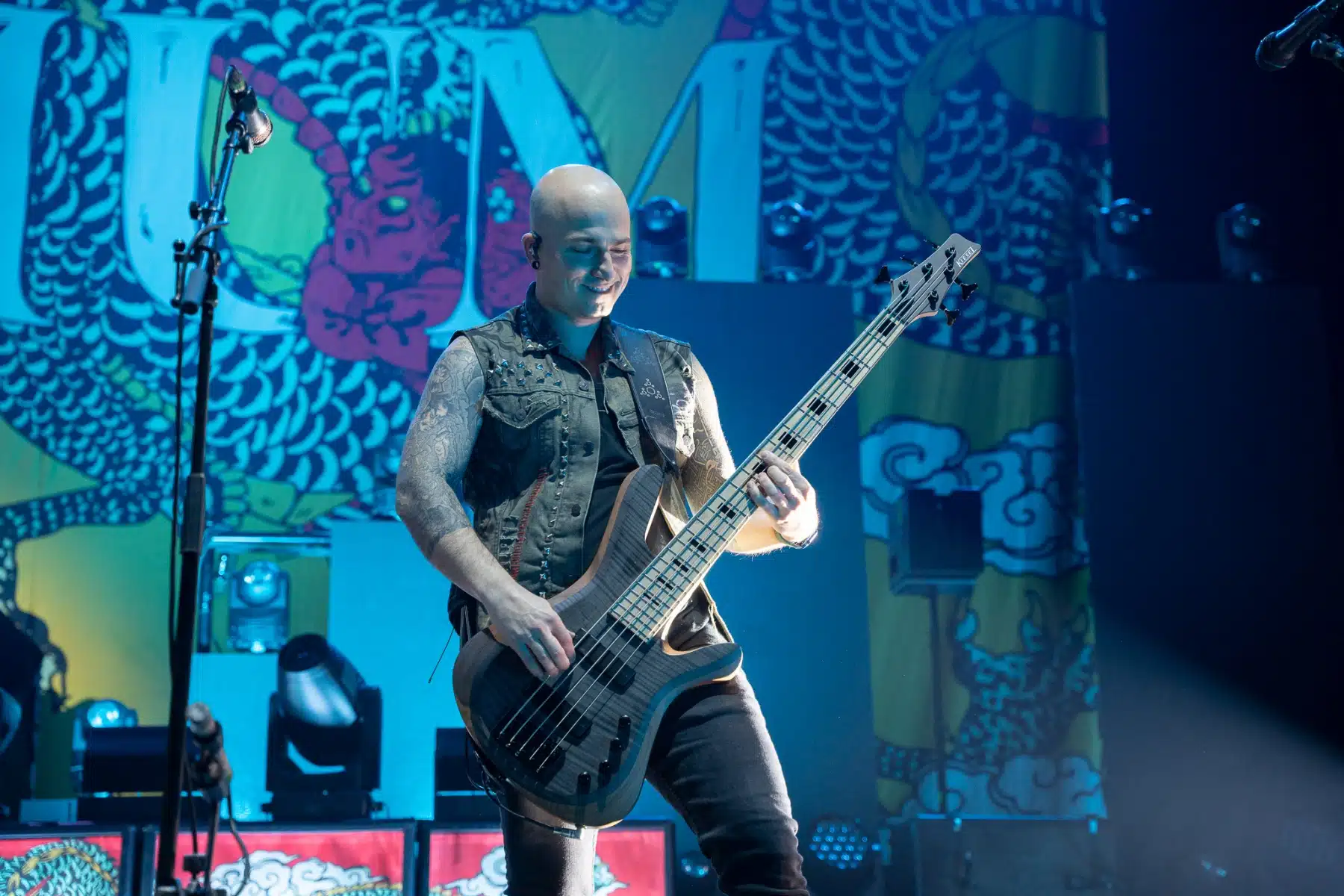 Wieder ein ganz anderes Bühnenbild als zuvor – in bunten Farben prangte das riesige Backdrop auf der Bühne. Links und rechts befanden sich zudem, noch zwei große Drachen Statuen, die das Ganze noch interessanter machten. Volle Kraft voraus – mit einem alten Song “Rain” kann man die Show auf jeden Fall eröffnen. Frontmann Mat Heafy fiel vor allem durch seinen zum Backdrop passenden Zipper uns seinen gelben Schuhen auf. Aber das war eher Nebensache, denn seine grandiosen Vocals und symphytische Art brachten die Fans zum ausrasten. Vor Allem bei dem Song “Strife” sangen die Leute so laut mit, dass Sänger Mat das Dauergrinsen nicht mehr aus seinem Gesicht wegbekam. Aber auch seine Band Kollegen hatten super viel Spaß auf der Bühne und der Funke sprang wie schon geschrieben, von Anfang an ins Publikum über. Trivium spielten sich gefühlt einmal quer durch ihre Diskografie, sogar “To the Rats” vom 2006er Crusade Album wurde gespielt.
