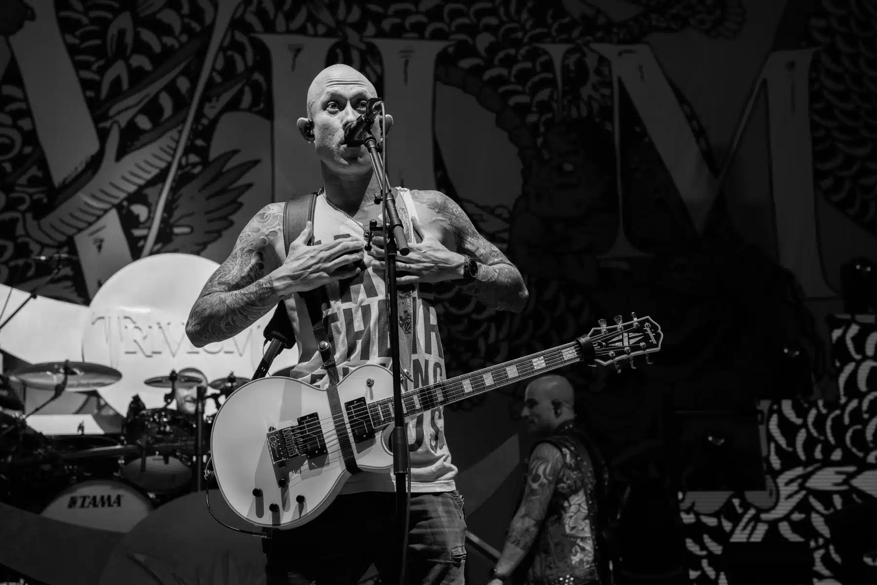 Als Co-Headliner hatten HSB die Jungs von Trivium eingeladen, sie auf der Tour zu begleiten. Da beide Bands schon über 20 Jahre befreundet sind, so Heaven Shall Burn (HSB) Sänger Marcus Bischoff, war es jetzt unausweichlich, denn im Dezember erst haben sie eine gemeinsame Platte aufgenommen.