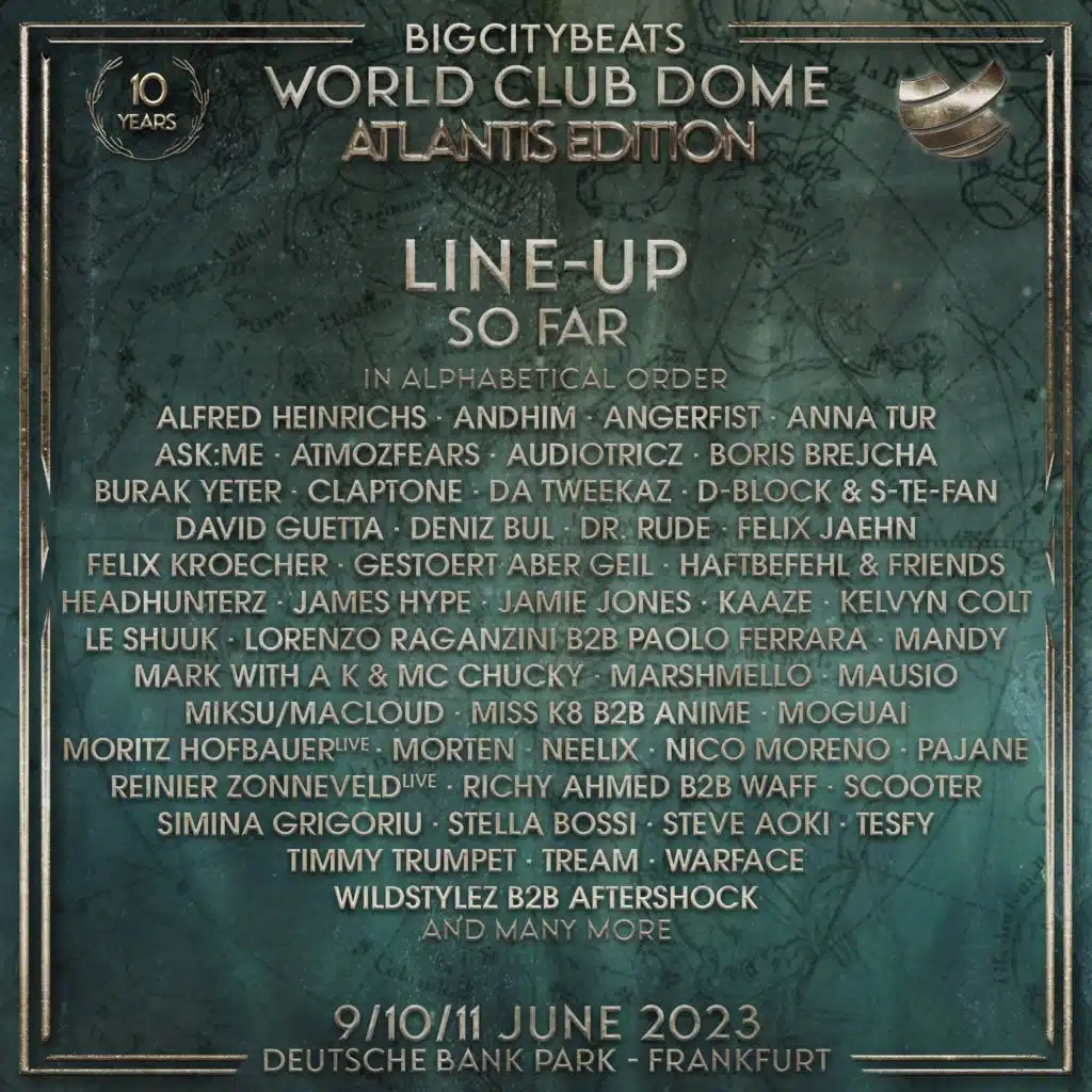 Zum 10-jährigen Jubiläum erweckt der BigCityBeats WORLD CLUB DOME die legendäre Insel Atlantis zum Leben. Das Stadiongelände des Frankfurter Deutsche Bank Parks mit seiner 700.000 Quadratmeter große Fläche wird sich für drei Tage in das 9600 v. Chr. bei einer Naturkatastrophe versunkene Königreich, das der griechische Philosoph Plato beschrieb, verwandeln. Bis zu 180.000 Besucher aus der ganzen Welt werden erwartet, die in eine magische Welt entführt werden, in der die Beatsässe einer versunkenen Metropole auf die mystischen Geschichten von der versunkenen Metropole Atlantis treffen.