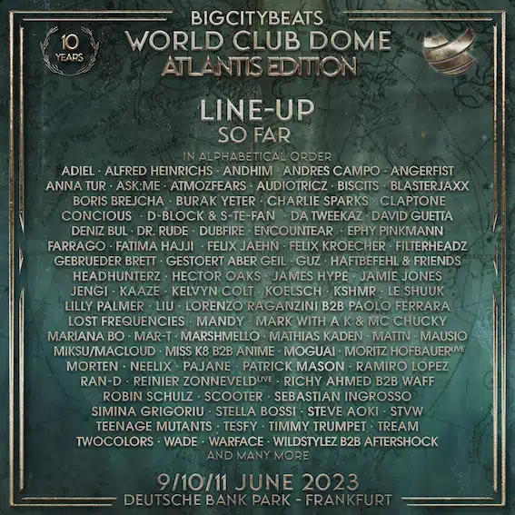 2023 feiert der BigCityBeats WORLD CLUB DOME sein 10-jähriges Bestehen, daher setzt das weltweit renommierte Festival noch einen drauf. Zum Jubiläum wird die Nr. 11 der DJ Mag Top 100 Festivals seine Fans mit einem einzigartigen Festivaldesign, einer innovativen Produktion, und einem vielschichtigen Line Up verzaubern. Gemeinsam werden Besucher und Artists in die Unterwasserwelt von Atlantis eintauchen.