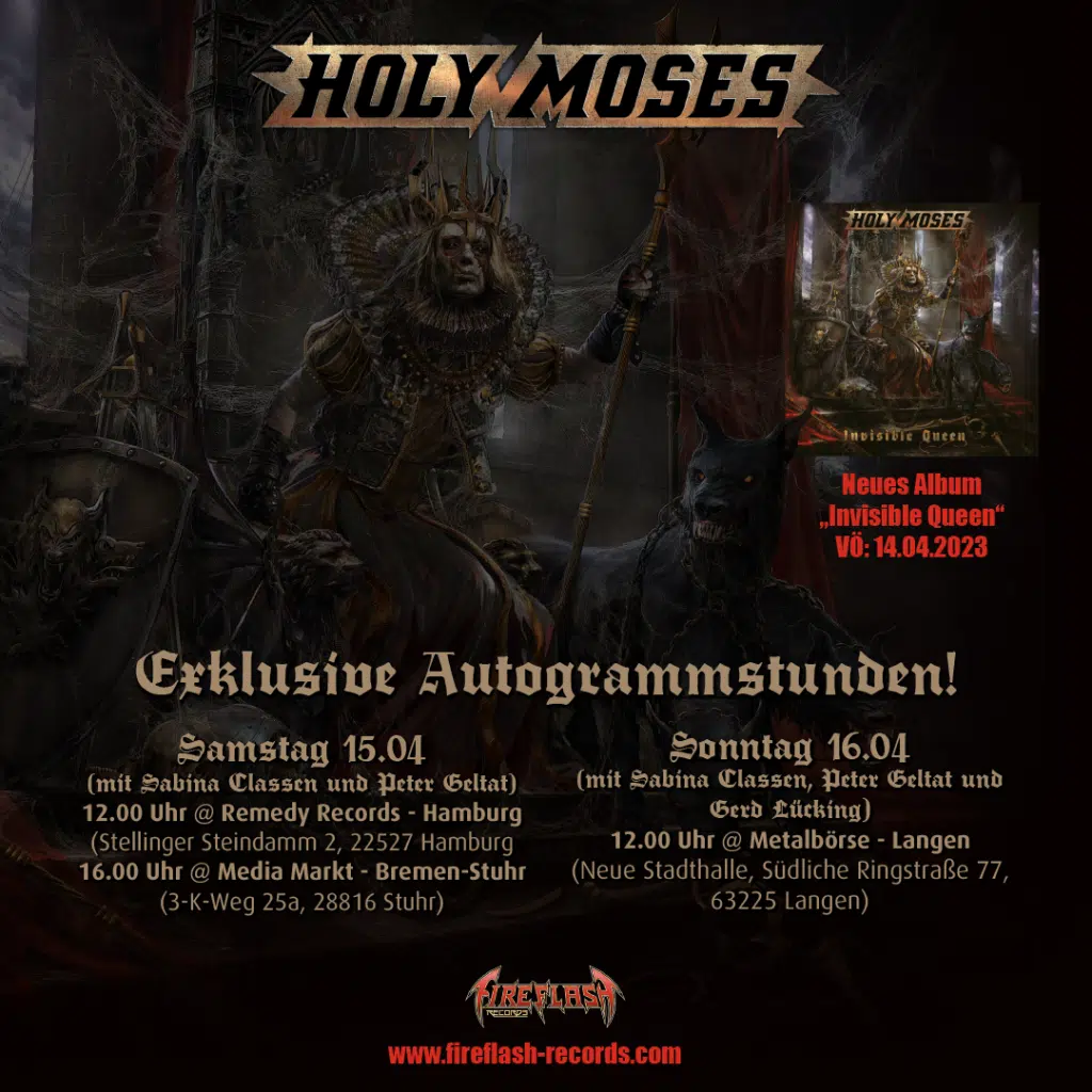 HOLY MOSES sind in der internationalen Metalszene eine feste Institution. Ihr facettenreicher Thrash Metal, die charismatische Stimme von Frontfrau Sabina Classen sowie die Mischung aus traditionellen Attitüden und experimenteller Weiterentwicklung haben die Band seit den frühen Achtzigern zu einer festen Größe werden lassen. Mit Klassikern wie „Finished With The Dogs“ (1987), „The New Machine Of Liechtenstein“ (1989), „World Chaos“ (1990) oder „Terminal Terror“ (1991) schrieben HOLY MOSES Metalgeschichte. „Invisible Queen“ fügt der Geschichte ein weiteres, bedeutendes und finales Kapitel hinzu.