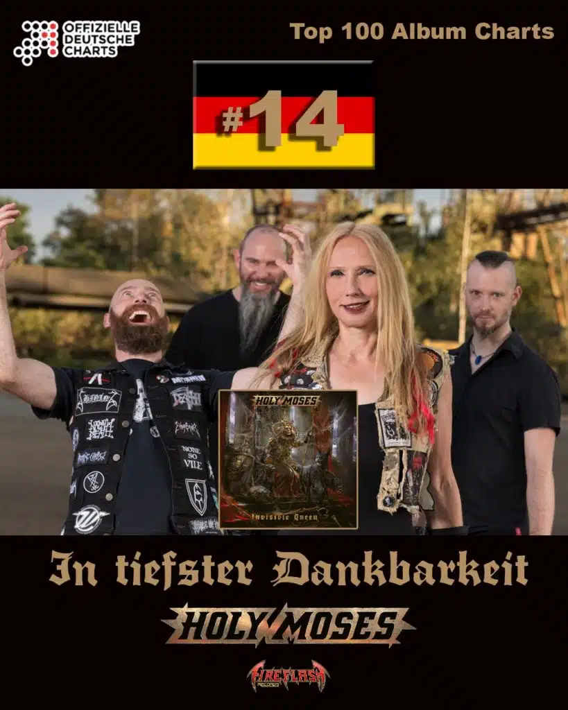 Im Lager von HOLY MOSES und ihrem Label Fireflash Records hat man mit vielem gerechnet, aber nicht mit einem Charteinstieg in dieser Größenordnung – „Invisible Queen“ schafft die Sensation und entert die offiziellen deutschen Albumcharts auf einem grandiose Platz #14!