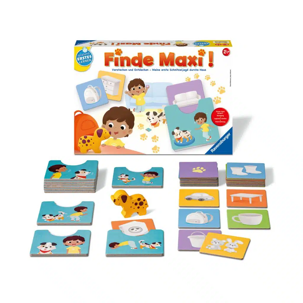 Der kleine Hund Maxi ist weg, wo hat er sich versteckt? Unter dem Tisch? Hinter dem Sofa? Im Kinderzimmer? Für dieses aktionsreiche Suchspiel für Kleinkinder haben Mama oder Papa bereits Umschläge im ganzen Haus versteckt. Diese bringen ein bis zwei kleine Entdecker auf die Spur zu Maxi. Doch bevor die Kinder die wegweisenden Hinweise heraus ziehen, fordert sie der Hund zu lustigen Bewegungen auf, z.B. Popowackeln oder Pfötchen geben. Dadurch werden die Kleinkinder aktiv und entdecken spielerisch ihre Umgebung. Je nach Alter der Kinder lässt sich die Schnitzeljagd beliebig verlängern.