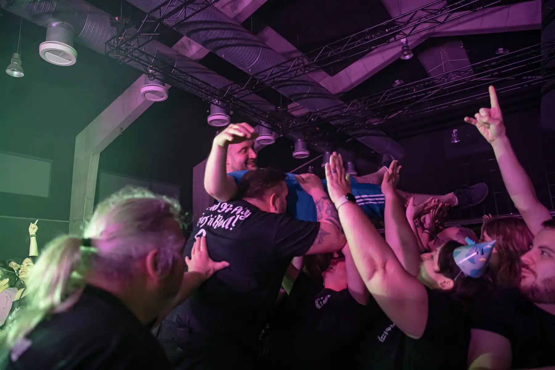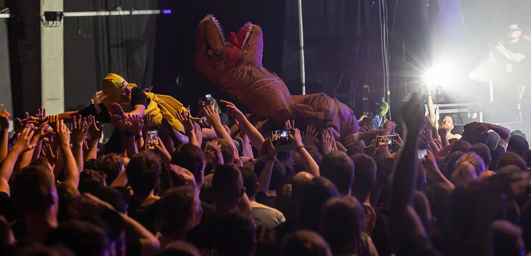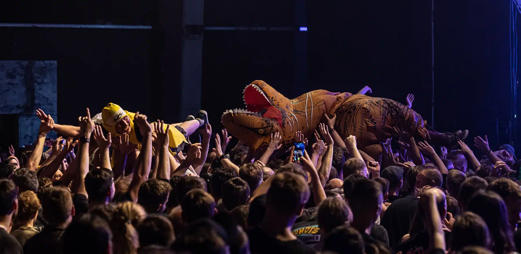 Bei der Abendshow ging es dann ein wenig härter zur Sache, das nun erwachsenere Publikum nutze ausgiebig die Möglichkeit auf der Menge zu surfen wenn es der aktuelle Song ermöglichte. Diesmal wurden 2 Gäste auf die Bühne eingeladen die beide verkleidet waren, einer als Banane und einer als Saurier. Sänger Ingo hatte den Wunsch mal zu sehen wie ein Saurier eine Banane frisst. Anschließend surften beide Gäste gemütlich auf dem Publikum durch die Halle. Neue Songs wie „Längst noch nicht vorbei“ , „Hey Ralph“ oder „Kometen“ kamen alle sehr gut beim Publikum an. Die Stimmung war bei beiden ausverkauften Shows jederzeit großartig. Kann man einer Band mehr Respekt entgegenbringen als 2 Shows an einem Tag möglich zu machen? Laut Sänger Ingo würde sowas nur in Wiesbaden funktionieren, deshalb kommen die Donots immer wieder gerne zurück um die besten Shows ihrer Karriere im Wiesbadener Schlachthof zu spielen.