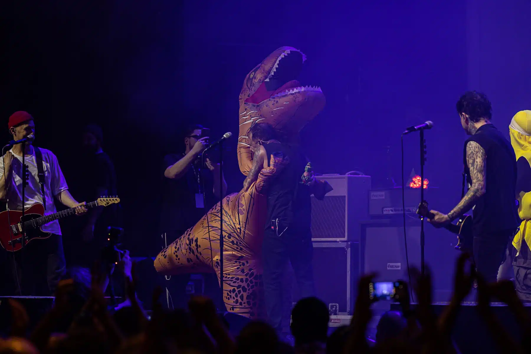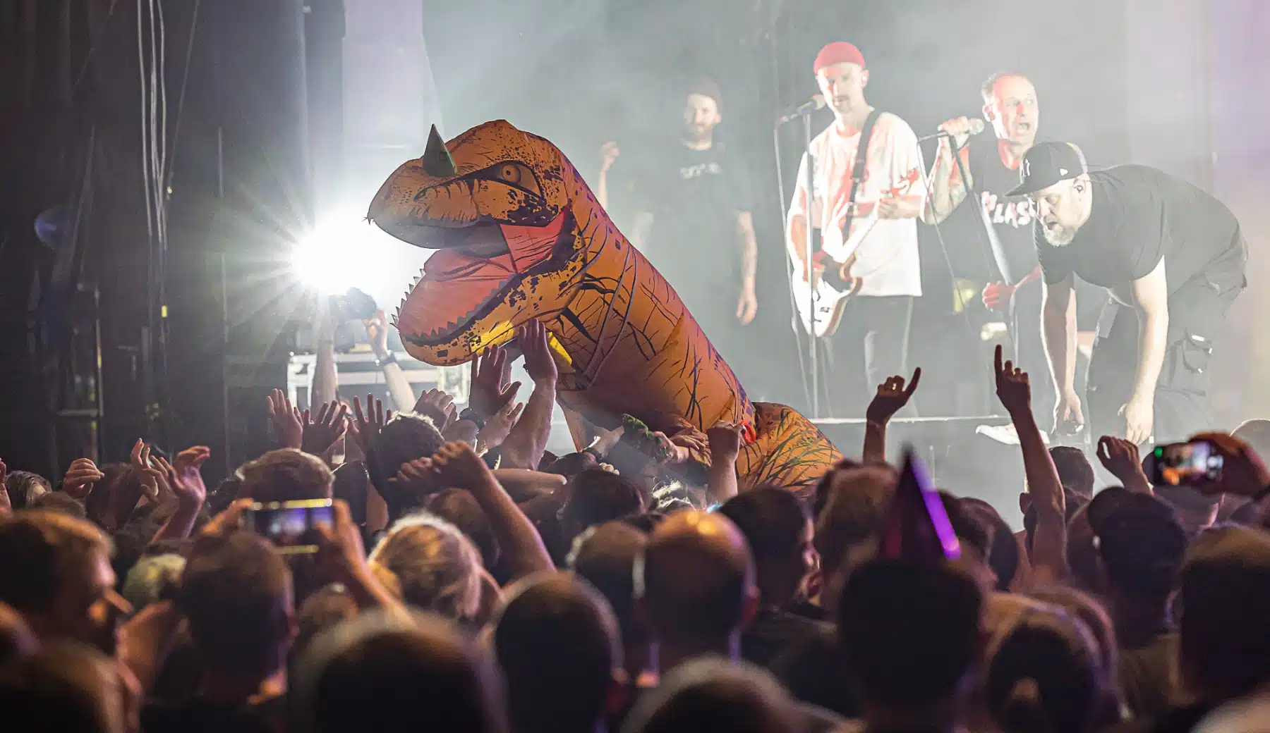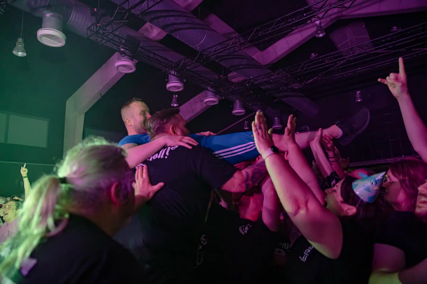Bei der Abendshow ging es dann ein wenig härter zur Sache, das nun erwachsenere Publikum nutze ausgiebig die Möglichkeit auf der Menge zu surfen wenn es der aktuelle Song ermöglichte. Diesmal wurden 2 Gäste auf die Bühne eingeladen die beide verkleidet waren, einer als Banane und einer als Saurier. Sänger Ingo hatte den Wunsch mal zu sehen wie ein Saurier eine Banane frisst. Anschließend surften beide Gäste gemütlich auf dem Publikum durch die Halle. Neue Songs wie „Längst noch nicht vorbei“ , „Hey Ralph“ oder „Kometen“ kamen alle sehr gut beim Publikum an. Die Stimmung war bei beiden ausverkauften Shows jederzeit großartig. Kann man einer Band mehr Respekt entgegenbringen als 2 Shows an einem Tag möglich zu machen? Laut Sänger Ingo würde sowas nur in Wiesbaden funktionieren, deshalb kommen die Donots immer wieder gerne zurück um die besten Shows ihrer Karriere im Wiesbadener Schlachthof zu spielen.