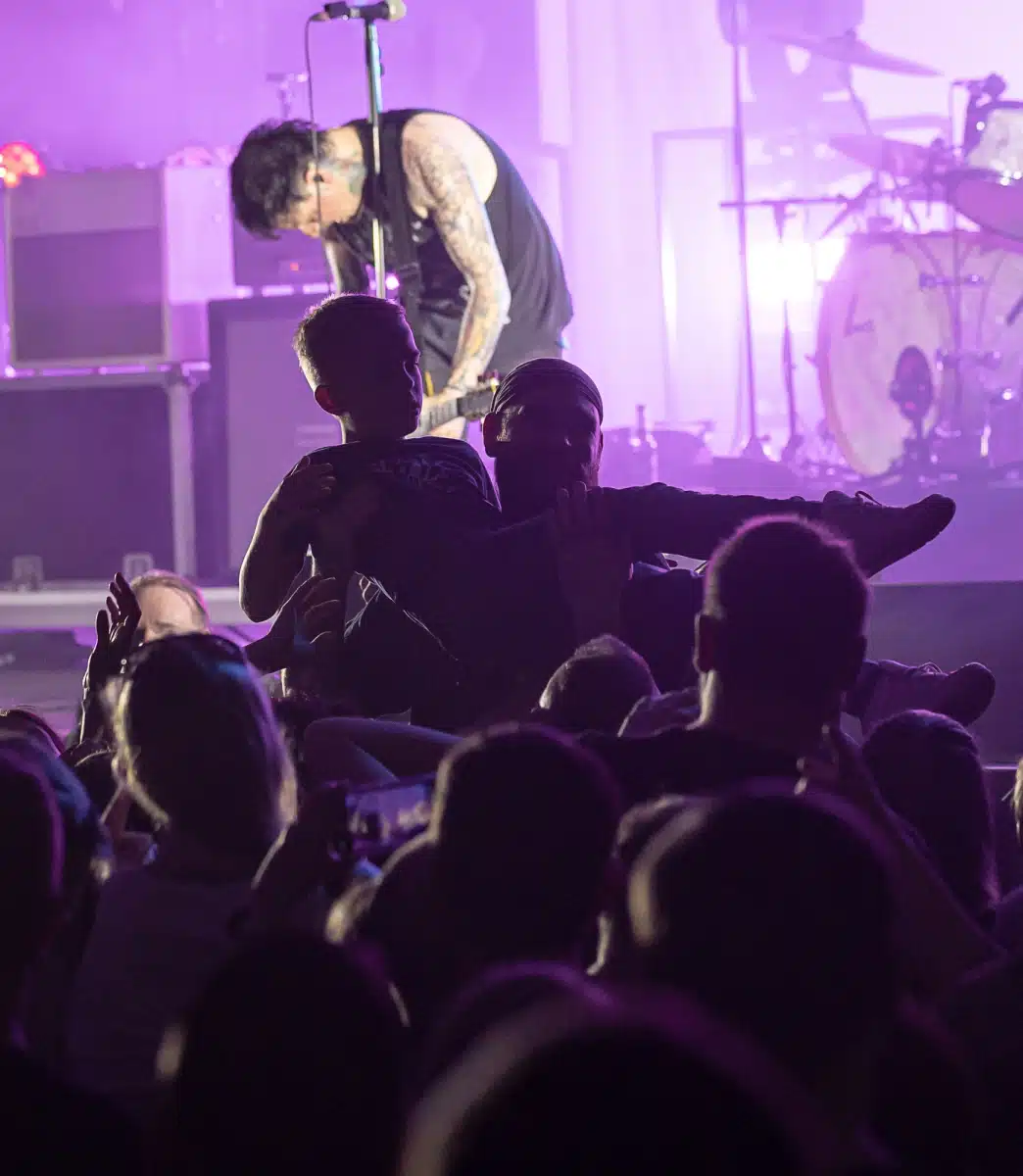 Das Mittagskonzert der Donots bestach vorallem durch das teilweise recht junge Publikum, man konnte fast denken es wäre ein reines Familienfest. Doch der Stimmung und der Aktion tat dies keinen Abbruch. Selbst die jüngsten Teilnehmer gaben alles und scheuten sich nicht auch mal auf der Menge zu surfen. Sänger Ingo war begeistert, er hatte vorher noch nie Crowdsurfer unter 10 Jahren gesehen. Deshalb lud er alle Kinder in der Halle auf die Bühne ein um mit der Band gemeinsam ein Lied zu singen und zu tanzen. Dieses Erlebnis werden weder Band noch Kinder so schnell vergessen, so etwas Einmaliges sucht man sonst vergebens, wahrscheinlich alleine dadurch dass in der Regel der Anteil Kinder eher geringer ist. Ansonsten war auch die Mittagsshow eine würdige Donots Show, man mußte jederzeit mit etwas Unerwartetem rechnen. Sei es ein Besuch von Sänger Ingo im einem Circle Pit oder einem Bad in der Menge. Musikalisch stand natürlich bei beiden Shows das aktuelle Album „Heute ist ein guter Tag“ im Fokus, die alten Klassiker wurden natürlich nicht vergessen. So mußte keiner auf Songs wie „Stop the clocks“ , „So long“ , „Whatever happened to the 80s“ oder „Calling“ verzichten.