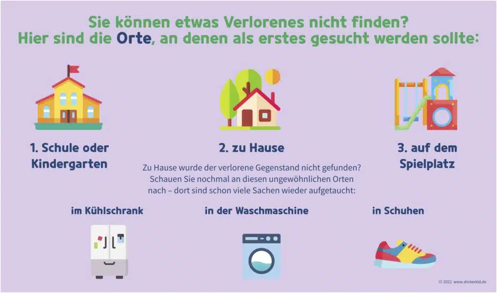 Die Schule ist der Ort, an dem Kinder am häufigsten Sachen verlieren. Das haben 43 Prozent der Eltern in der Stickerkid Umfrage angegeben. Dabei handelt es sich meistens um Alltagsgegenstände wie Mützen, Handschuhe, Trinkflaschen und Brotdosen. Um diese Dinge wiederzufinden, investieren Eltern rund 33 Minuten pro Woche in die Suche. Die Befragten gaben gleichzeitig an, dass sie durch die Suche mehr als die Hälfte der verlorenen Gegenstände wiederfinden. Dennoch zahlen Eltern jährlich zwischen 20 und 50 Euro, um verlorene Sachen zu ersetzen. 64 Prozent sorgen direkt vor und haben zusätzliche Stifte, Radiergummis, Wasserflaschen oder Brotdosen zu Hause.