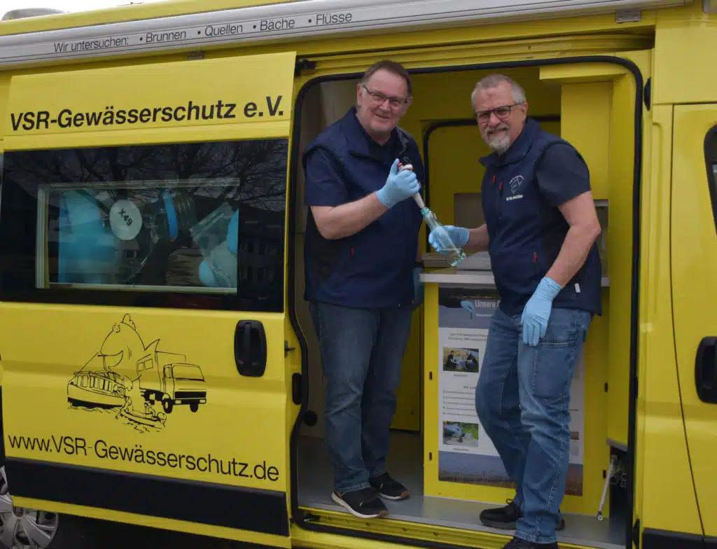 Dipl.-Phys. Harald Gülzow und der Ehrenamtler Arno Mittelmeyer führen die Grunduntersuchung von Nitrat-, Säure- und Salzgehalt im Labormobil gegen eine geringe Beteiligung von 12 € durch. Nachdem das Analyseergebnis vorliegt, beraten die Gewässerexperten was die festgestellte Belastung für die Nutzung des Wassers bedeutet. Gesundheitsrisiken durch verschmutztes Grundwasser können so vermieden werden. Gegen eine Kostenbeteiligung werden weitere Parameter untersucht. Die Brunnenbesitzer bekommen die Ergebnisse, ob das Wasser zum Trinken, zum Gemüse gießen, zum Teich oder Planschbecken befüllen geeignet ist, in einem ausführlichen Gutachten mit der Post zugesandt. Außerdem beantwortet das Team vom VSR-Gewässerschutz jeden Freitag von 10 und 13 Uhr unter der Rufnummer 02831 9763342 Fragen zu den Gutachten.