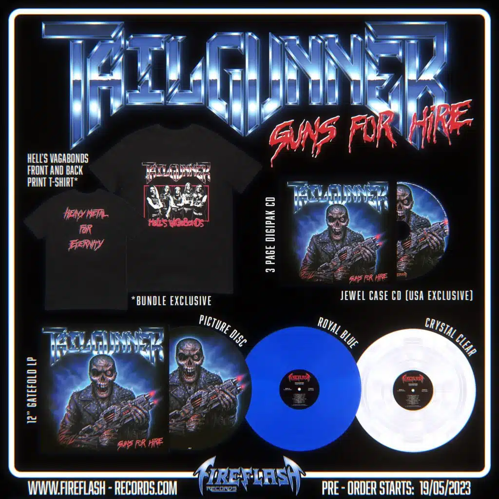 Mehr InformationenHeute startet der Vorverkauf zu dem neuen Studioalbum der britischen Shootingstars TAILGUNNER, „Guns For Hire“, das am 14. Juli 2023 über Fireflash Records erscheinen wird. Das Album gibt es in 3 verschiedenen Vinyl-Editionen (royal blue, crystal clear und als picture disc), limitiert auf je 500 Exemplare, sowie als CD-Digipak und digital. Im Atomic Fire Records Webshop könnt ihr jedes Format zusammen mit einem exklusiven Bundle-Shirt bestellen.
