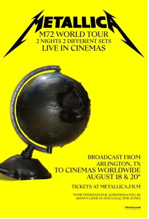 Tickets are on sale now for Metallica: M72 World Tour Live From Arlington, TX – A Two Night Event at metallica.film. Presented in cinemas worldwide by Trafalgar Releasing, this unprecedented global theatrical event brings Metallica’s M72 World Tour live from AT&T Stadium in Arlington, TX, to the big screen live in cinemas in the U.S., Bolivia, Canada, Chile, Colombia, CostaRica, Ecuador, El Salvador, Guatemala, Honduras, Mexico, Nicaragua, Panama,Paraguay, Peru, and Venezuela on Friday, August 18 and Sunday, August 20 at9:15 p.m. EDT / 6:15 PM PDT with encore showings on August 19 (Friday’s concert) and August 21 (Sunday’s concert) at 9:00 p.m. EDT / 6:00 p.m. PDT. Movie audiences in all other exhibiting countries, including throughout Europe,Latin America, Asia, Africa, the Middle East, and Oceania, will view the concerts on August 19 (Friday’s concert) and August 21 (Sunday’s concert) as best suited for local time zones. For the most detailed exhibition times and dates by location, visit metallica.film.
