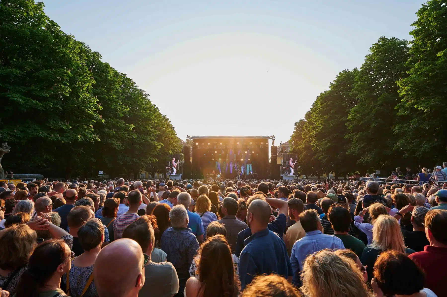 Vor wunderschöner Kulisse und bei sommerlichen Temperaturen kamen ca. 6.500 Fans in den Schlossgarten. Dicht an dicht gedrängt wartete die Menge ungeduldig auf den 17-fachen Grammy Gewinner.