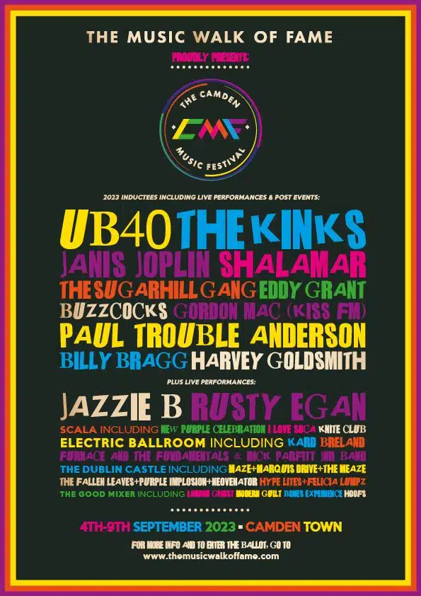 London’s prestigious Music Walk of Fame (MWOF) today reveals that it will be awarding 11 more music icons from 4th – 9th September, with a stone on the Camden based trail that honours artists and trailblazers from around the globe, from all era’s, all genres and ages. This year’s recipients will be Janis Joplin, Harvey Goldsmith CBE, UB40, Gordon Mac (Founder Of Kiss FM), Paul ‘Trouble’ Anderson, The Sugarhill Gang, Eddy Grant, Buzzcocks, Billy Bragg, Shalamar and The Kinks.