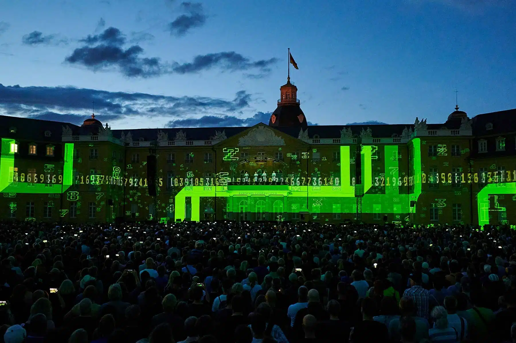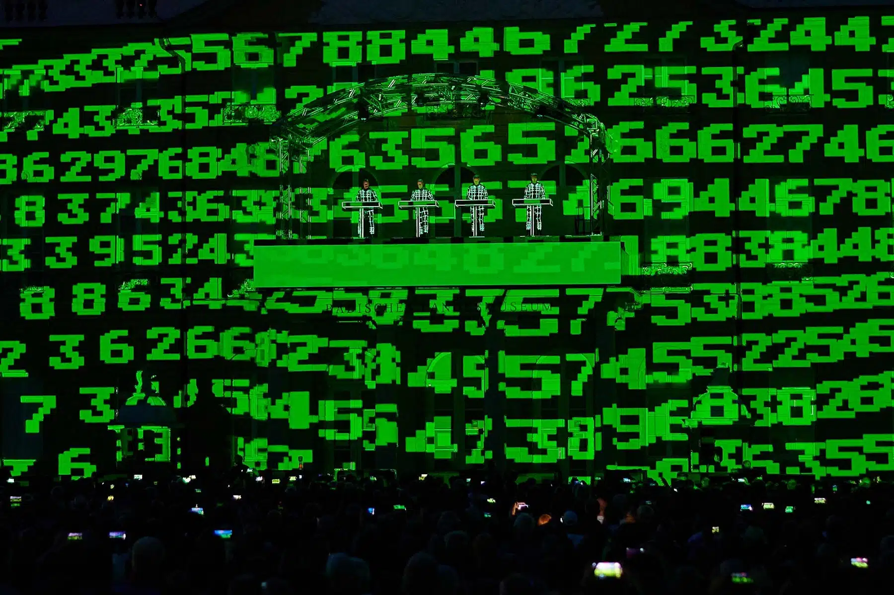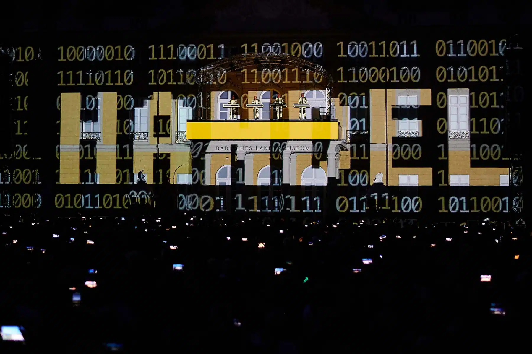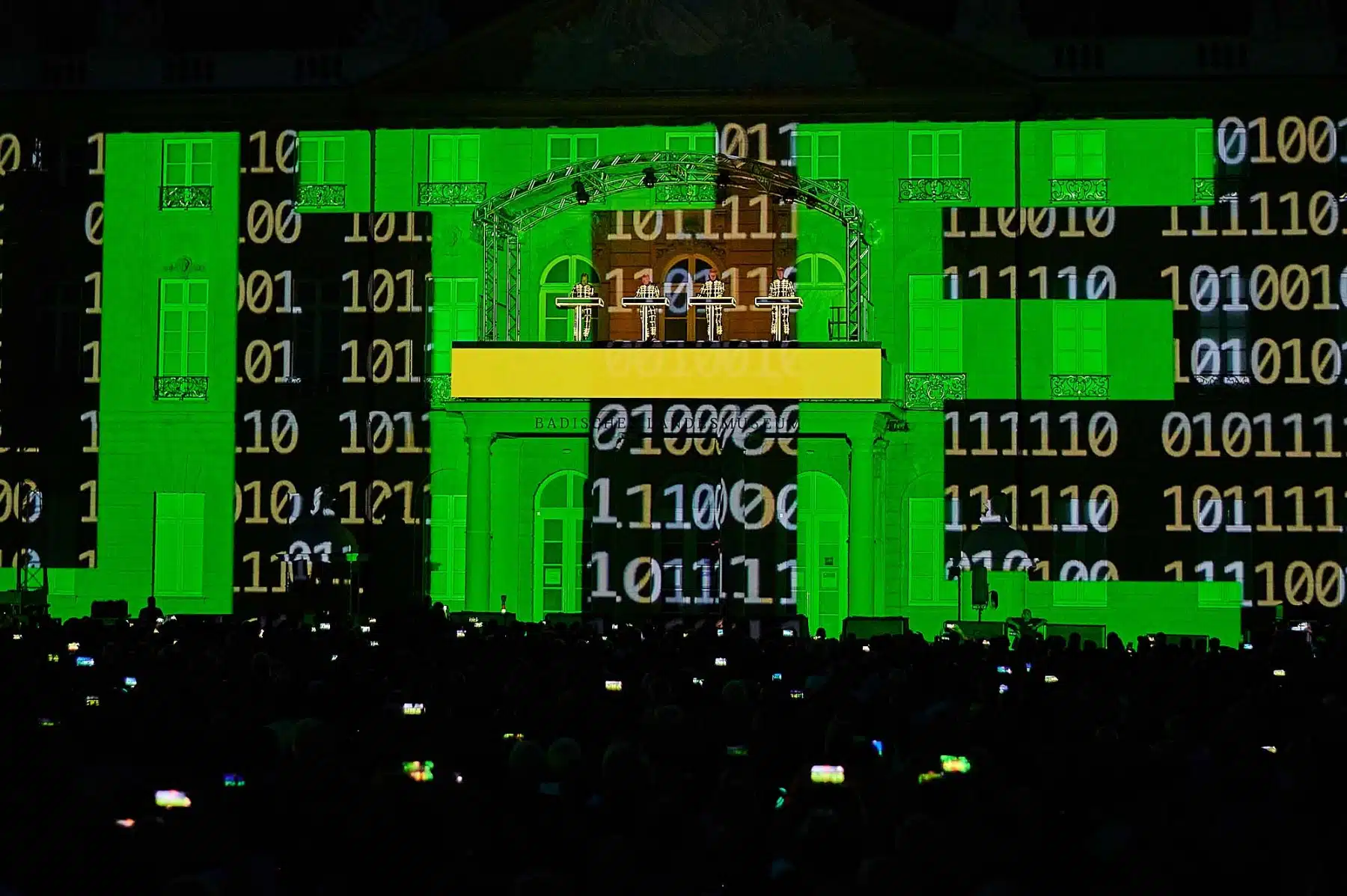 Inmitten wabernder Formen, auf der Autobahn, zwischen Radfahrern der Tour de France oder als Teil eines riesigen Rauschiffs, standen die vier Mitglieder von KRAFTWERK in illuminierten, blinkenden Anzügen auf dem Balkon des Karlsruher Schlosses. Neongrüne Zahlen schwirrten um sie herum und Schriftzüge zur computerverzerrter Stimme „Wir sind die Roboter“ unterstrichen ihren unverwechselbaren Elektro-Sound. Überdimensionale gelbe Atom-Symbole erinnerten an die Atomkatastrophen der Vergangenheit und spärlich bekleidete Models tanzten über die Fassade des Karlsruher Schlosses. Ein Fest für Ohren und Augen.