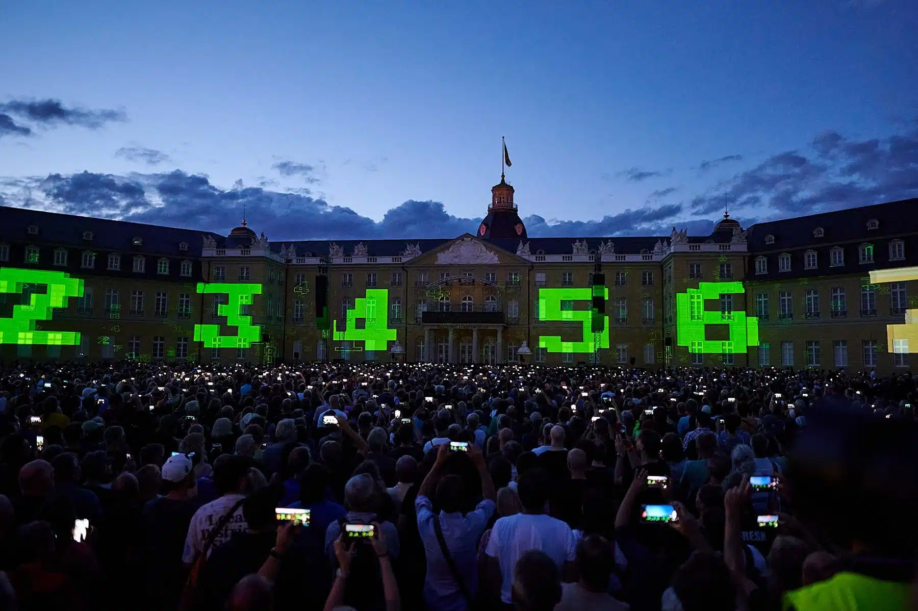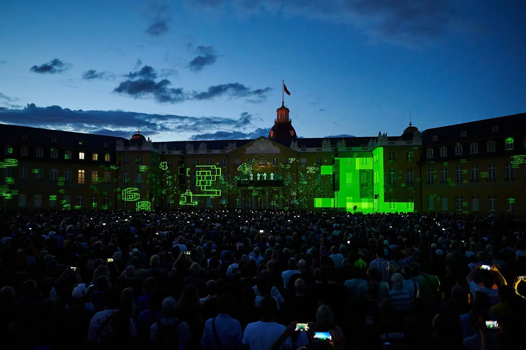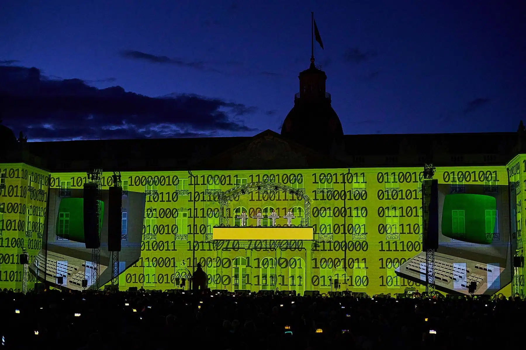 Inmitten wabernder Formen, auf der Autobahn, zwischen Radfahrern der Tour de France oder als Teil eines riesigen Rauschiffs, standen die vier Mitglieder von KRAFTWERK in illuminierten, blinkenden Anzügen auf dem Balkon des Karlsruher Schlosses. Neongrüne Zahlen schwirrten um sie herum und Schriftzüge zur computerverzerrter Stimme „Wir sind die Roboter“ unterstrichen ihren unverwechselbaren Elektro-Sound. Überdimensionale gelbe Atom-Symbole erinnerten an die Atomkatastrophen der Vergangenheit und spärlich bekleidete Models tanzten über die Fassade des Karlsruher Schlosses. Ein Fest für Ohren und Augen.
