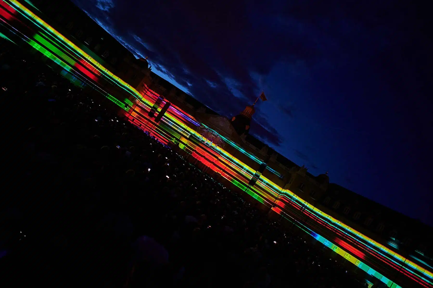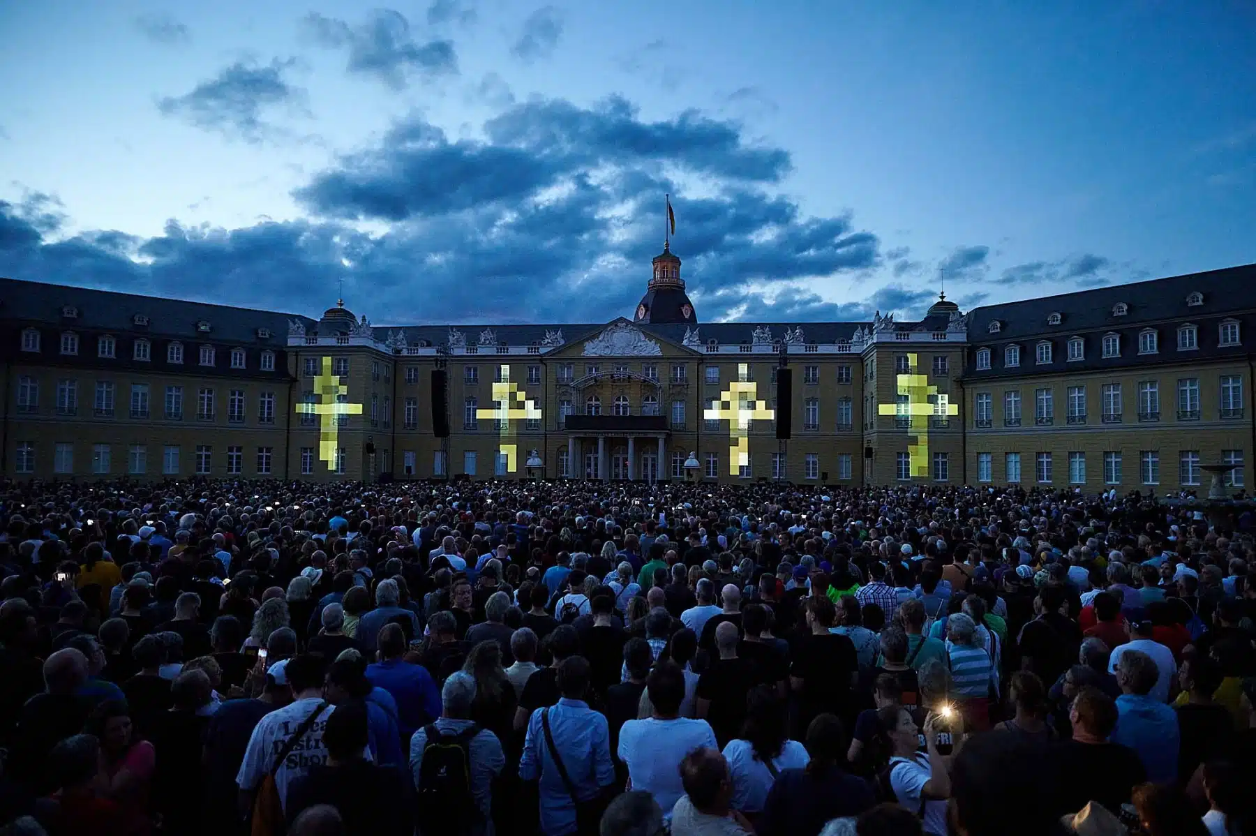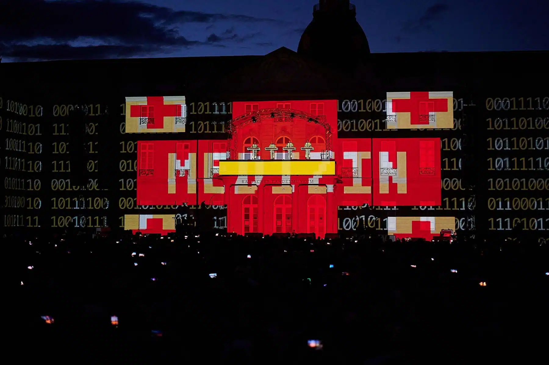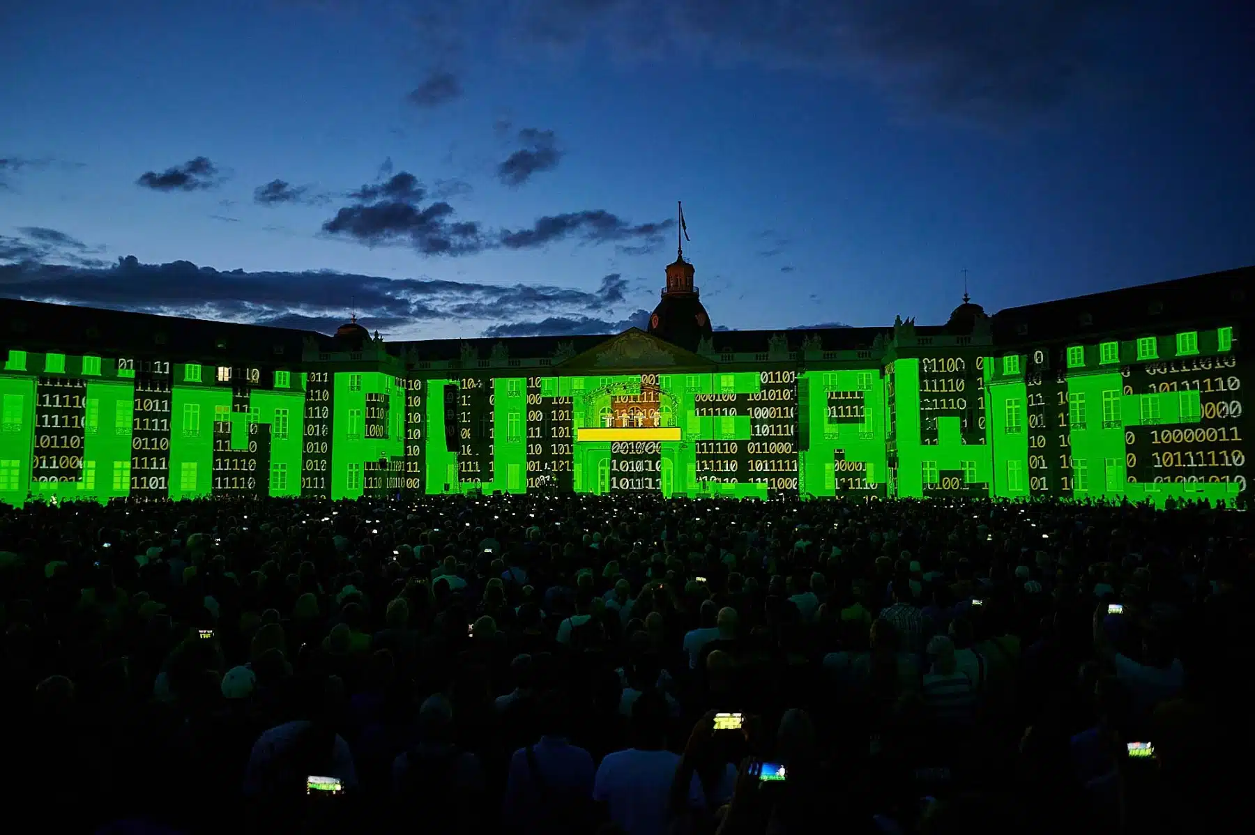 Inmitten wabernder Formen, auf der Autobahn, zwischen Radfahrern der Tour de France oder als Teil eines riesigen Rauschiffs, standen die vier Mitglieder von KRAFTWERK in illuminierten, blinkenden Anzügen auf dem Balkon des Karlsruher Schlosses. Neongrüne Zahlen schwirrten um sie herum und Schriftzüge zur computerverzerrter Stimme „Wir sind die Roboter“ unterstrichen ihren unverwechselbaren Elektro-Sound. Überdimensionale gelbe Atom-Symbole erinnerten an die Atomkatastrophen der Vergangenheit und spärlich bekleidete Models tanzten über die Fassade des Karlsruher Schlosses. Ein Fest für Ohren und Augen.
