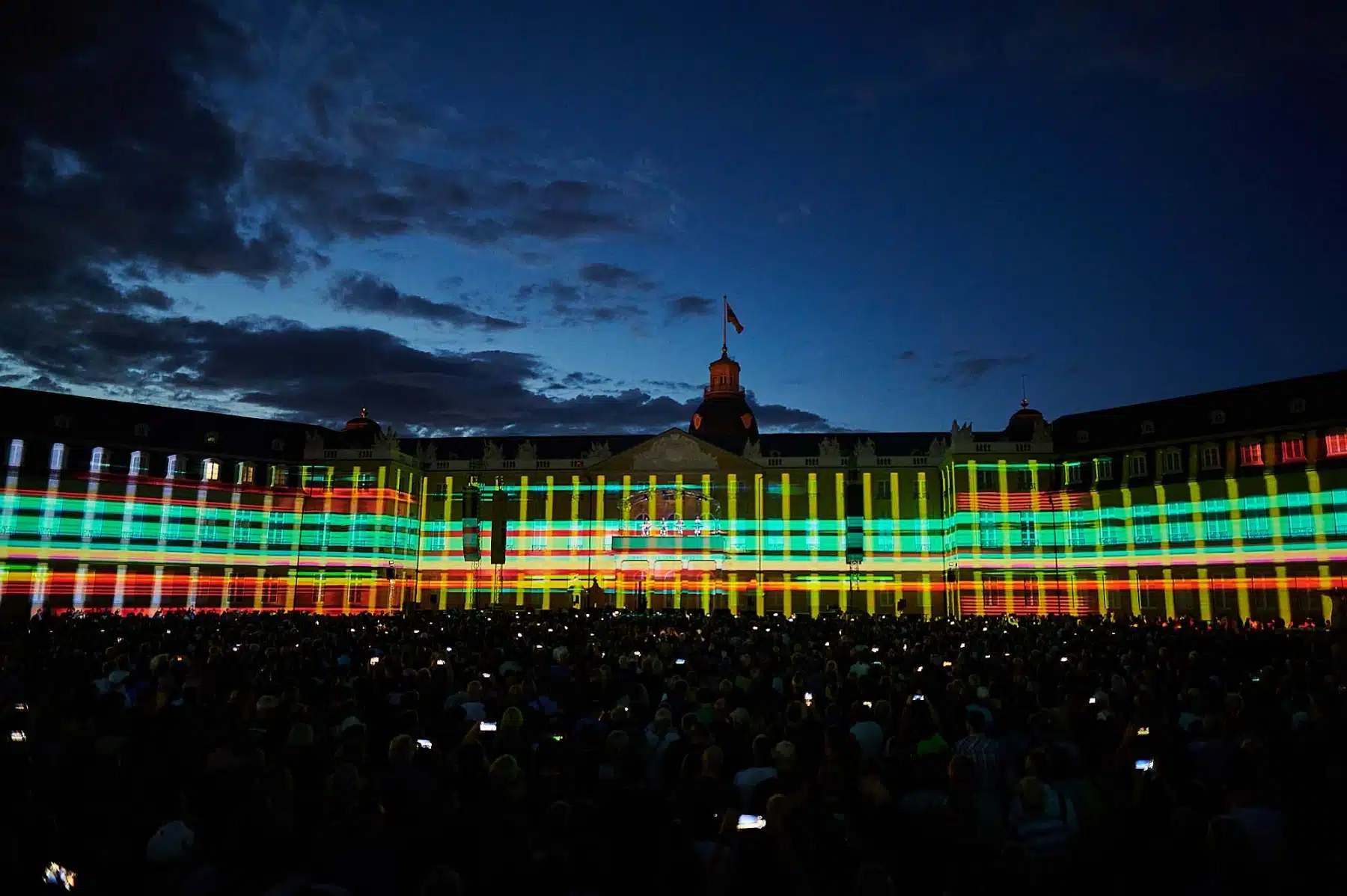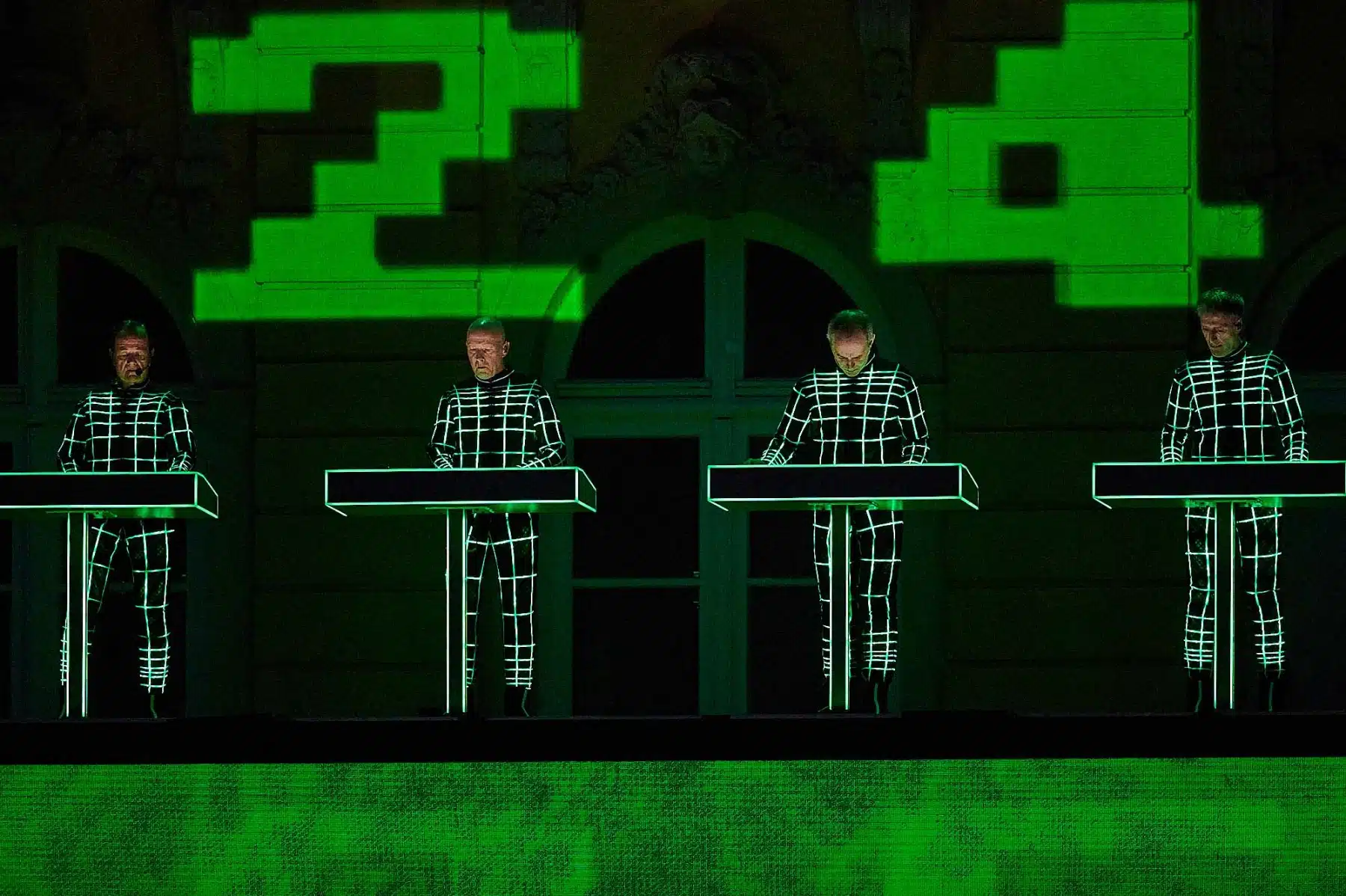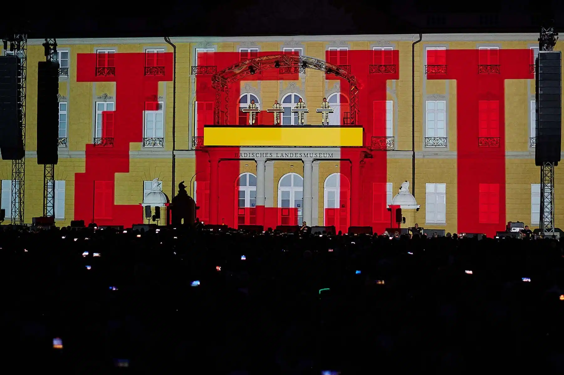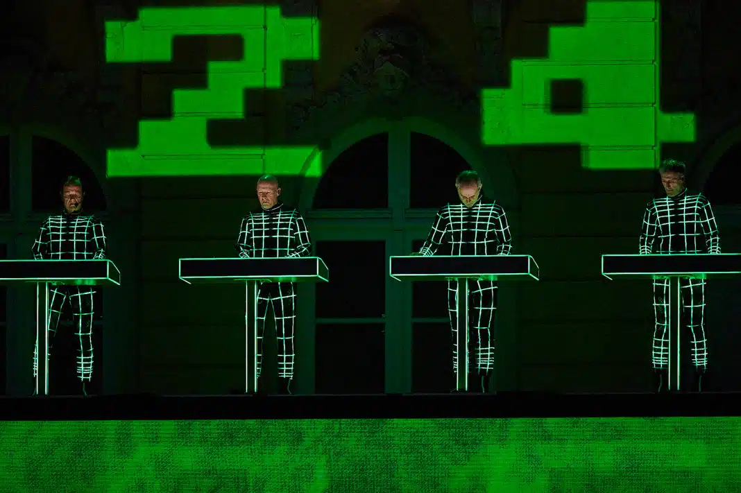 Im Rahmen der Schlosslichtspiele, die vom 16.08. bis 17.09 stattfinden, gaben sich die vier Musiker rund um Gründungsmitglied Ralf Hütter in Karlsruhe die Ehre. 16 Hochleistungsbeamer und die 170 m lange Front des Barockschlosses boten gerade genug Projektionsfläche für eine gigantische Light-Show, die ihres Gleichen sucht.