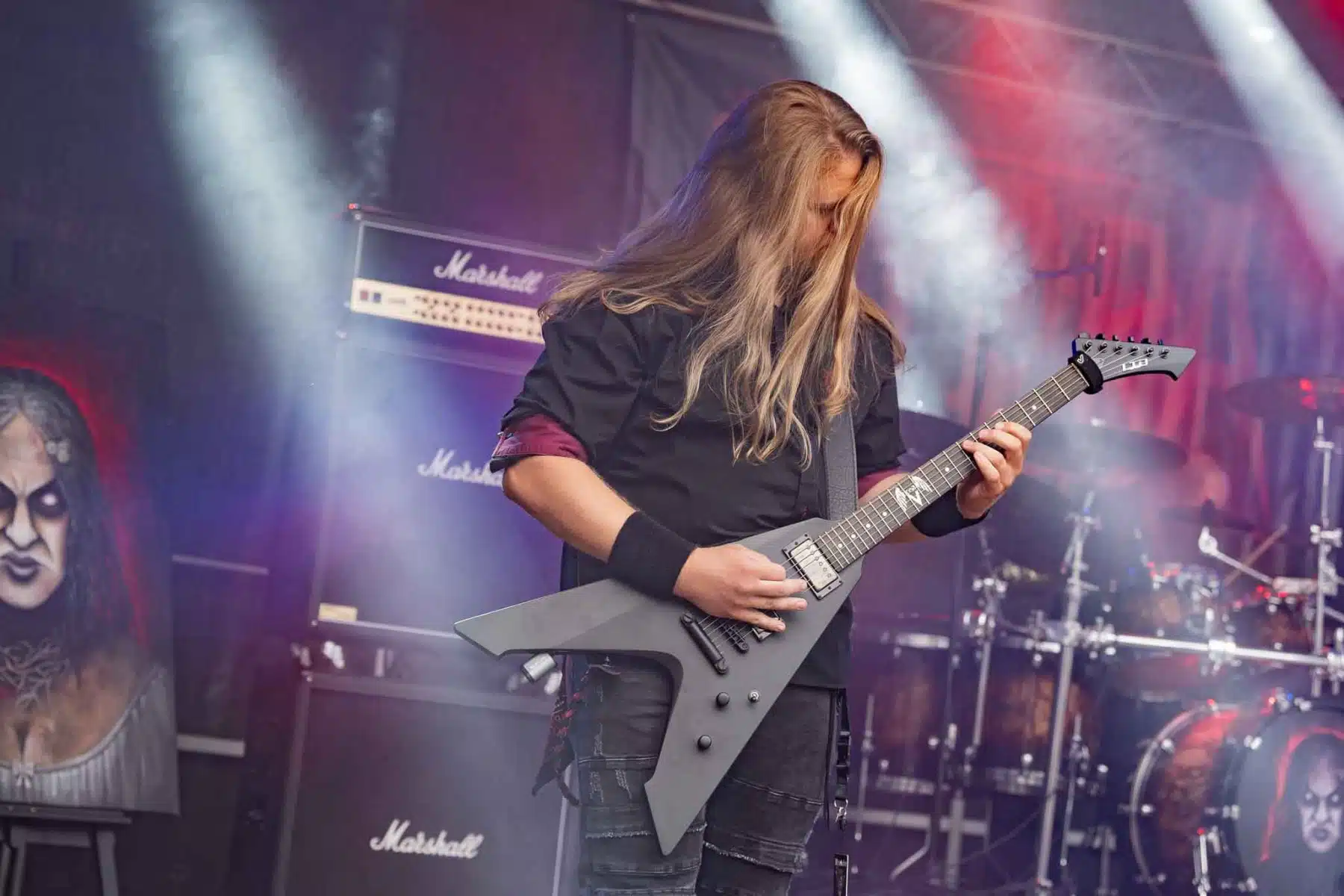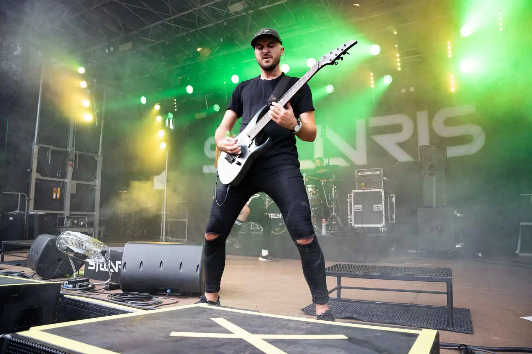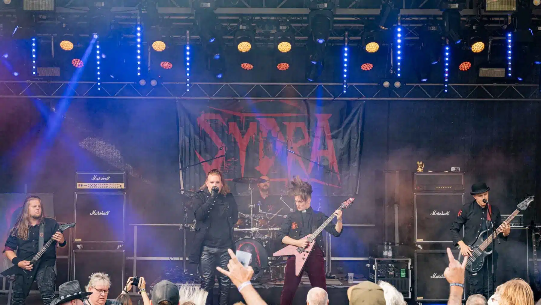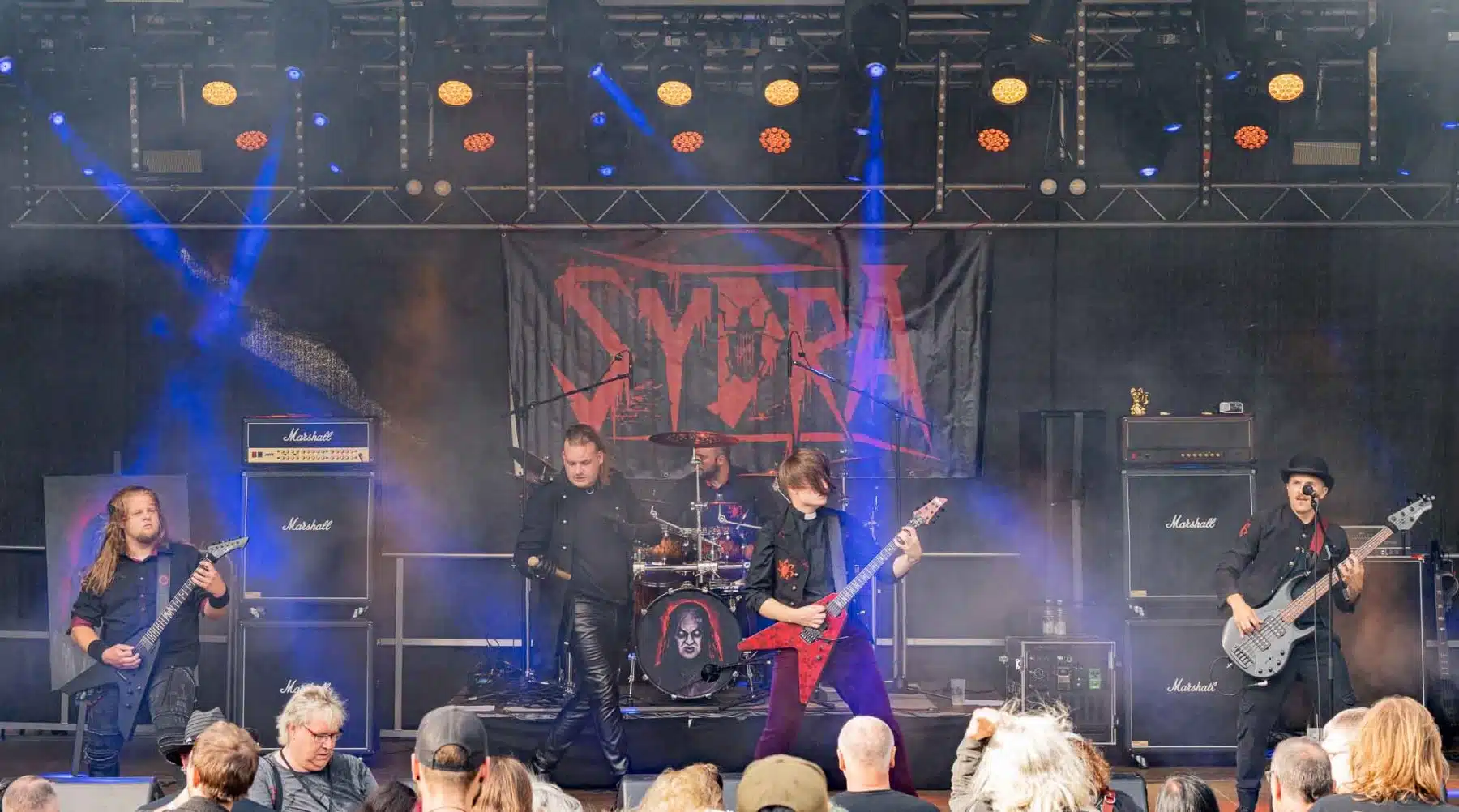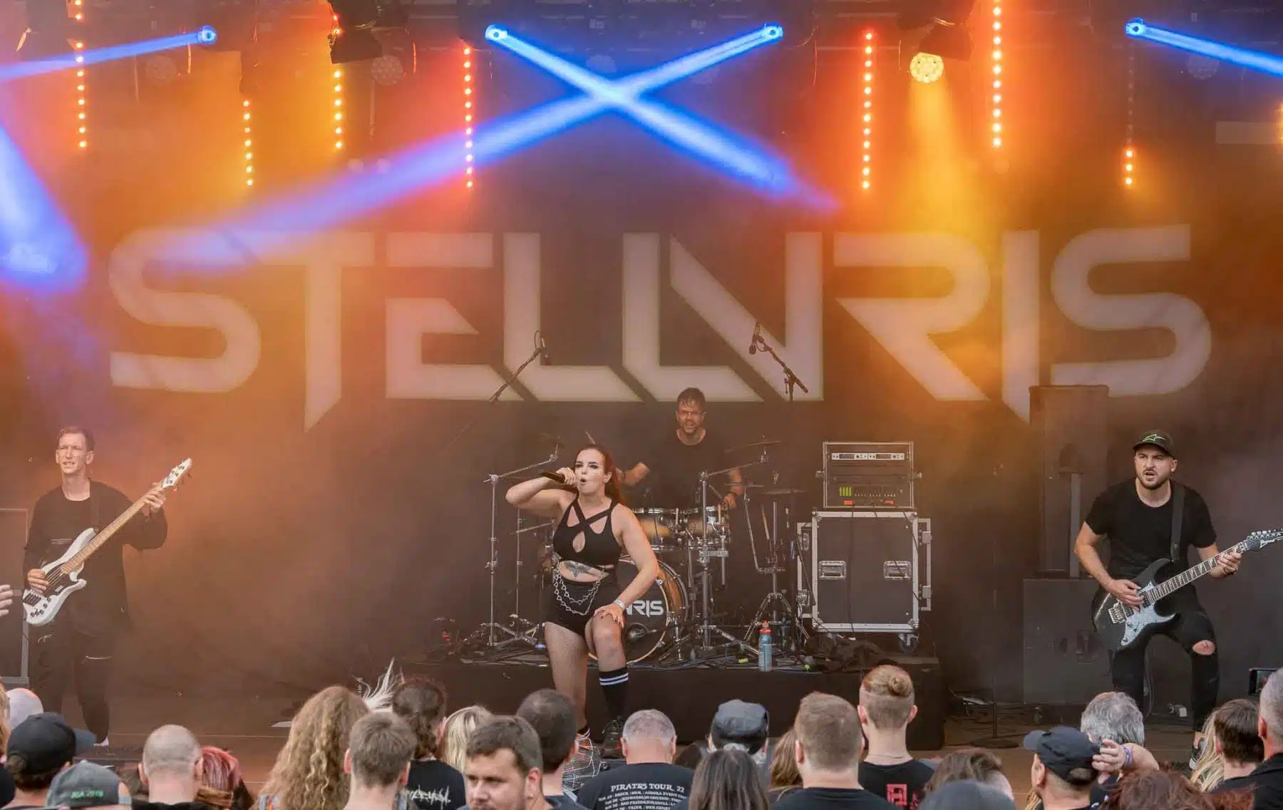 Um 17 Uhr wurden die Tore geöffnet und kurze Zeit später durften Sydra ihren ersten großen Festival Auftritt beginnen. Die Freiburger Band spielte eine Mischung aus Thrash- und Deathmetal und konnte von Anfang an einige der Besucher vor der Bühne mitreißen. Bei dem (noch) schonen Wetter wurden natürlich auch die vielen Getränke und Essensstände besucht – und auch auf dem Campingplatz ließen es sich einige Besucher gutgehen. Nach einer großzügigen Spielzeit von 40Minuten, was für eine Opener Band echt großartig ist, ging die Party erst so richtig los. Denn die tschechische Band Stellvris gab von Sekunde eins an direkt Vollgas. Mit Songs, wie „Avatar“ oder auch dem neusten Werk „Letting Go“ war von ruhig bis laut und schnell alles dabei. Frontfrau Nicol machte einen wirklich tollen Job am Gesang, besonders ihre Growls brachten den ein oder anderen Besucher zum Staunen. So war es nicht verwunderlich, dass die Band weit über zwei Stunden lang am Merchandise Stand Autogramme verteilte und Fotos mit den vielen, neu gewonnenen Fans machte. Die Musiker sind ein perfekt eingespieltes Team auf der Bühne und waren so happy, dass sie das Grinsen nicht mehr aus dem Gesicht bekamen.