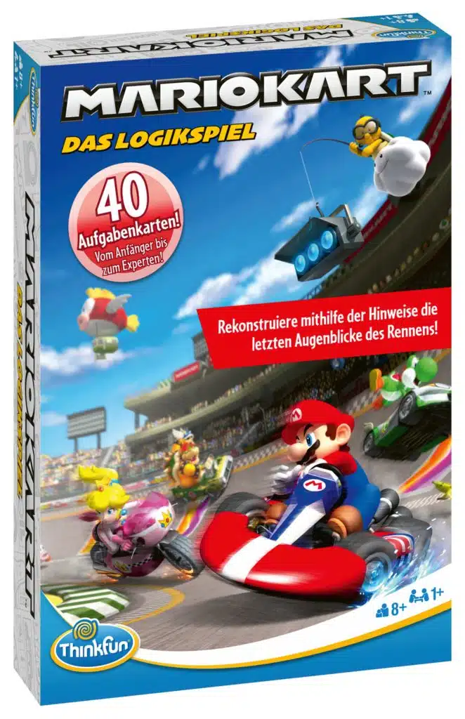 Mario, Luigi, Peach, Bowser und Yoshi rasen zur Ziellinie, aber wer liegt in Führung? Wer nimmt den Siegerpokal nach Hause und wer scheitert am Grünen Panzer? Das müssen die Spieler herausfinden. Auf die Plätze, fertig los! In 40 verschiedenen Aufgaben werden Einsteiger wie auch Experten herausgefordert. Geschickt kombinieren sie die verschiedenen Hinweise auf den Aufgabenkarten so miteinander, dass die Charaktere an der richtigen Position auf der Rennstrecke platziert werden.