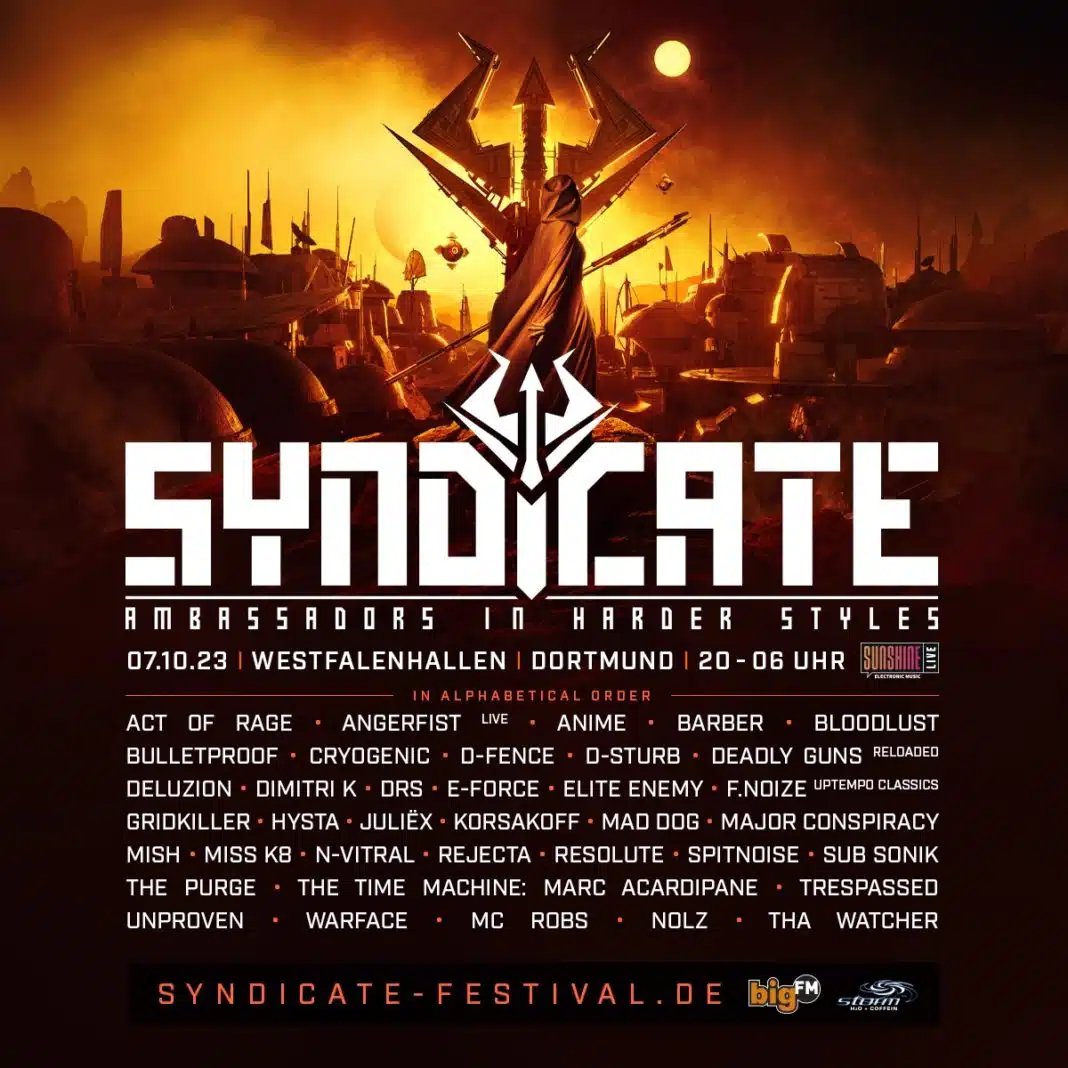 Am 07.10. steht mit SYNDICATE die härteste Nacht des Jahres an. Das größte deutsche Festival der härteren elektronischen Musik feiert seine 15. Ausgabe und über 20.000 Besucher:innen werden hierzu in den Dortmunder Westfalenhallen erwartet. An den Decks der drei Floors stehen über 30 internationale DJs und LiveActs. Mit dabei sind internationale Stars der Szene wie Angerfist, Miss K8, AniMe, Mad Dog, DRS, Deadly Guns RELOADED, Warface und Act of Rage.