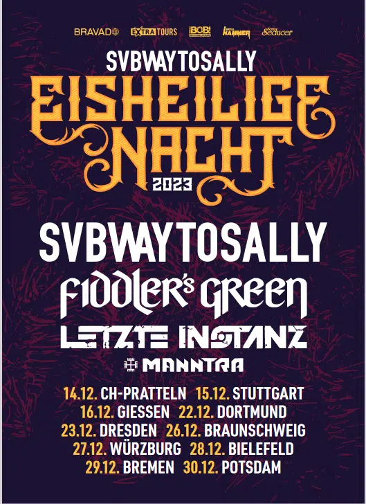 Mehr InformationenIm Dezember 2023, da sind sich alle Beteiligten sicher, wird dieser Drahtseilakt der Normalität gewichen sein. Die EISHEILIGE NACHT wird mit einem Ensemble der Allstars der vergangenen 12 Festivals glänzen, denn neben SVBWAY TO SALLY werden FIDDLERS’S GREEN und die LETZTE INSTANZ aufspielen. Den Abend eröffnen die kroatischen Newcomer MANNTRA. SVBWAY TO SALLY haben heuer ein brandneues und von der Kritik gefeiertes Album am Start, sodass dieser Abend ein zügelloses Vergnügen verspricht. Also: „Leinen los und volle Fahrt voraus!“ Die traditionelle Party zum Jahresabschluss geht in die nächste Runde und SVBWAY TO SALLY freuen sich, mit allen Fans und lieb gewonnen Musikerkollegen das Jahr würdevoll und ausgelassen ausklingen zu lassen!
