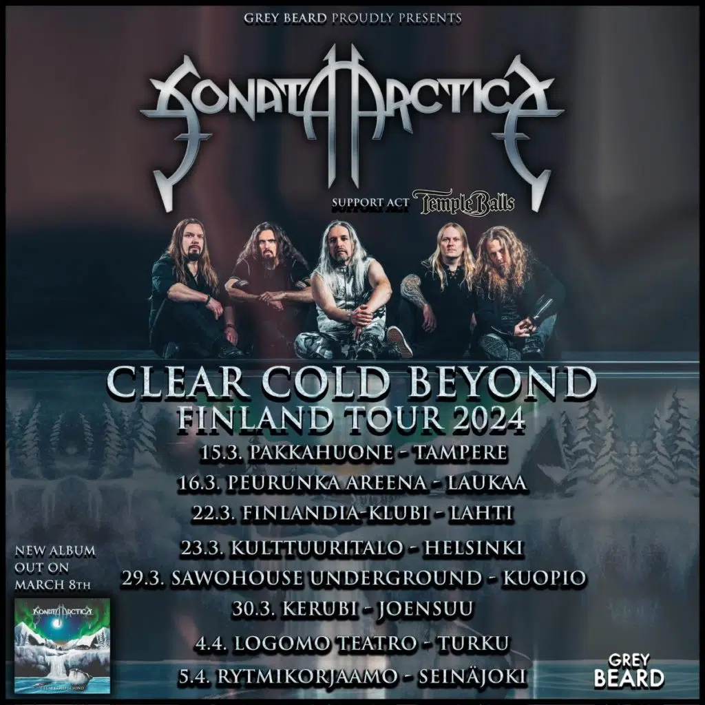 Im Rahmen der Ankündigung ihres kommenden Albums »Clear Cold Beyond« (VÖ: 08. März 2024 via Atomic Fire) ließen die finnischen Metal-Ikonnen SONATA ARCTICAbereits verlauten, dass sie das neue Material am liebsten direkt auf die Bühne(n) bringen würden. Umso besser für ihre Fans, dass das Quintett nun den ersten Abschnitt der folgenden Welttournee ankündigt. Jene erste Etappe umfasst acht Konzerte, die es im März/April kommenden Jahres durch sein Heimatland führen wird. Als Support werden bei diesen die ebenfalls aus Finnland stammenden Hardrocker TEMPLE BALLS fungieren. Weitere Einzelheiten zu den Shows findet ihr unten; Tickets sind ab sofort erhältlich!