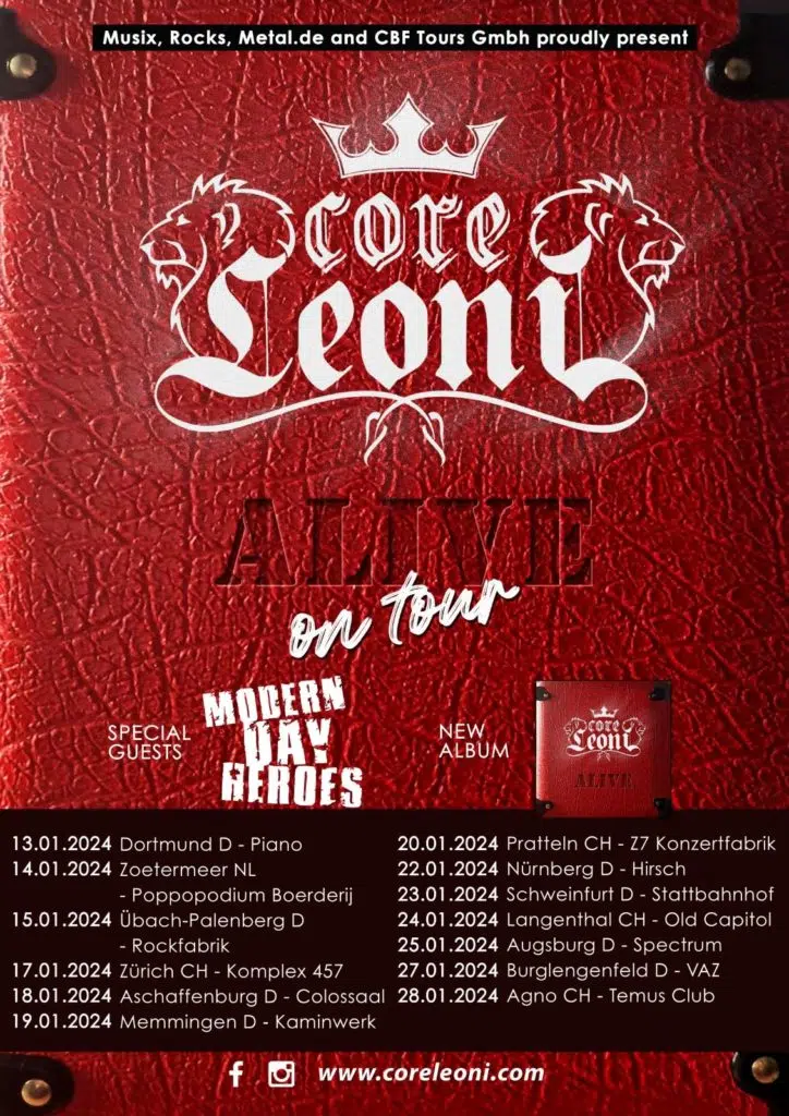 Die Hardrock-Truppe CORELEONI ist diesen Monat endlich wieder auf den hiesigen Bühnen zu sehen – passend zur Veröffentlichung ihrer aktuellen Livescheibe namens »Alive«, die am 27. Oktober 2023 auf den Markt kam. Ab morgen wird der Tourtross, ergänzt um die Special Guests MODERN DAY HEROES, vom Dortmunder Musiktheater Piano für 13 Konzerte durch Deutschland, die Niederlande, aber auch die Schweiz ziehen. Die komplette Route findet ihr unten!