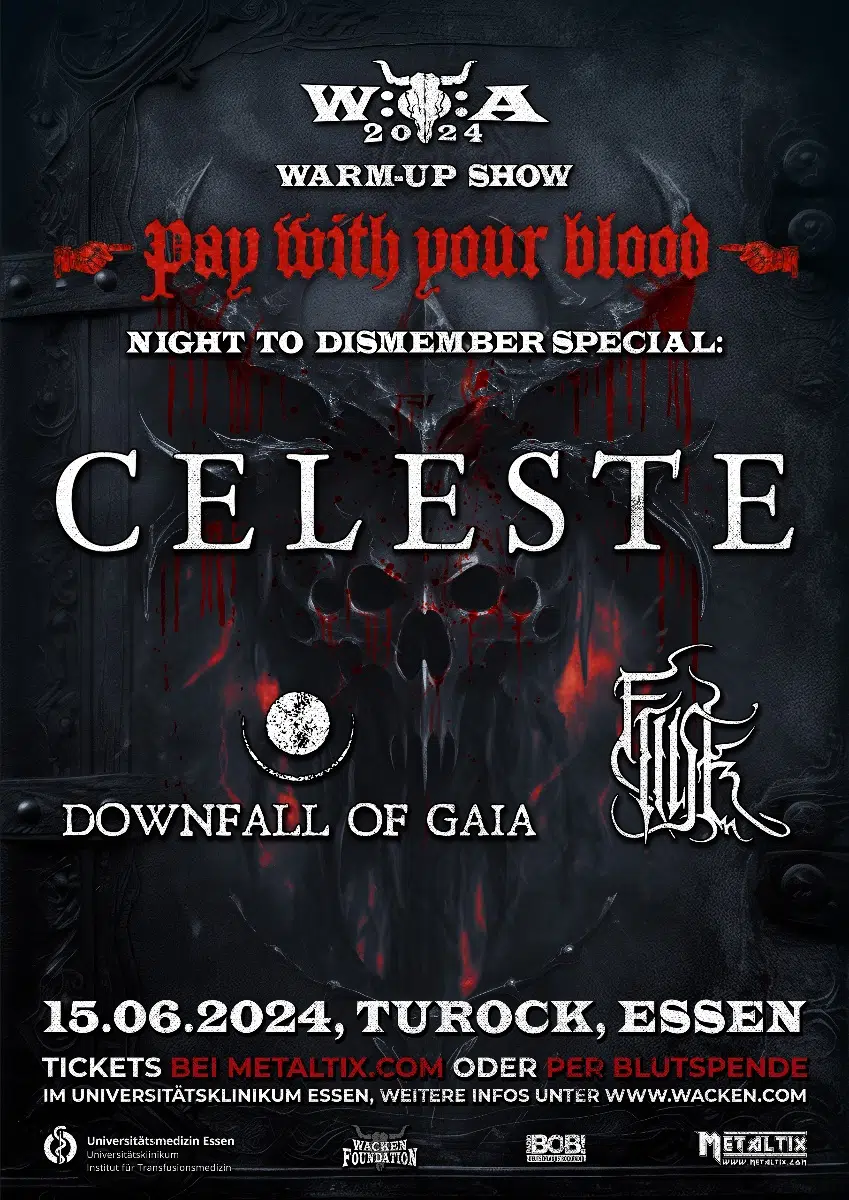 Am 15. Juni findet im Turock Essen die Night to Dismember Special Wacken Warm-Up Show mit den Bands CELESTE, DOWNFALL OF GAIA und FRIISK statt. Dabei gilt das außergewöhnliche Motto „pay with your blood“, denn: Alle, die ab dem 11. März im Universitätsklinikum Essen eine Vollblutspende abgeben, können eine Eintrittskarte anstelle der Aufwandsentschädigung erhalten (und natürlich wie gehabt ihren Stempel im W:O:A Blutspende-Pass).