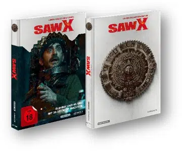 Das Collector’s Edition Mediabookvon „SAW X“ ist ein Must-Have für echte Fans des Franchises. In diesem limitierten Sammlerstück finden sich neben dem Film als Blu-ray und 4K Ultra HD auch Audiokommentare von Regisseur Kevin Greutert, Kameramann Nick Matthews und Produktionsdesigner Anthony Stanley, sowie eine 6-teilige Doku-Reihe, Featurettes und vieles mehr.