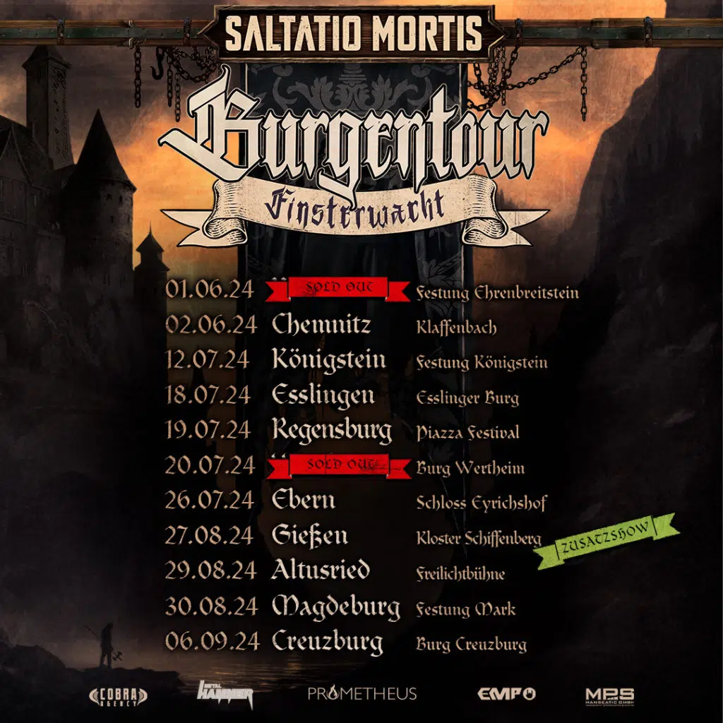 Am 1. Juni starten Saltatio Mortis ihre „FINSTERWACHT“-Burgentour durch Deutschland. Über den Sommer hinweg führt diese die Band für Konzerte zu insgesamt elf geschichtsträchtigen Orten.